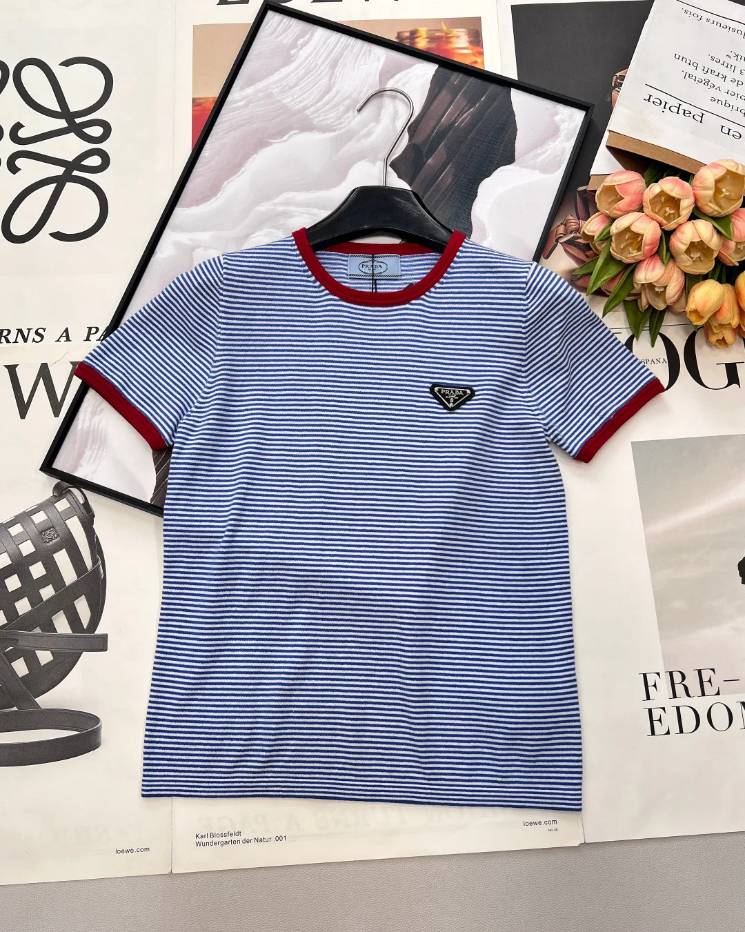 Футболка женская PRADA — модель с классическим сине-белым полосатым принтом, создающим свежий образ. Красная отделка воротника и манжет контрастирует с основным рисунком, а на груди расположен фирменный треугольный логотип. Изделие выполнено из мягкого дышащего трикотажа с аккуратной посадкой и круглым вырезом. Эта модель подходит для создания повседневных летних образов.
