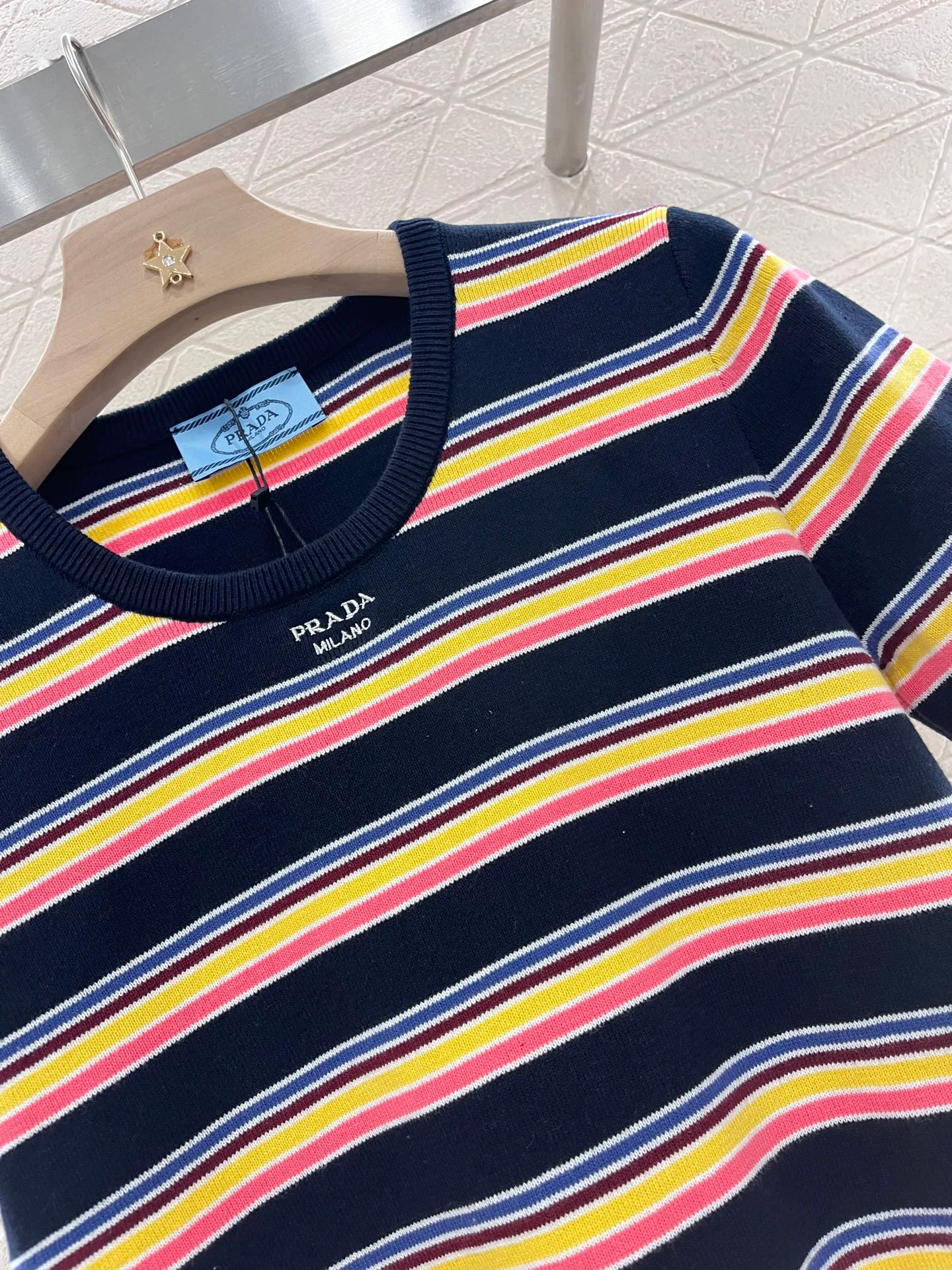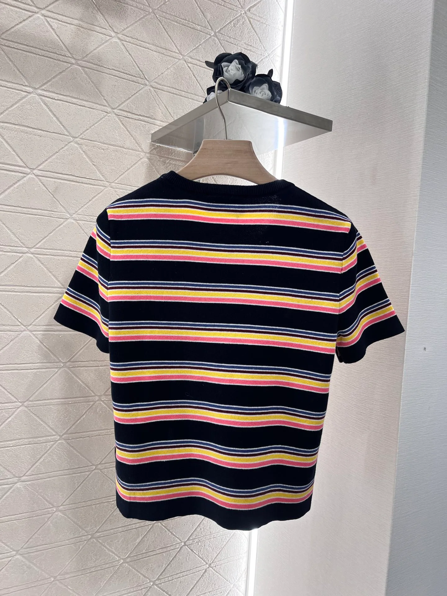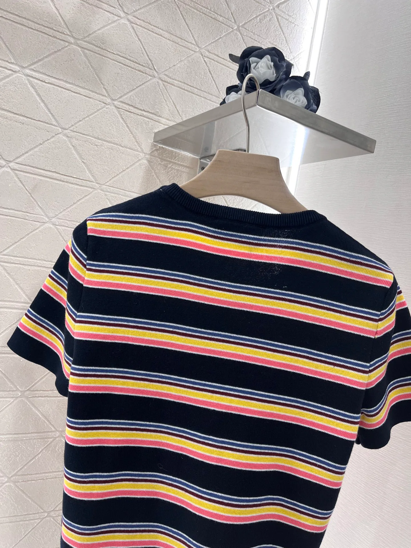 Футболка имеет круглый вырез, который элегантно открывает область шеи и плеч, создавая визуально более стройный силуэт. Умело подобранные темные окантовки в сочетании с основным полосатым рисунком добавляют текстурные акценты и создают эффект многослойности. Многоцветные полосы ткани, а также украшение в виде буквенного значка на груди придают изделию ретро-стиль, который сейчас в тренде.