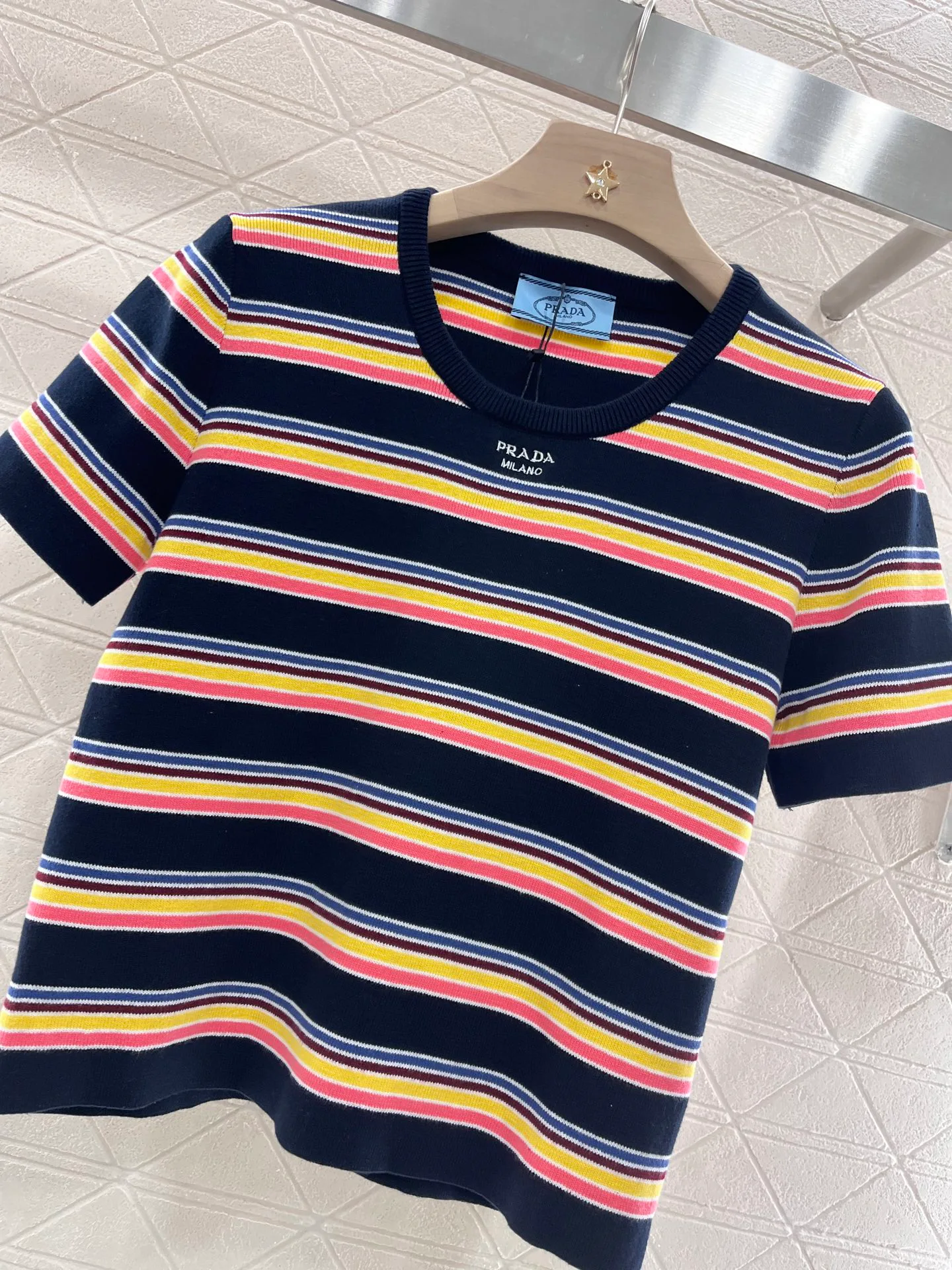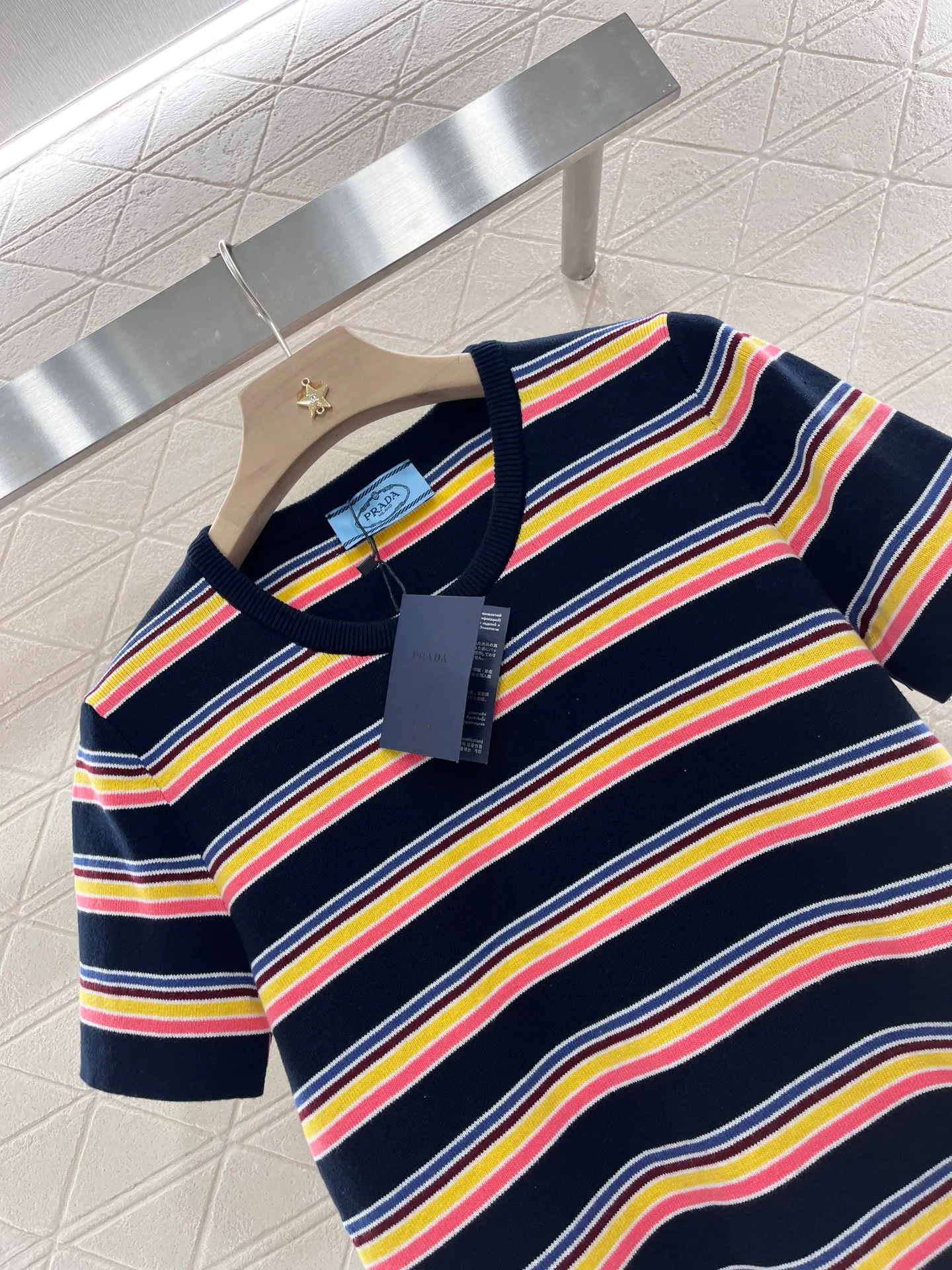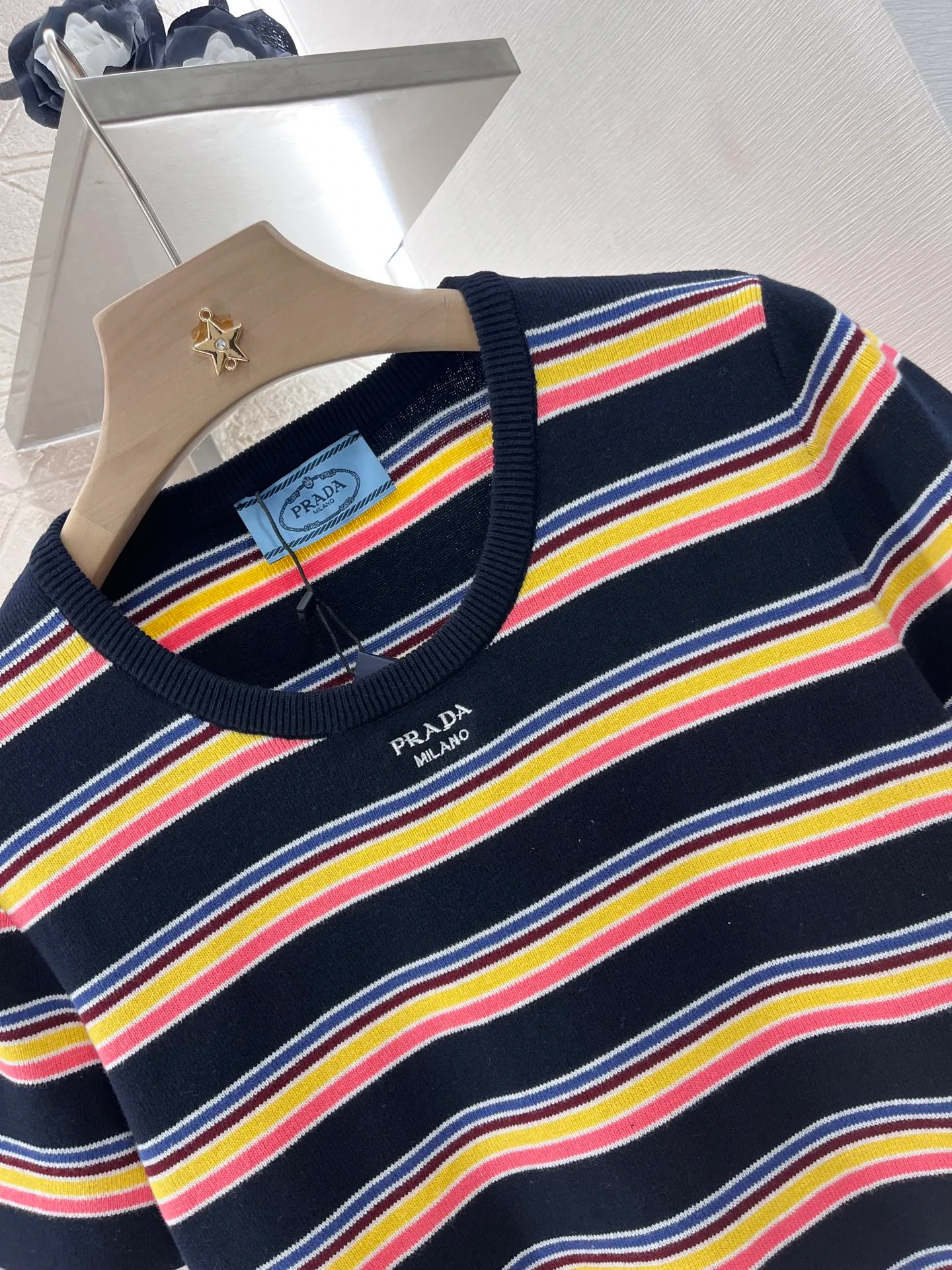 Футболка имеет круглый вырез, который элегантно открывает область шеи и плеч, создавая визуально более стройный силуэт. Умело подобранные темные окантовки в сочетании с основным полосатым рисунком добавляют текстурные акценты и создают эффект многослойности. Многоцветные полосы ткани, а также украшение в виде буквенного значка на груди придают изделию ретро-стиль, который сейчас в тренде.