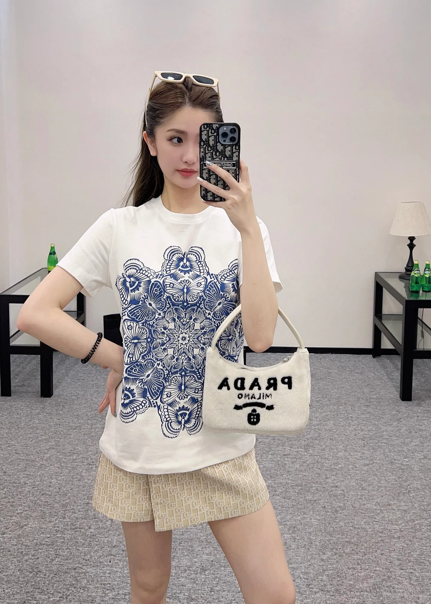 Фронтальная часть футболки украшена ярким и стильным принтом, который представляет собой сложный узор с элементами, напоминающими бабочки, выполненный в выразительном синем цвете. Этот элемент дизайна придает изделию уникальность и подчеркивает оригинальный стиль владельца.