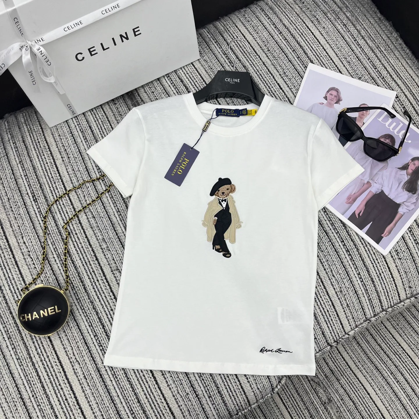 Футболка украшена объемной вышивкой с изображением медвежонка, что придает ей уникальности и интересного акцента. Дополнительный элемент — буквенный логотип, который добавляет стильности и подчеркивает бренд.
