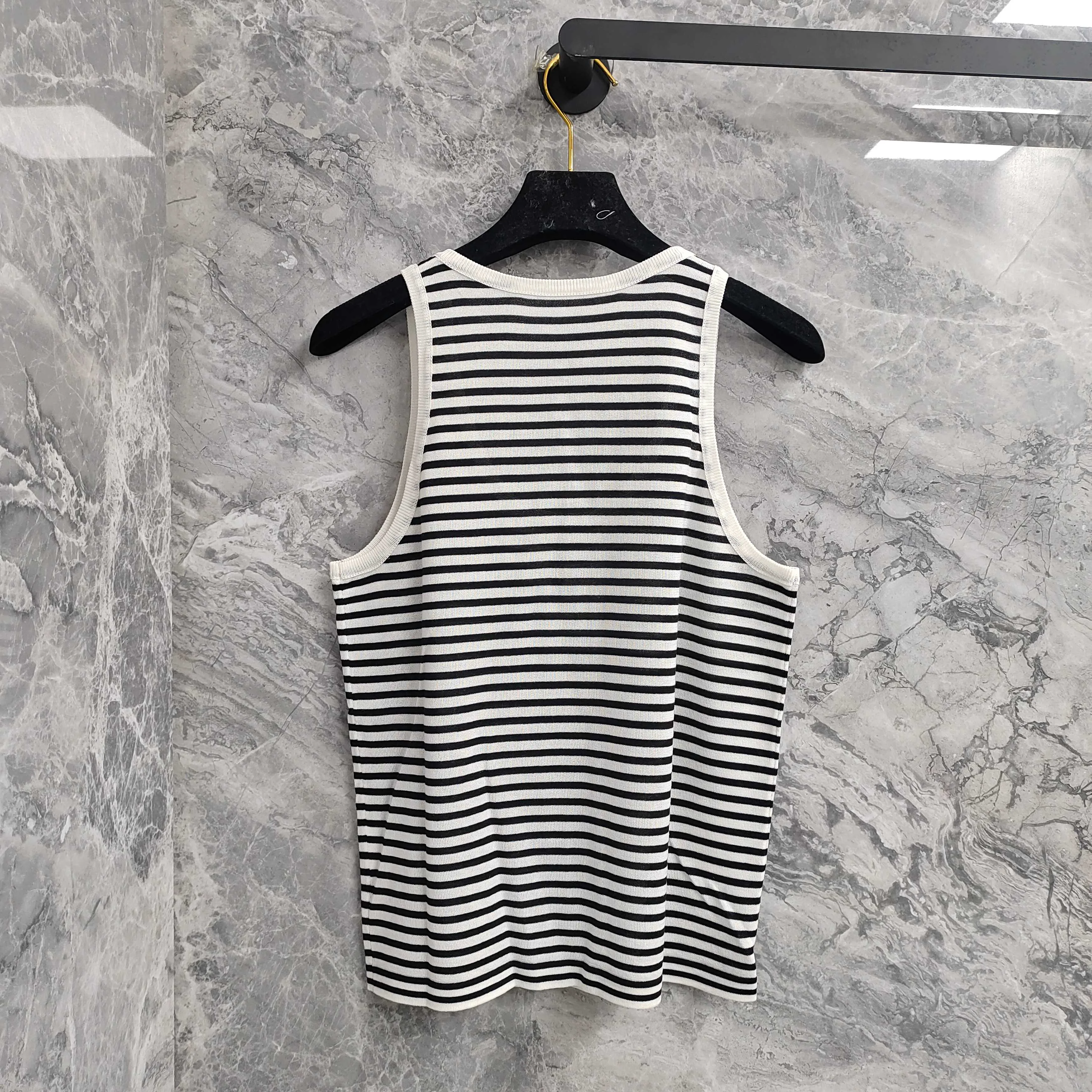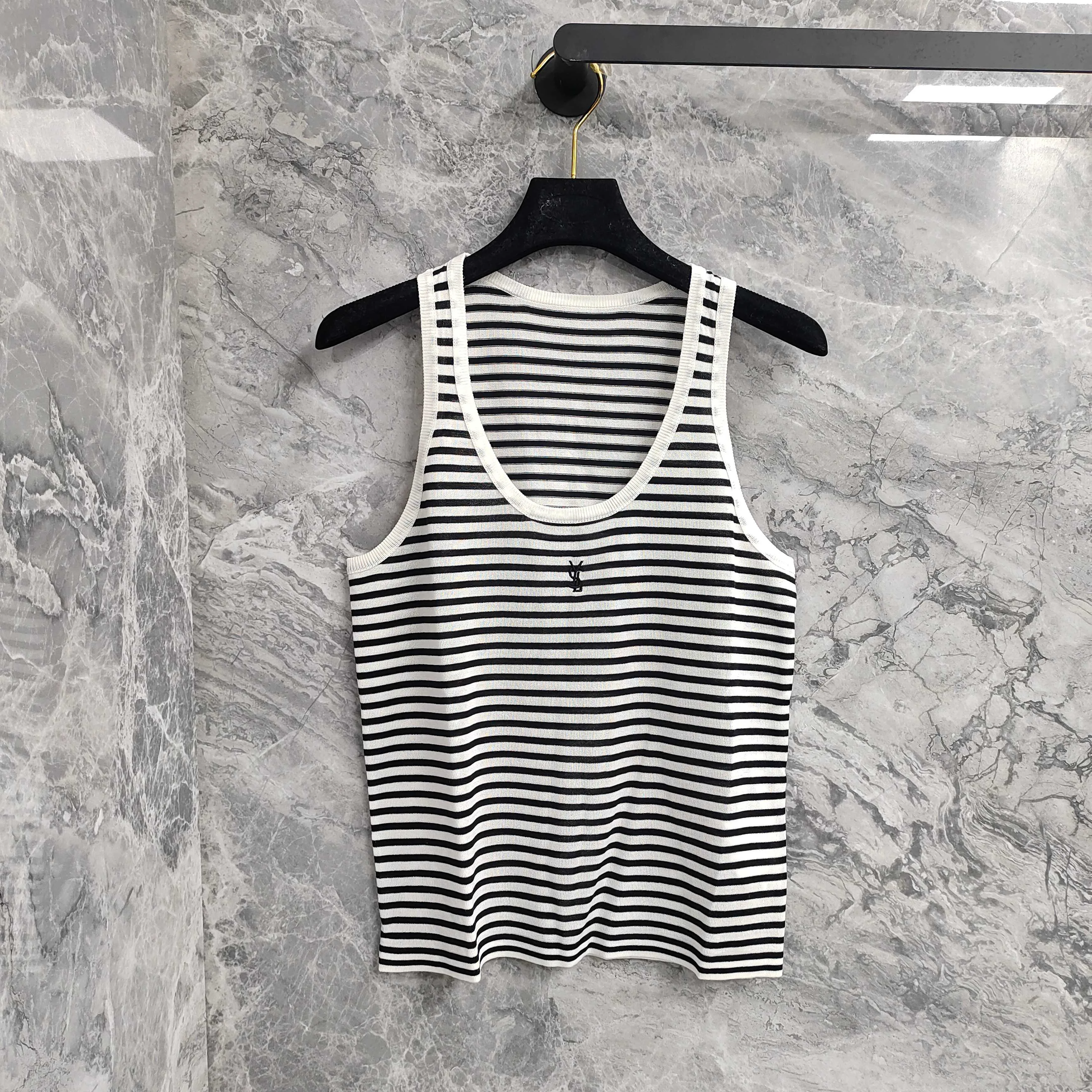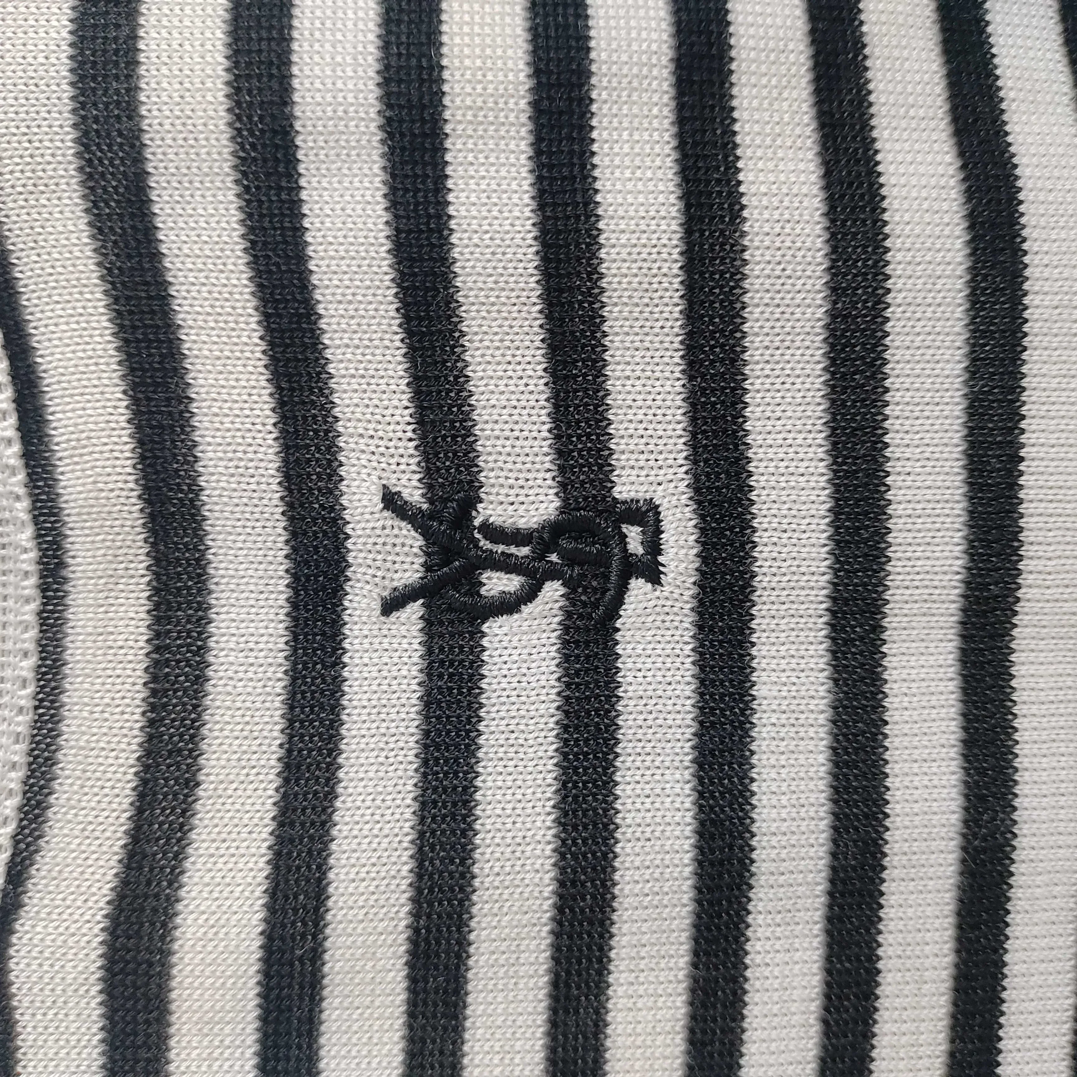 Этот модный жилет отличается элегантным круглым вырезом и оригинальным логотипом SAINT LAURENT, который аккуратно вышит на груди. Дизайн в черно-белую полоску добавляет изысканности и современности, что делает модель актуальной для любого образа.
