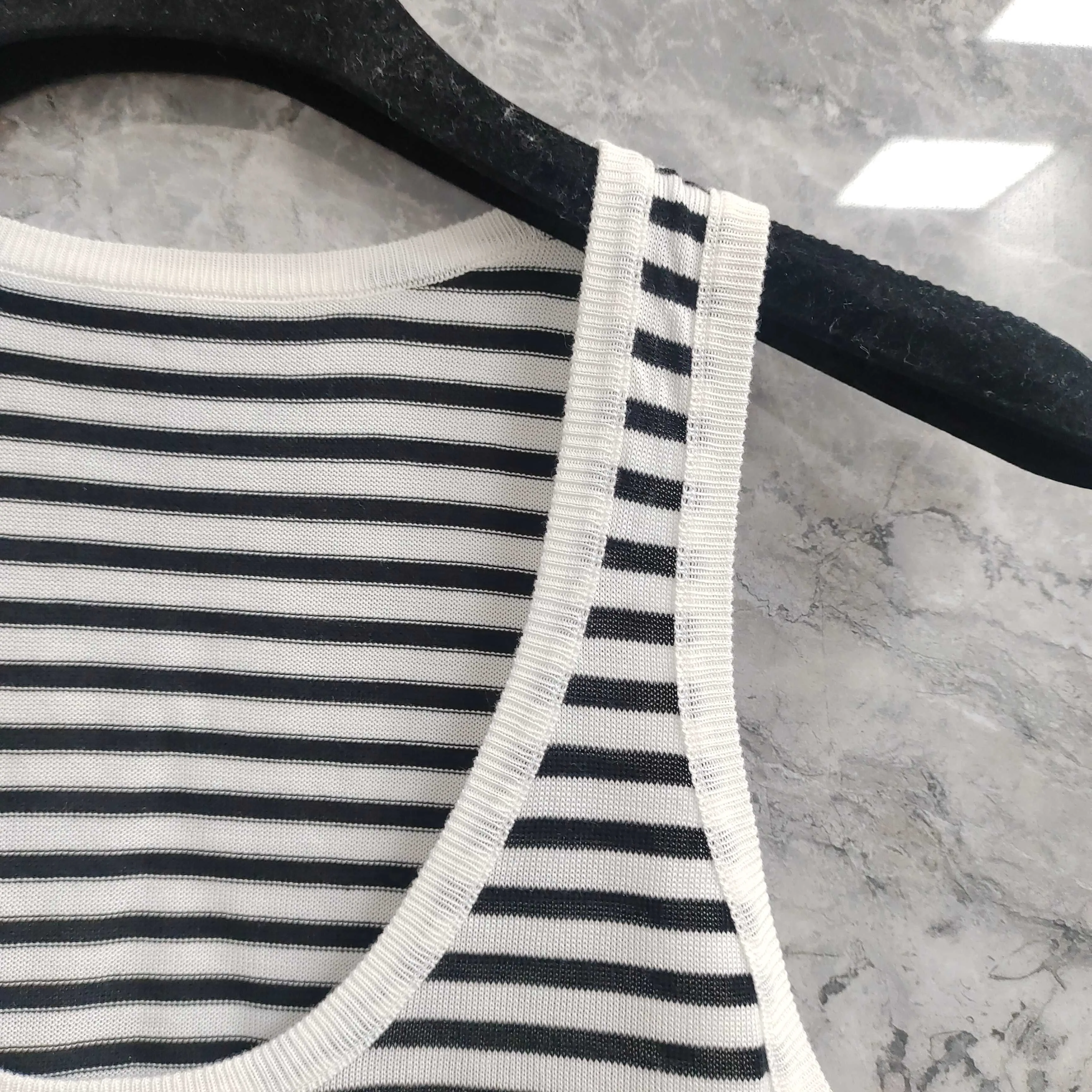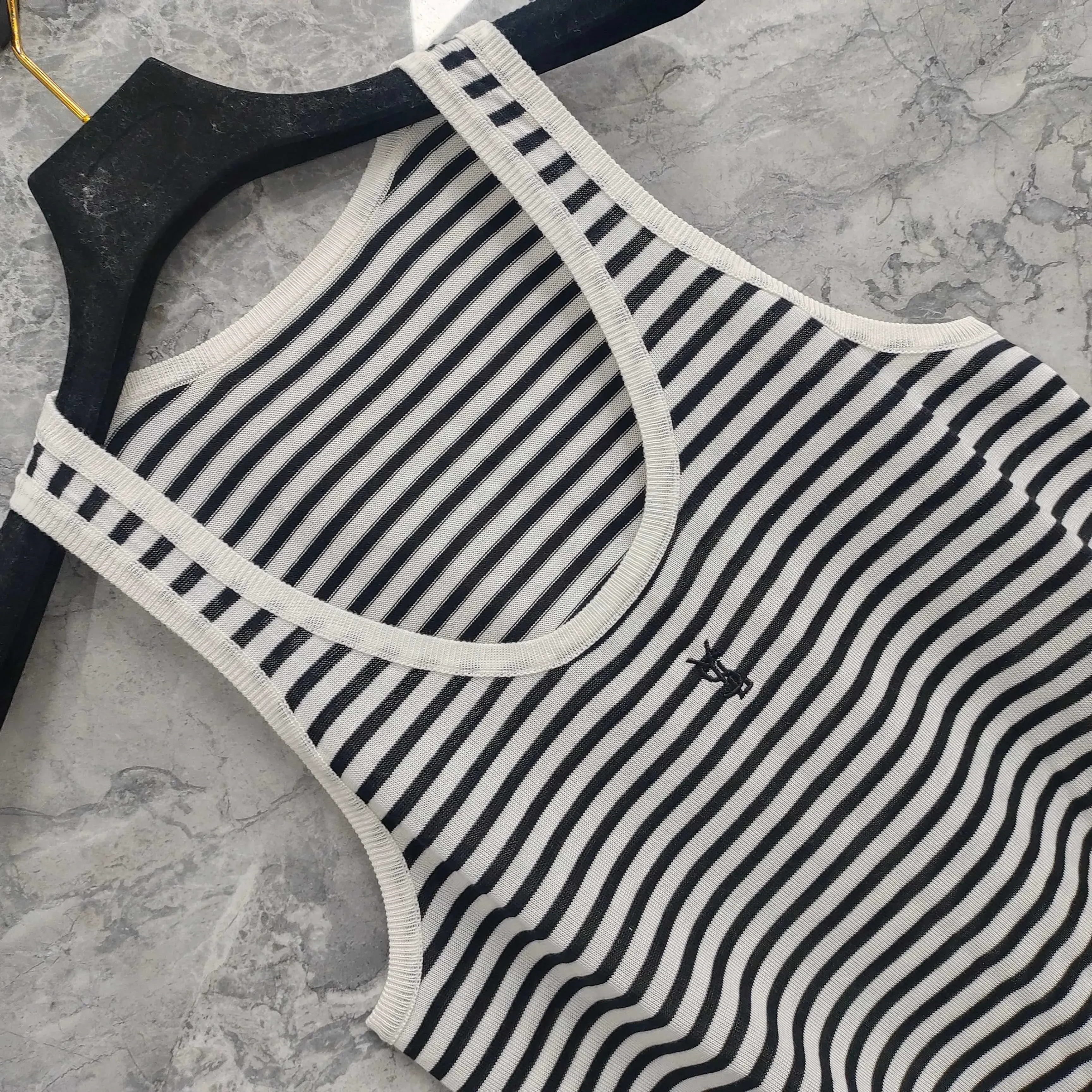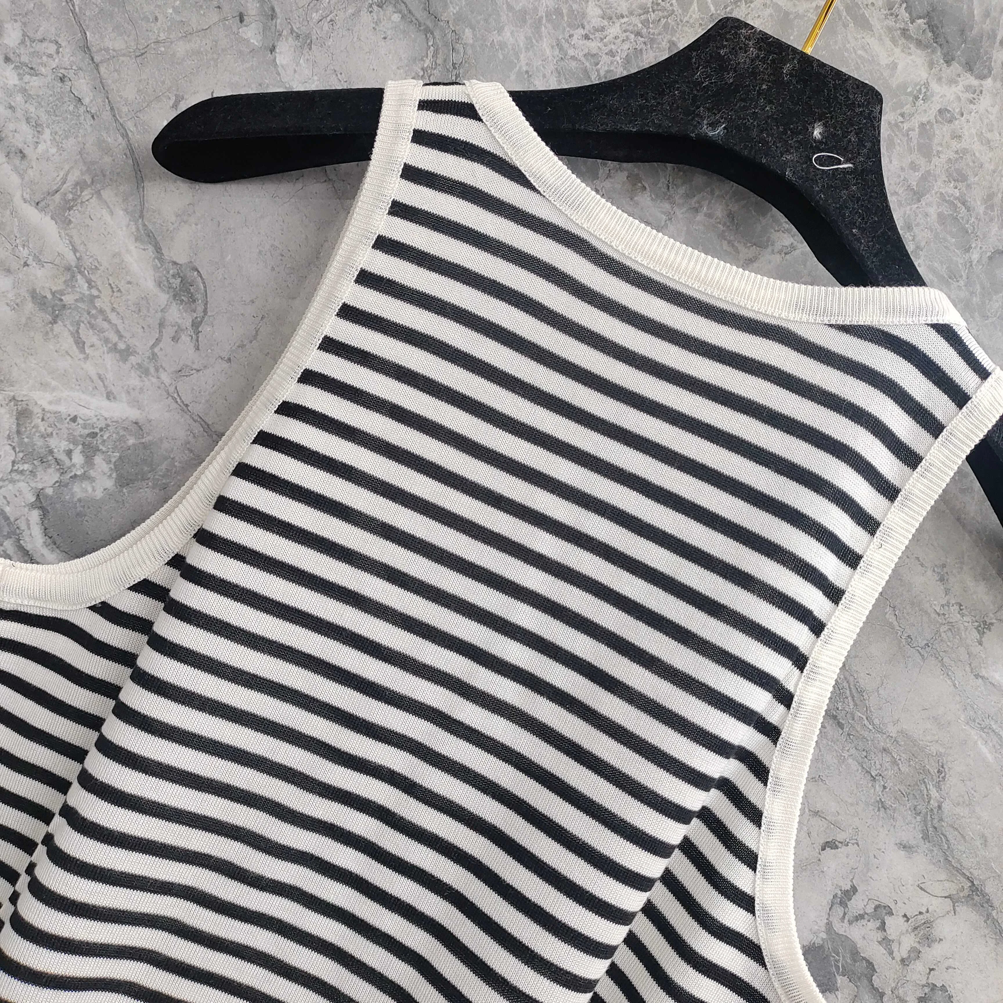 Этот модный жилет отличается элегантным круглым вырезом и оригинальным логотипом SAINT LAURENT, который аккуратно вышит на груди. Дизайн в черно-белую полоску добавляет изысканности и современности, что делает модель актуальной для любого образа.