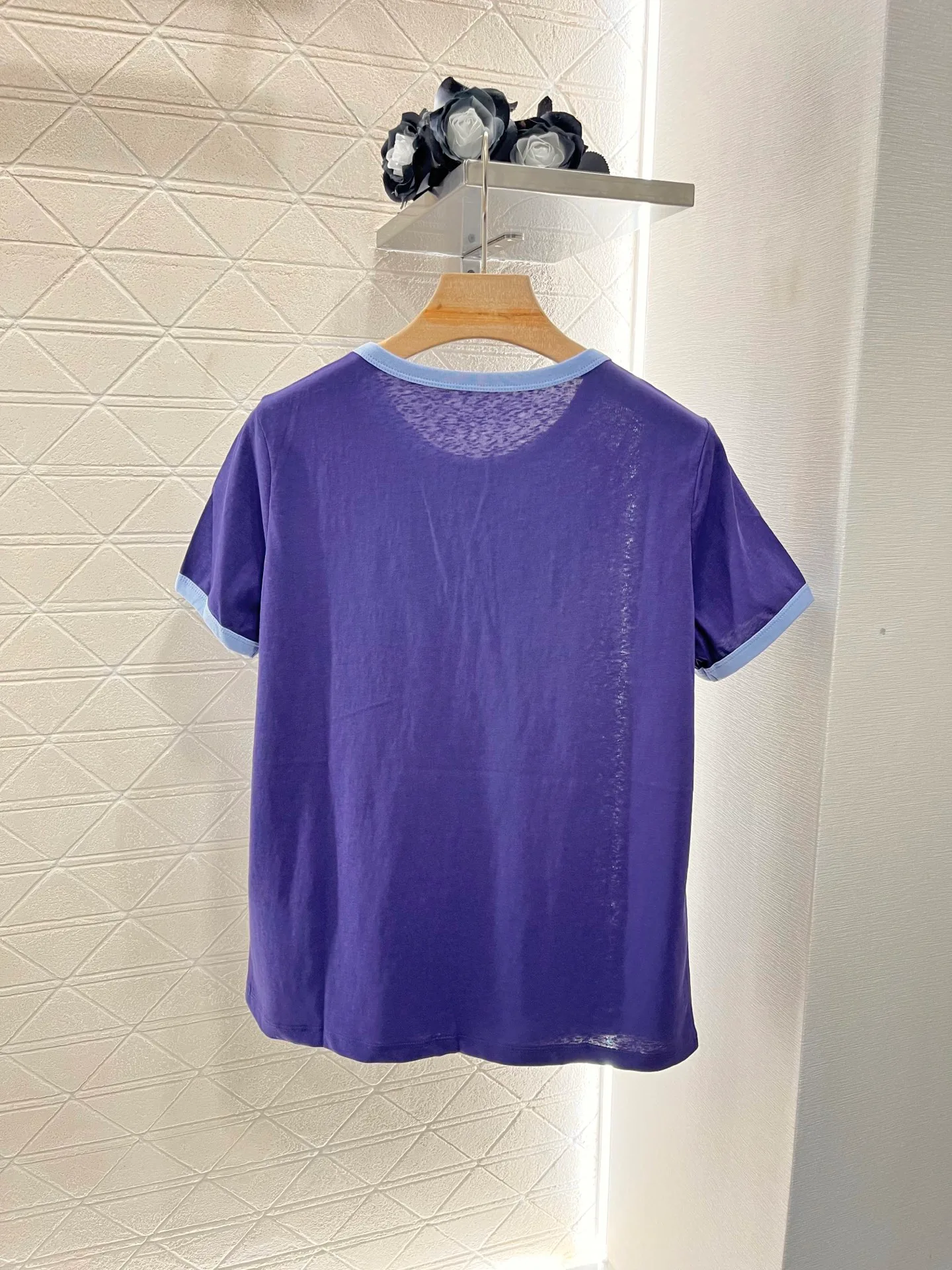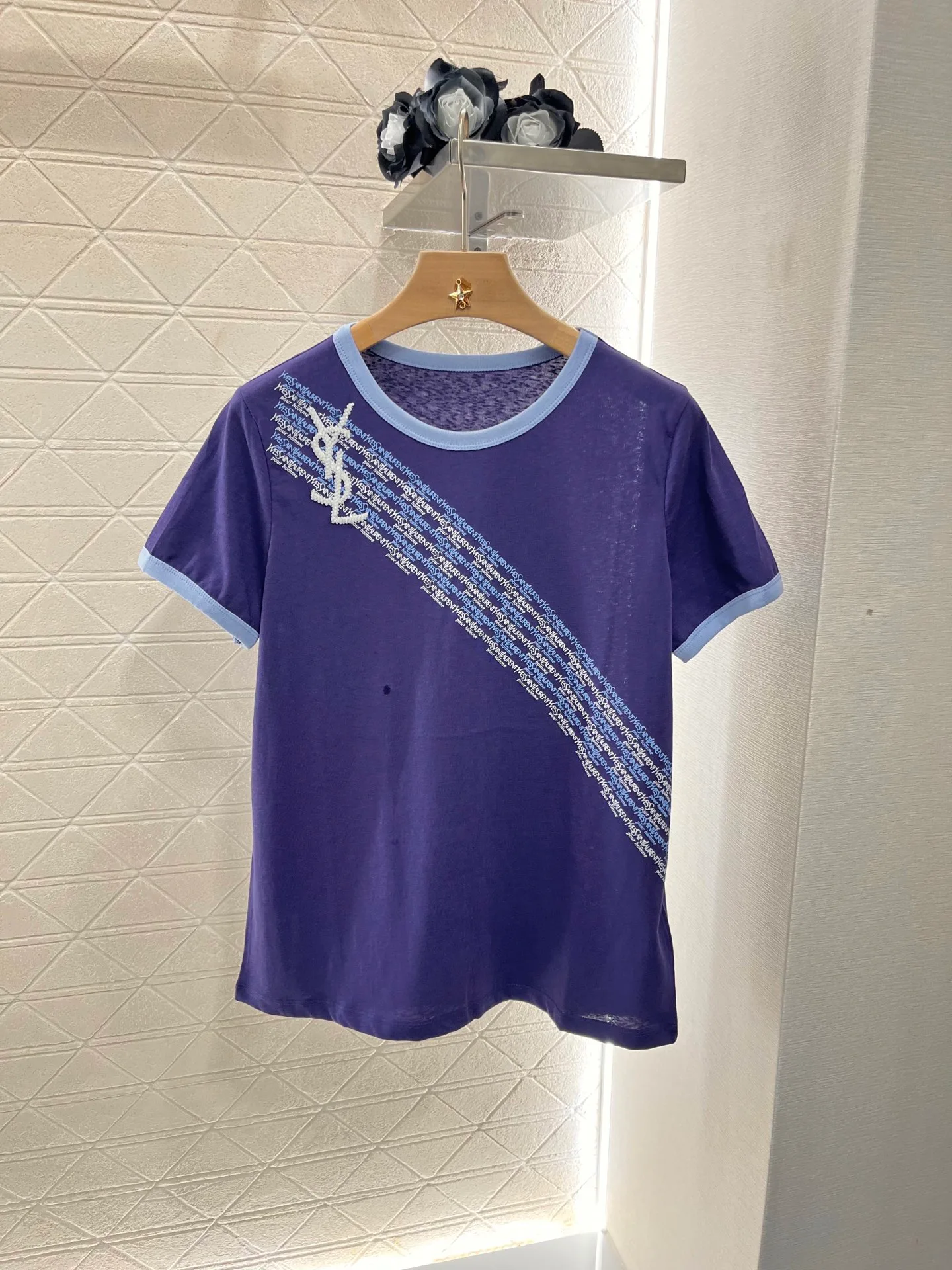 Дизайн включает контрастную окантовку горловины и рукавов. Asymmetrical разрез на плечевой линии плавно переходит к боковому шву, украшенному мелкими кристаллами и печатным логотипом. Футболка представлена в двух цветах и размерном ряде S, M, L, что делает её доступной для разных покупателей.