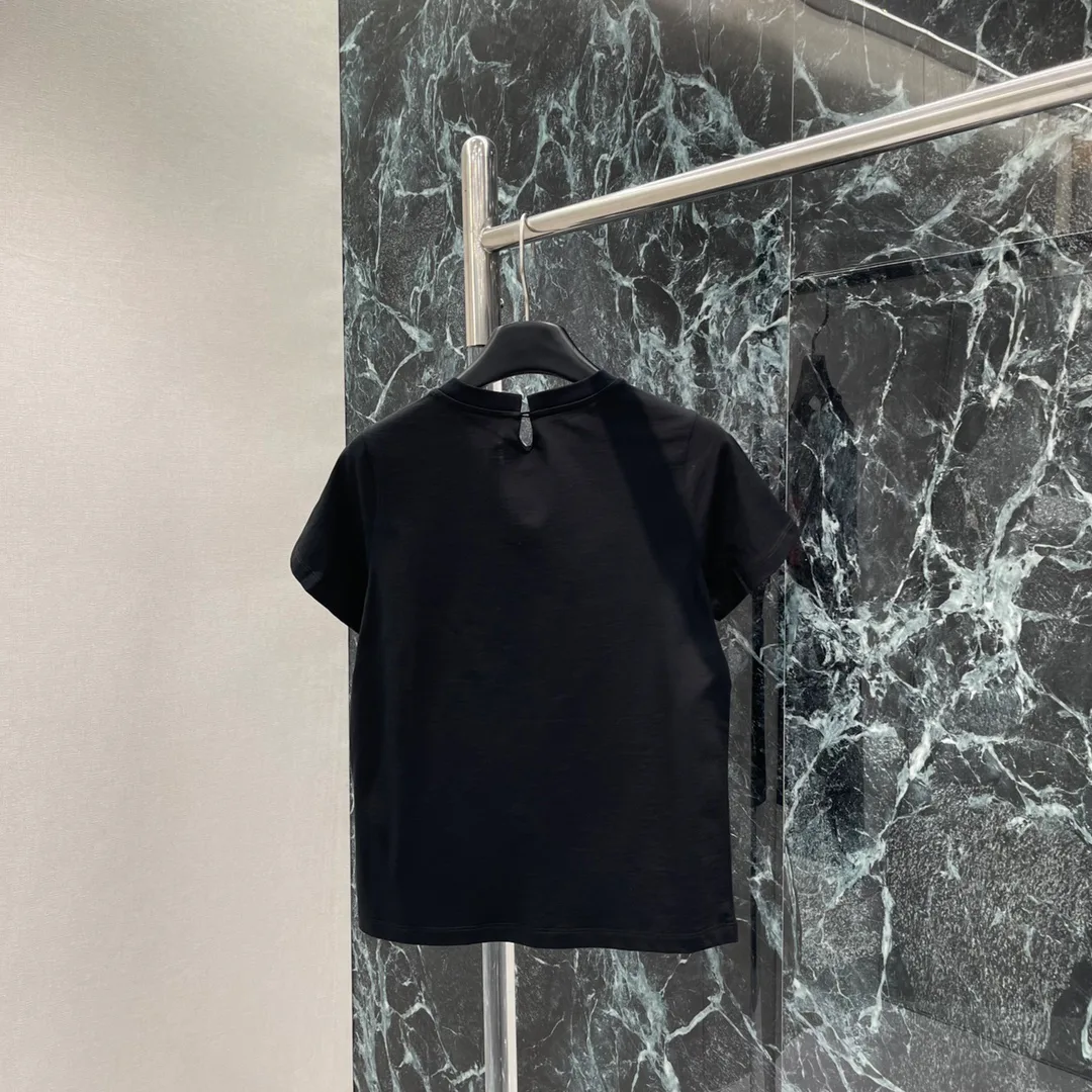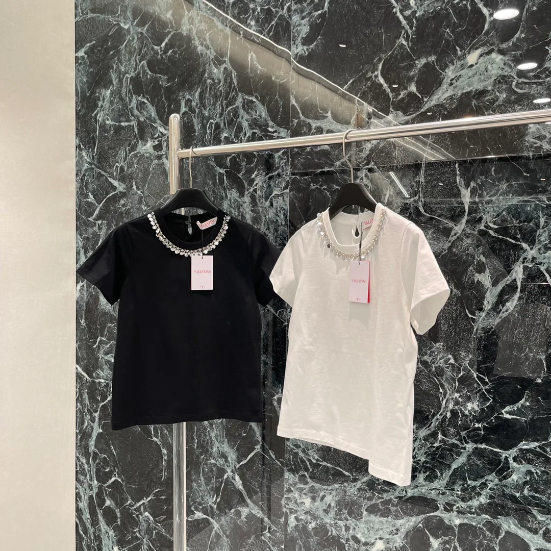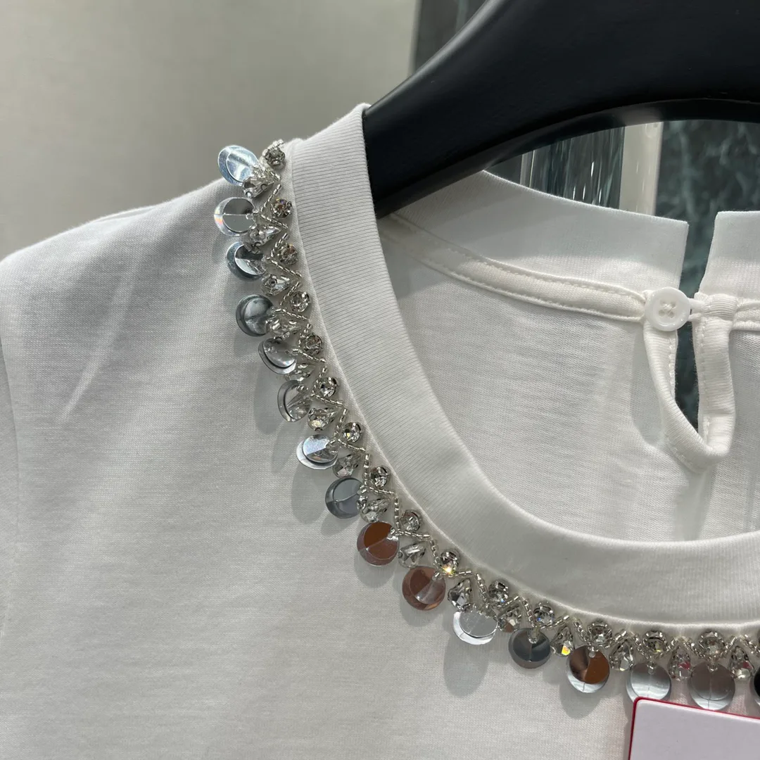 Футболка украшена аккуратной стразовой отделкой, которая обрамляет вырез, придавая изделию элегантность и блеск. Эта модель доступна в чёрном и белом цветах, что позволяет легко сочетать её с различной одеждой и создавать стильные образы как для повседневной носки, так и для особых случаев.