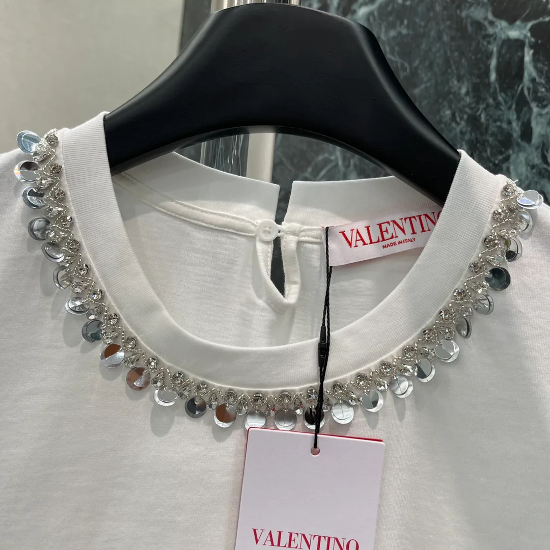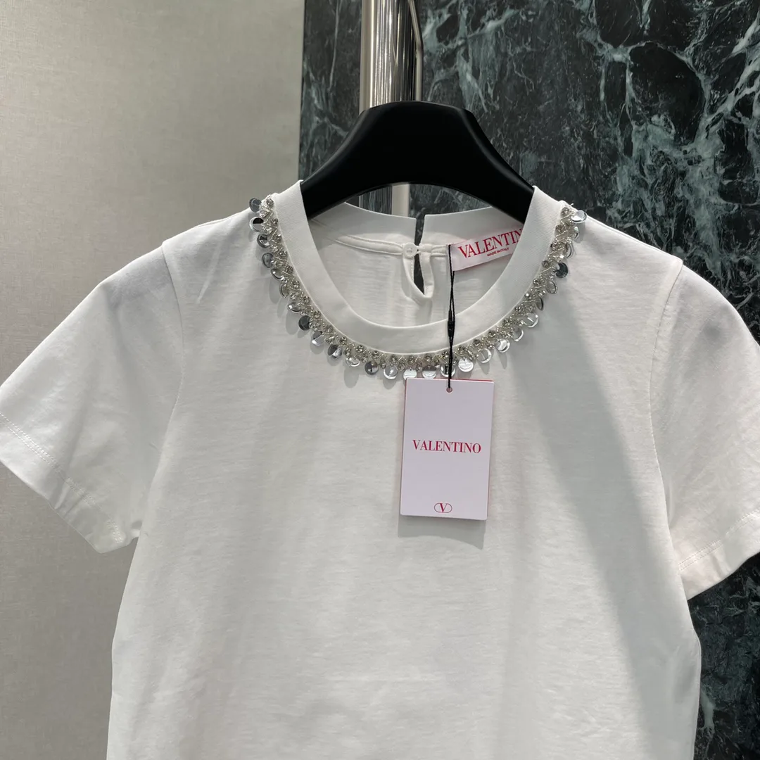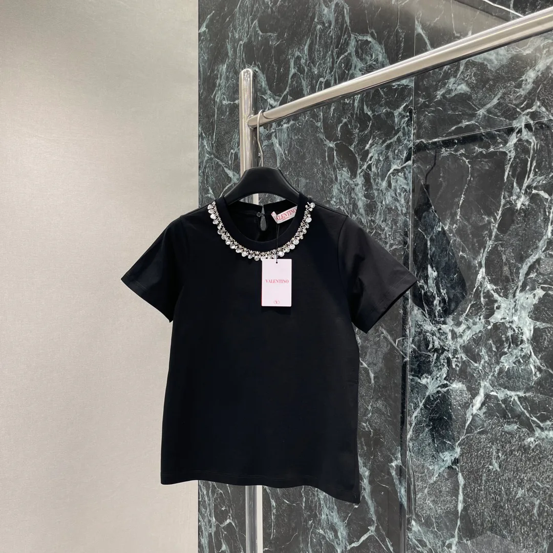 Футболка украшена аккуратной стразовой отделкой, которая обрамляет вырез, придавая изделию элегантность и блеск. Эта модель доступна в чёрном и белом цветах, что позволяет легко сочетать её с различной одеждой и создавать стильные образы как для повседневной носки, так и для особых случаев.