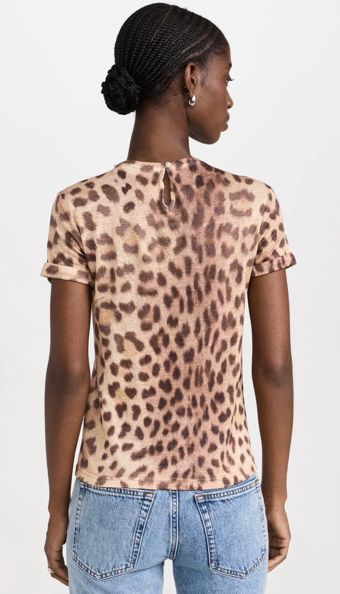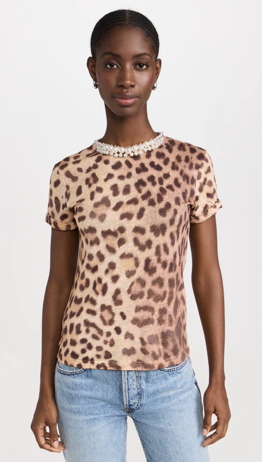 Декольте и нижний край футболки отделаны имитацией кристаллов, что придает изделию дополнительную элегантность и подчеркивает индивидуальность.