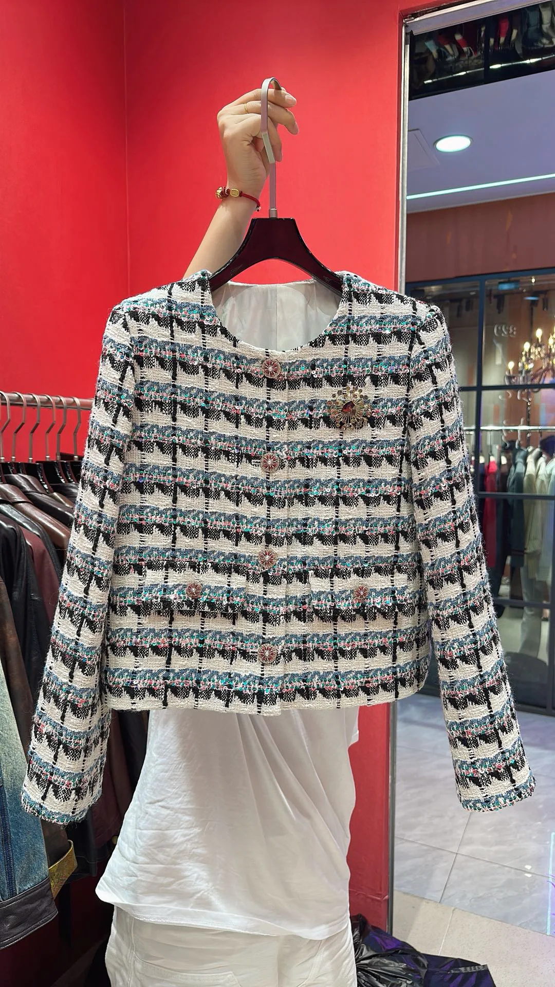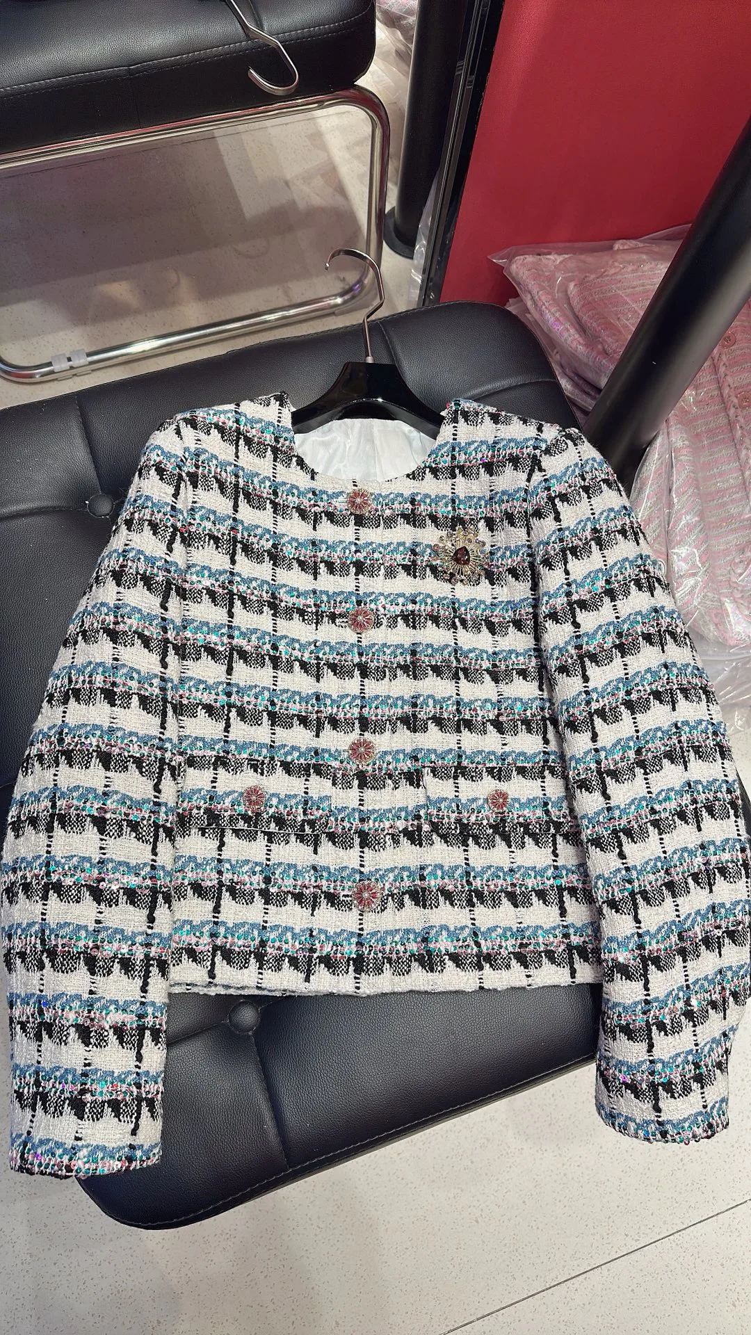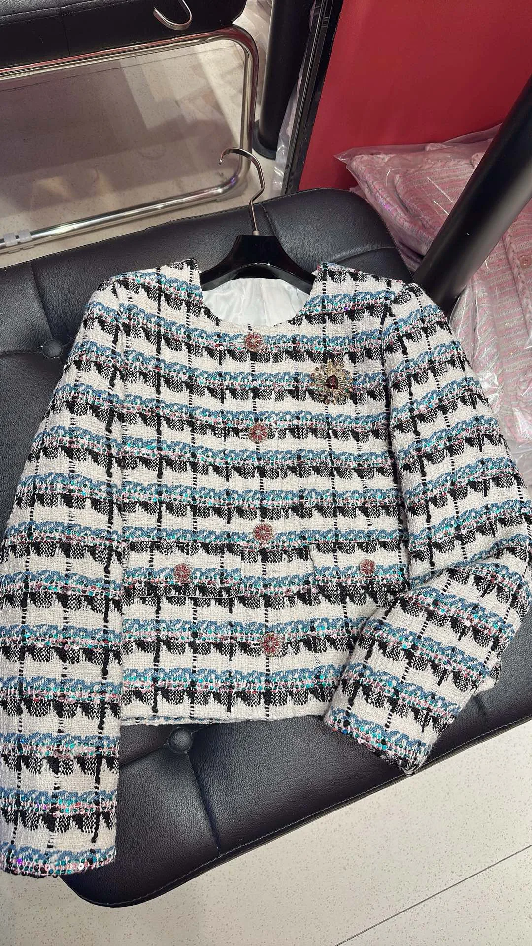 - Материал: смесь тканей с декоративными пайетками — текстура грубого твида сочетается с блеском украшений.