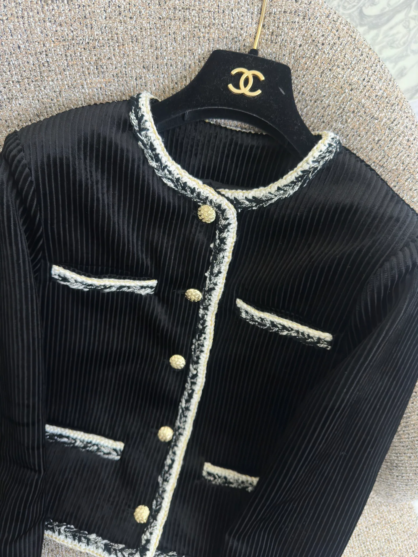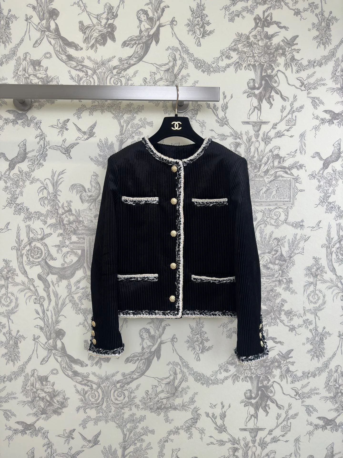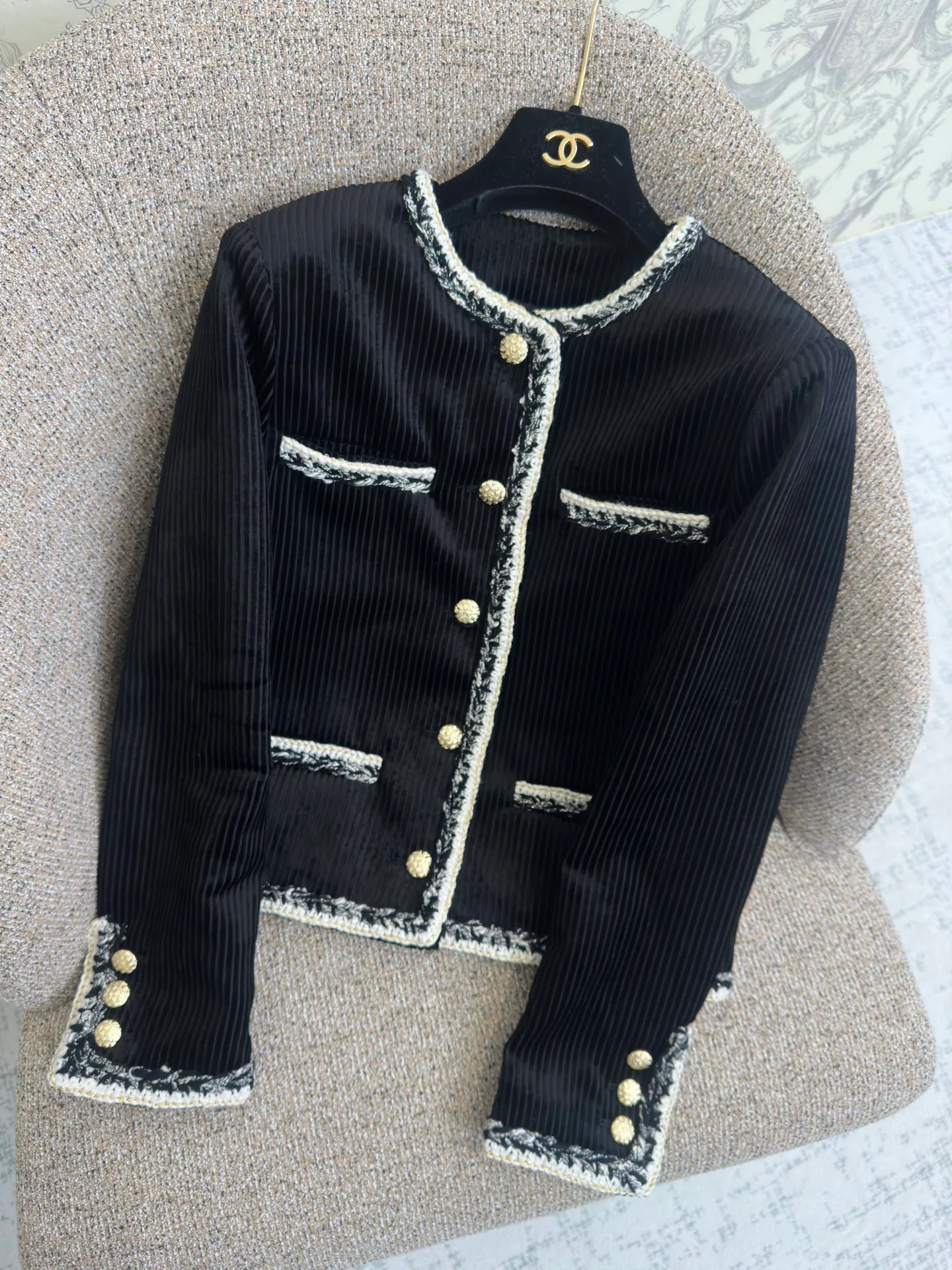 Изделие оснащено круглым вырезом и однобортной застежкой на пуговицах с акцентом на золото. Золотистые металлические застежки в форме двойной буквы C придают жакету роскошь. Длина и посадка подобраны так, чтобы сидеть по фигуре и подчеркивать талии, особенно на грушевидной фигуре. Жакет доступен в одном цвете и размерах S, M, L, при этом легко комбинируется с разнообразными предметами гардероба.
