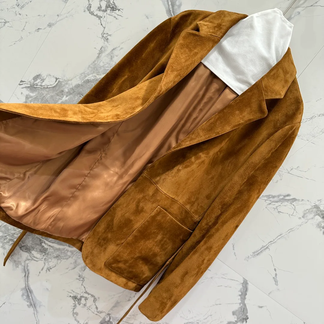 В комплект входит пояс, который подчеркивает талию и позволяет корректировать посадку под любую фигуру. Блейзер подходит для осеннего сезона и идеально подойдет как для строгого офисного образа, так и для вечернего выхода. Доступен в размерах S–XL и трёх цветах. Размер M имеет обхват груди 102 см, ширину плеч 42 см, длину рукава 60 см и длину изделия 68 см.