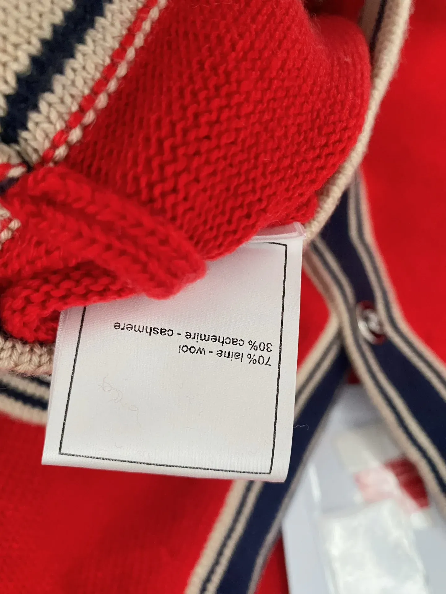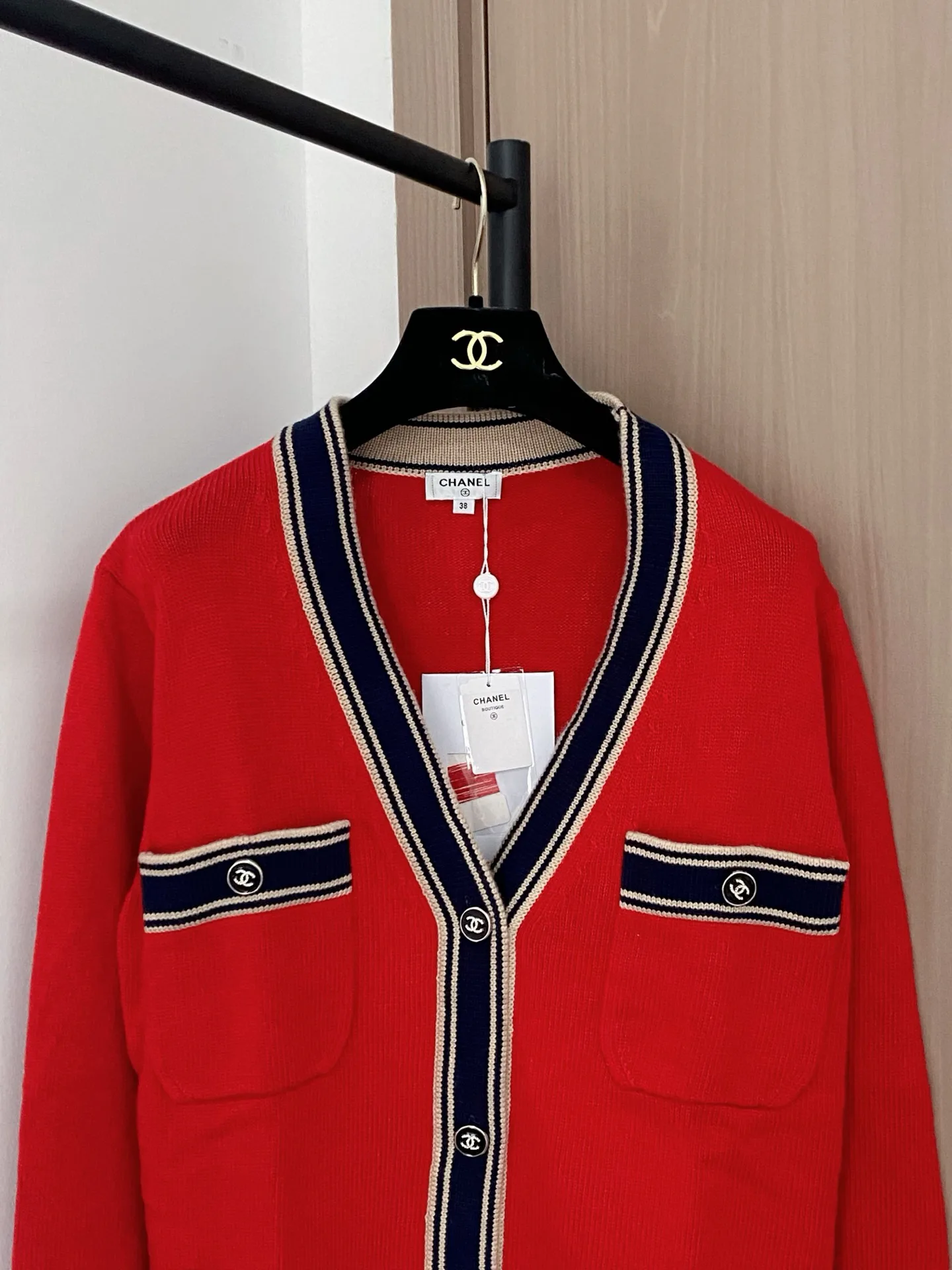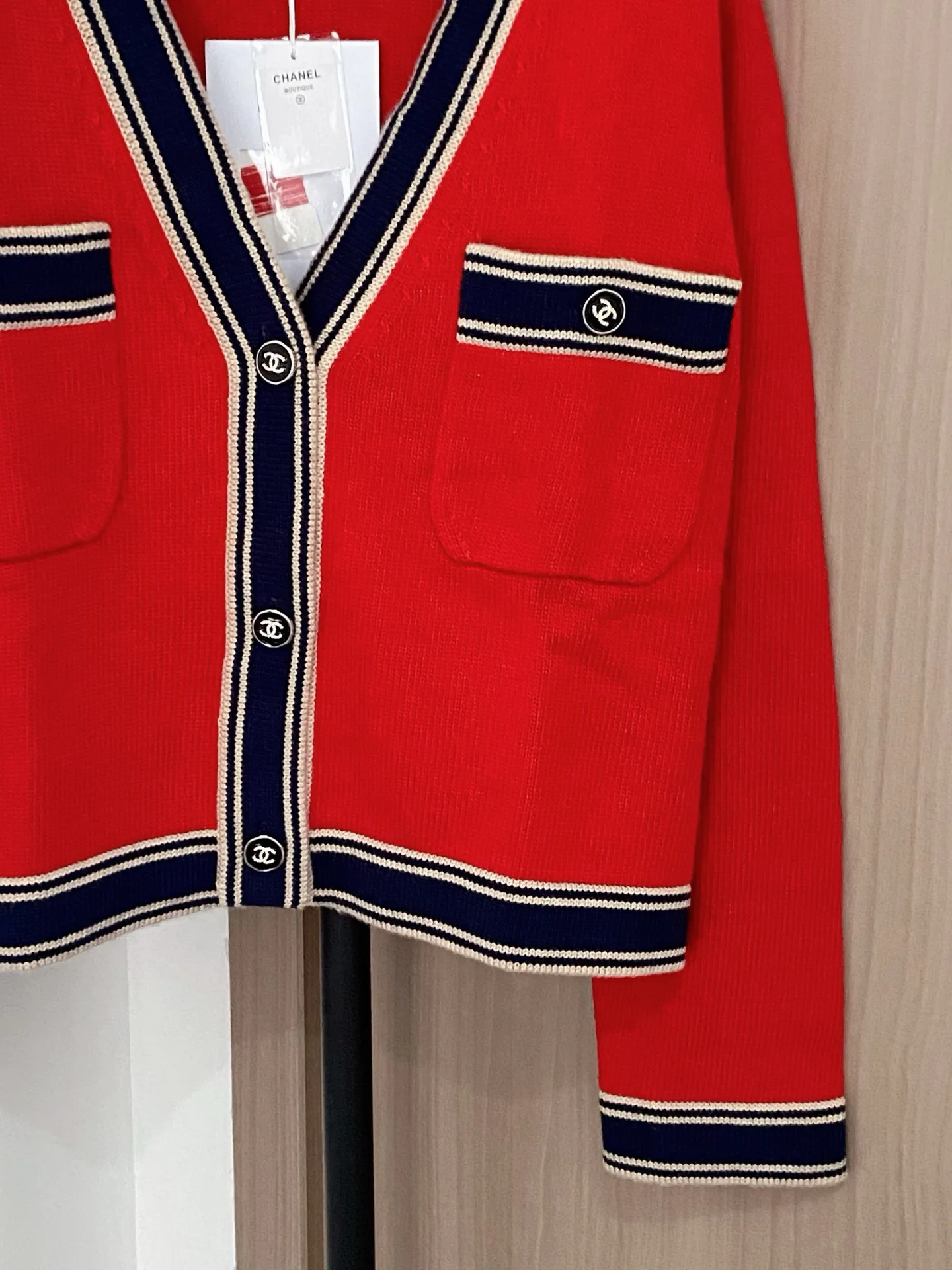 Кардиган представлен в базовом красном цвете с темно-синей и молочно-белой контрастной окантовкой, что подчеркивает силуэт. Классический крой и удобная посадка делают его универсальным для офисных и повседневных образов. Вязаная фактура обеспечивает комфорт и долговечность.