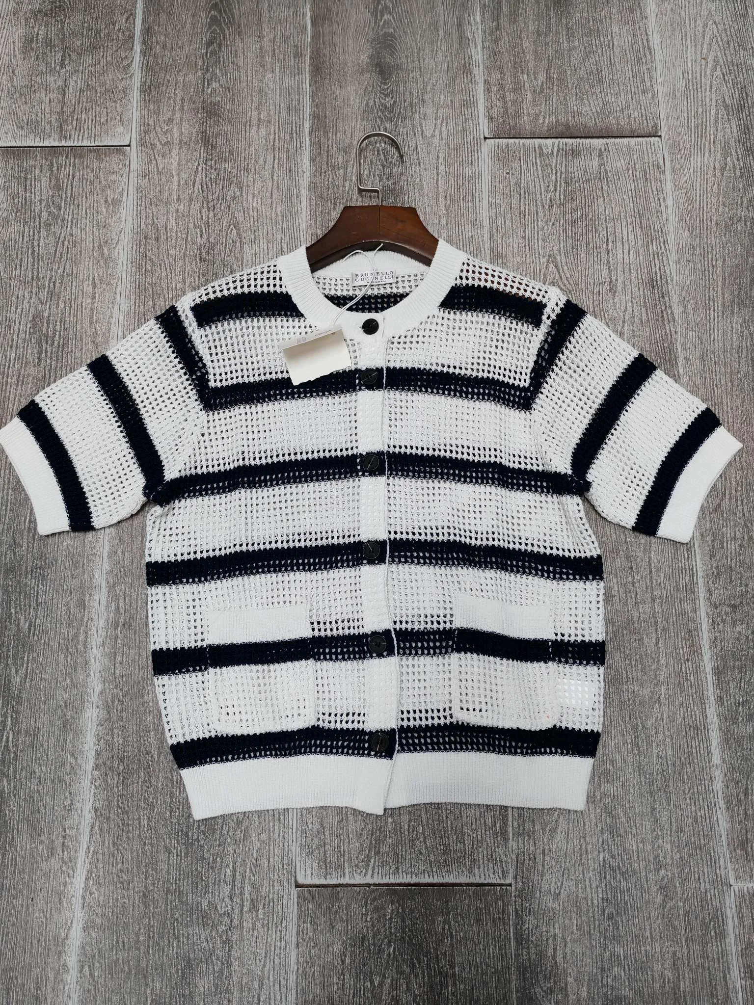 Джемперы и свитеры женские BRUNELLO CUCINELLI — короткий кардиган из комфортной льняной пряжи с комбинированной вязкой. Модель выполнена в полосатой двухцветной гамме с элементами ажурного узора. Изделие представлено в тёмно-синем и бежевом оттенках. Пряжа обеспечивает лёгкость и подходит для тёплого сезона.