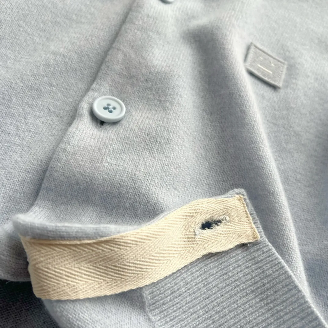 Воротник и планка оформлены полоской из 100% хлопка с диагональным вкраплением, что добавляет текстуру и стиль. Поверхность изделия остаётся гладкой и аккуратной, что подчеркивает изысканность образа.