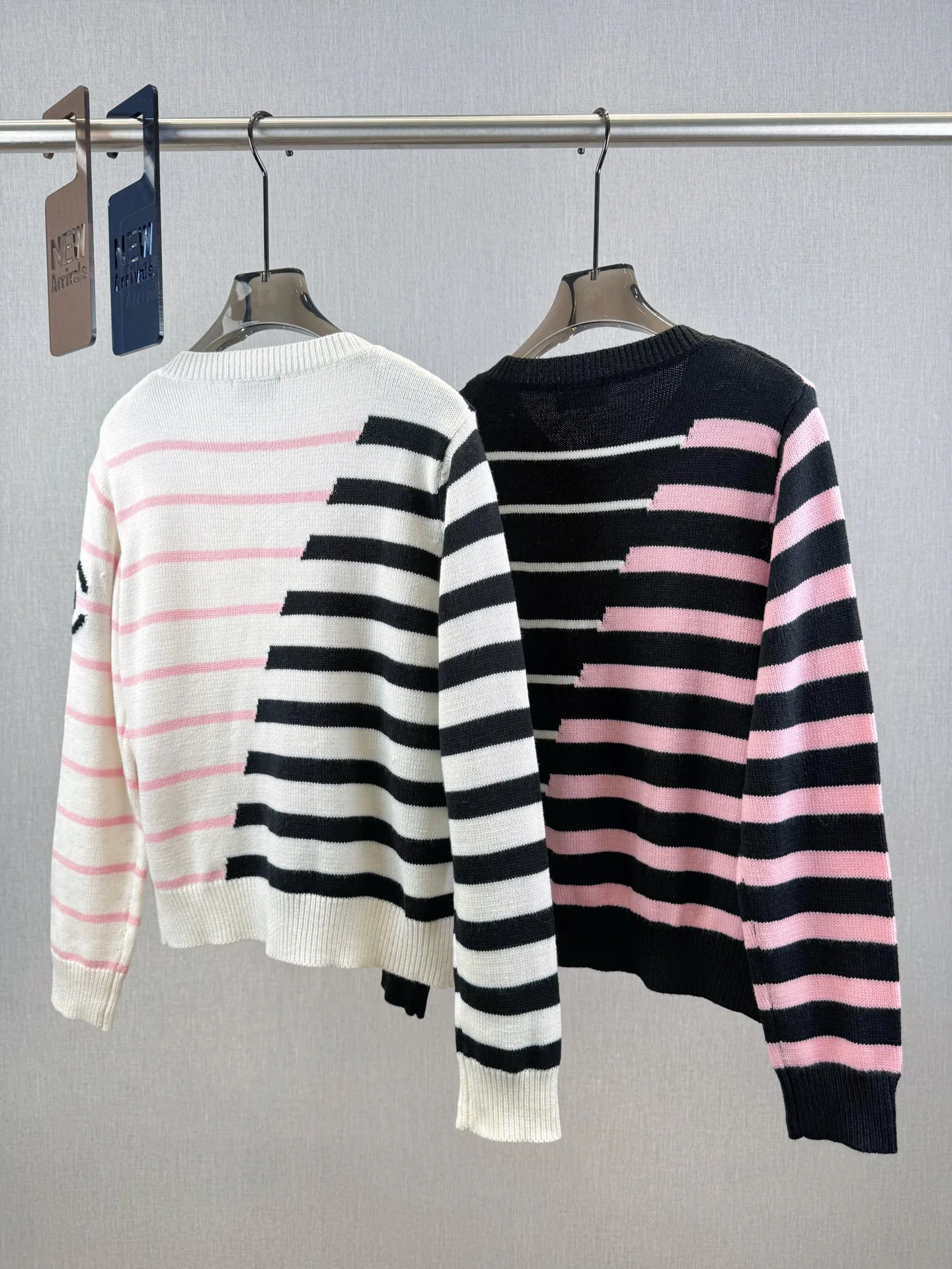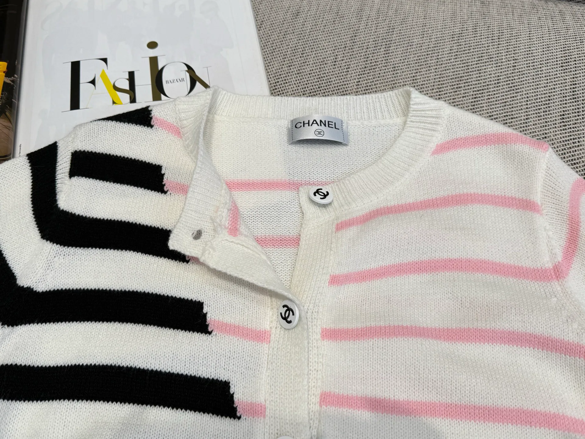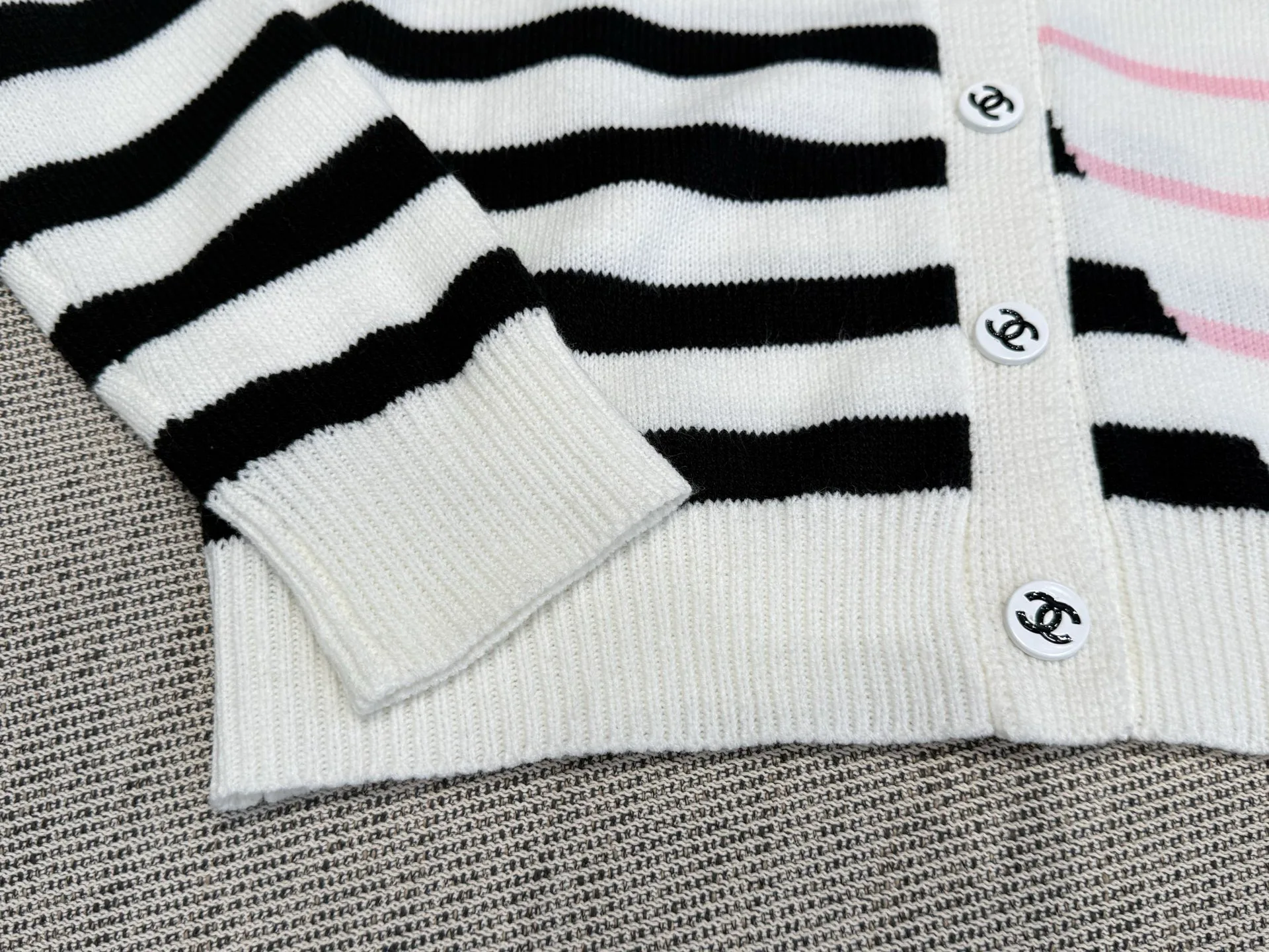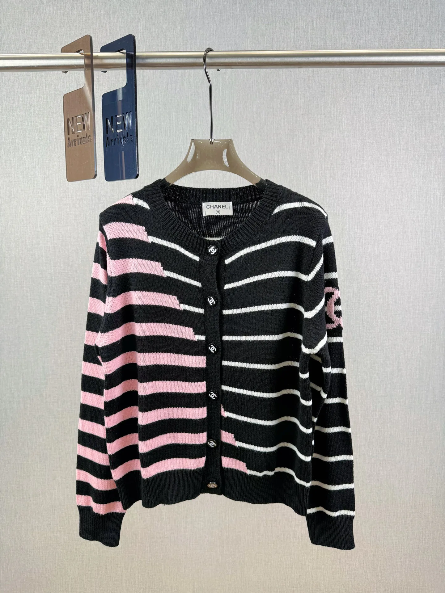 Фурнитура представлена пуговицами с фирменной двойной буквой C. Плечевые элементы украшены жаккардовым логотипом, что акцентирует внимание на бренде. Воротник и манжеты обрамлены ребристой вязкой, что подчеркивает стиль изделия. Доступен в цветах белый и черный, размеры S, M и L.