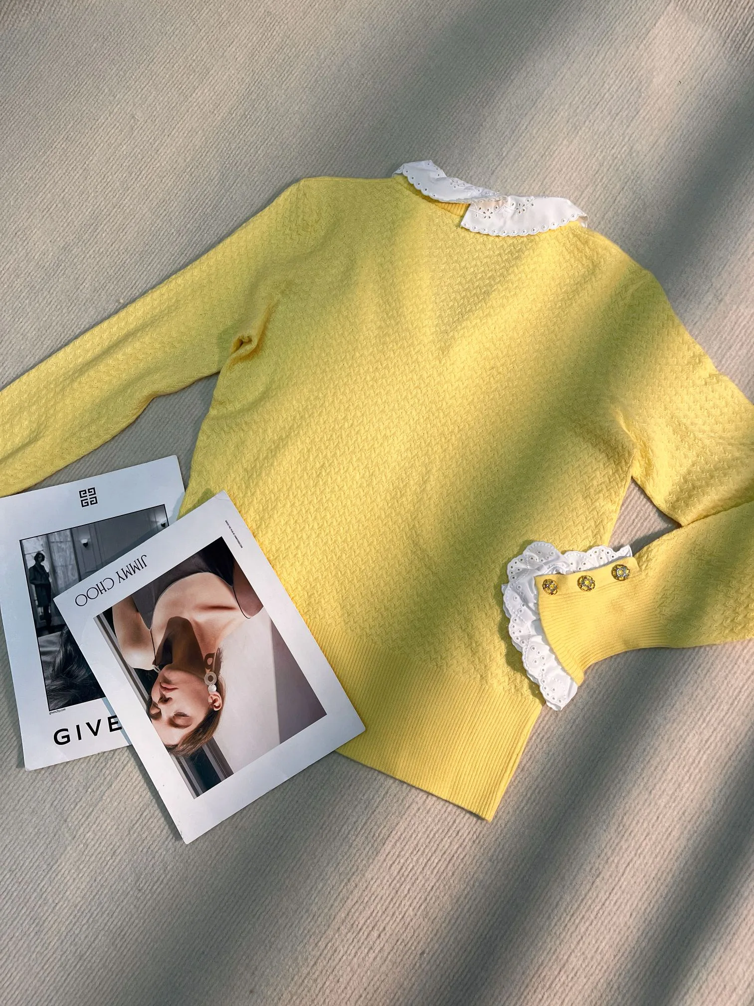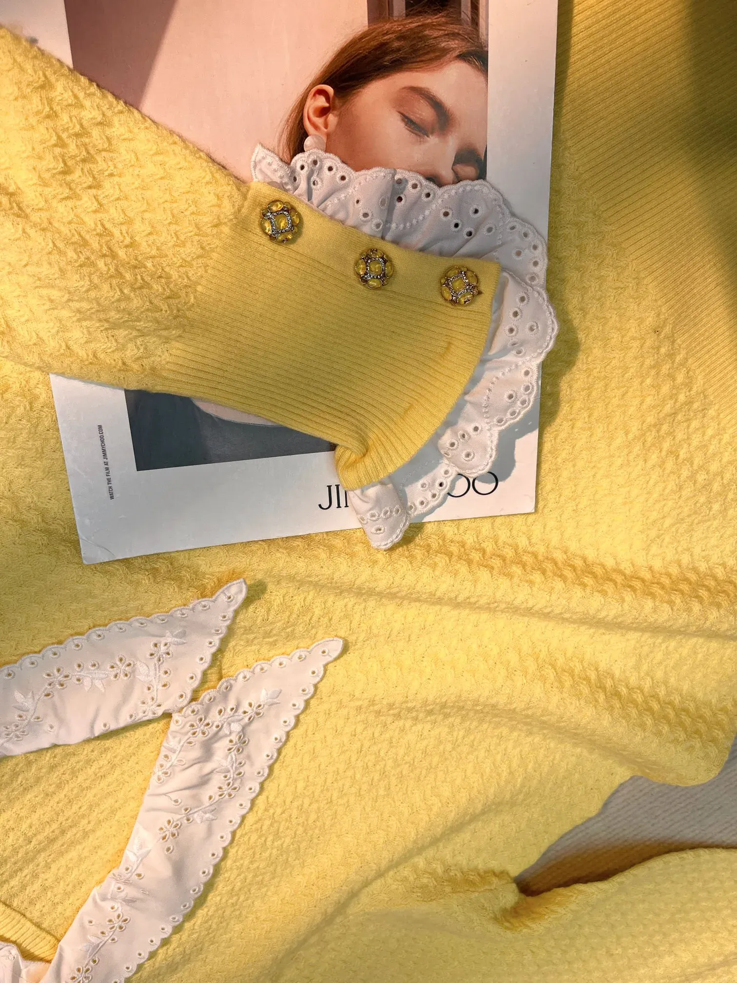 Основным элементом дизайна является водорастворимая кружевная вставка, которая придает изделию утончённый вид. Благодаря съемному дизайну свитер позволяет менять стиль в зависимости от настроения или повода, что открывает множество вариантов для сочетания с другими предметами гардероба.
