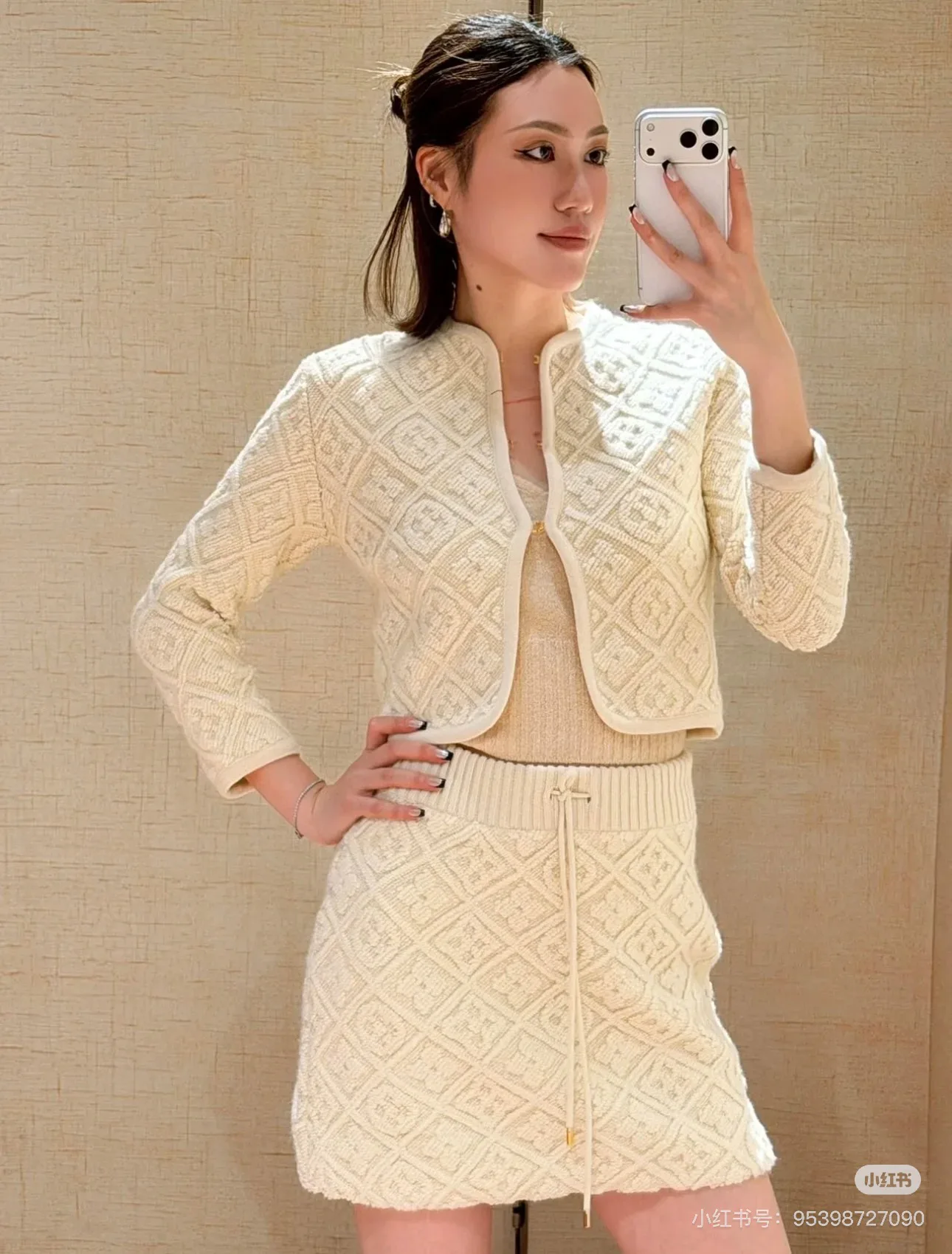 Костюмы женские LOUIS VUITTON — молочно-бежевый вязаный комплект с ромбовой фактурой. Весь комплект выполнен из ткани с объемной ромбовой текстурой. Материал приятен на ощупь и имеет выразительную фактуру, что придает образу винтажную утонченность. Верх — кардиган с круглым вырезом. Юбка короткая, с высокой талией, подчеркивает пропорции фигуры. Размеры: S, M, L.