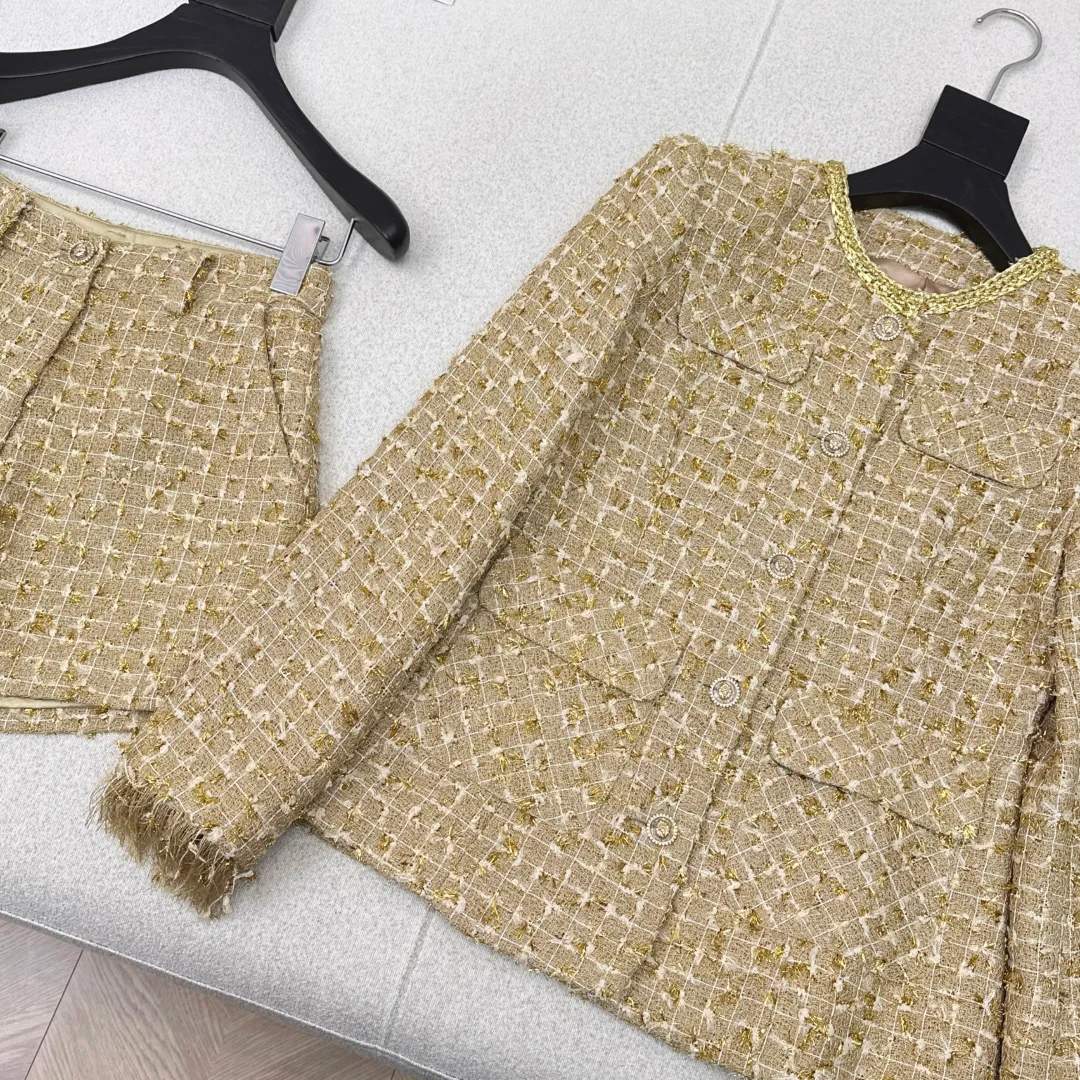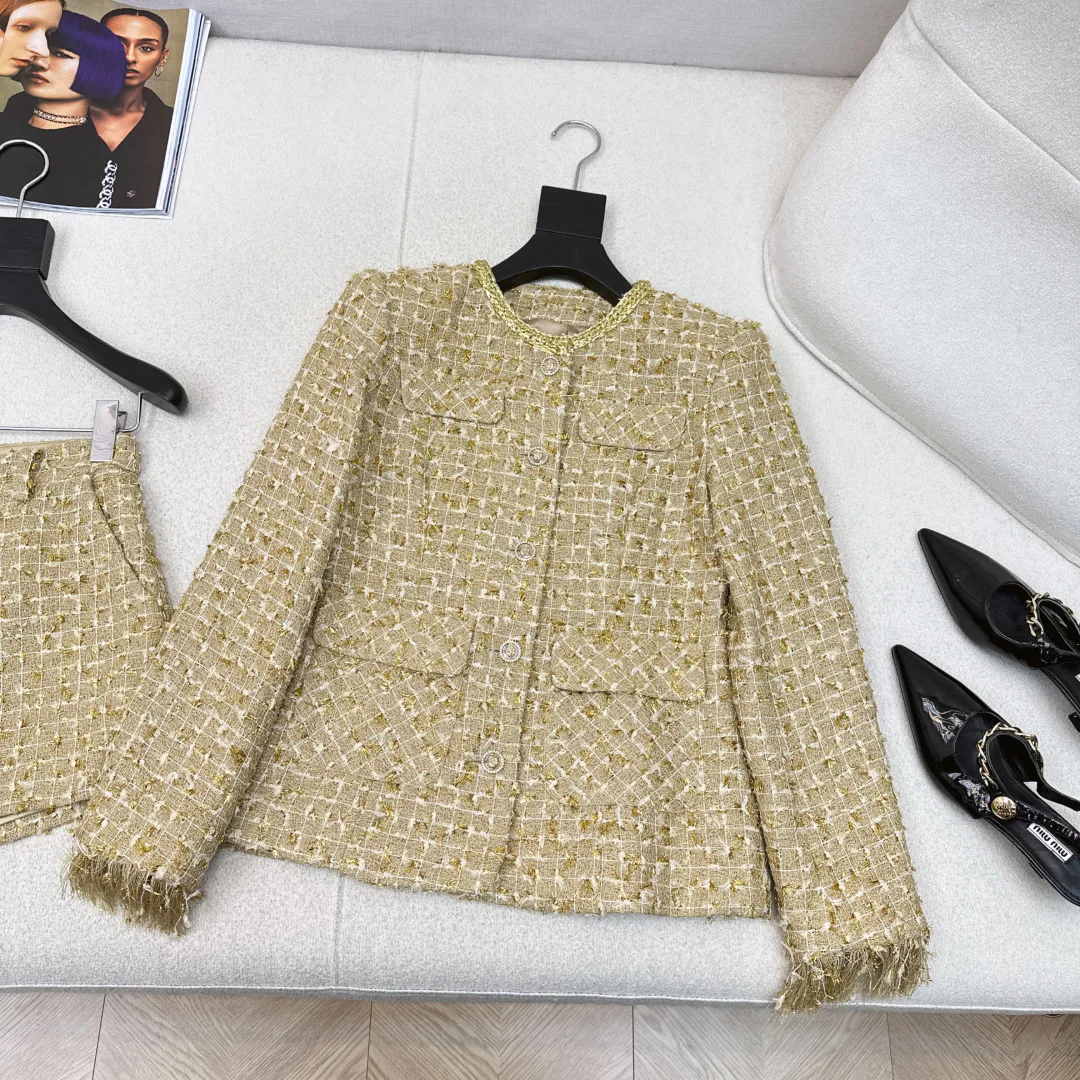 Изготовлен из ткани с золотой нитью в крупной вязке, напоминающей твид. Жакет имеет женственный силуэт и практичные карманы, а шорты визуально вытягивают фигуру. Золотистые жемчужные пуговицы придают изделию элегантность. Костюм можно сочетать как в полном виде, так и раздельно, комбинируя жакет с юбками или брюками, а шорты — с блузками и свитерами.