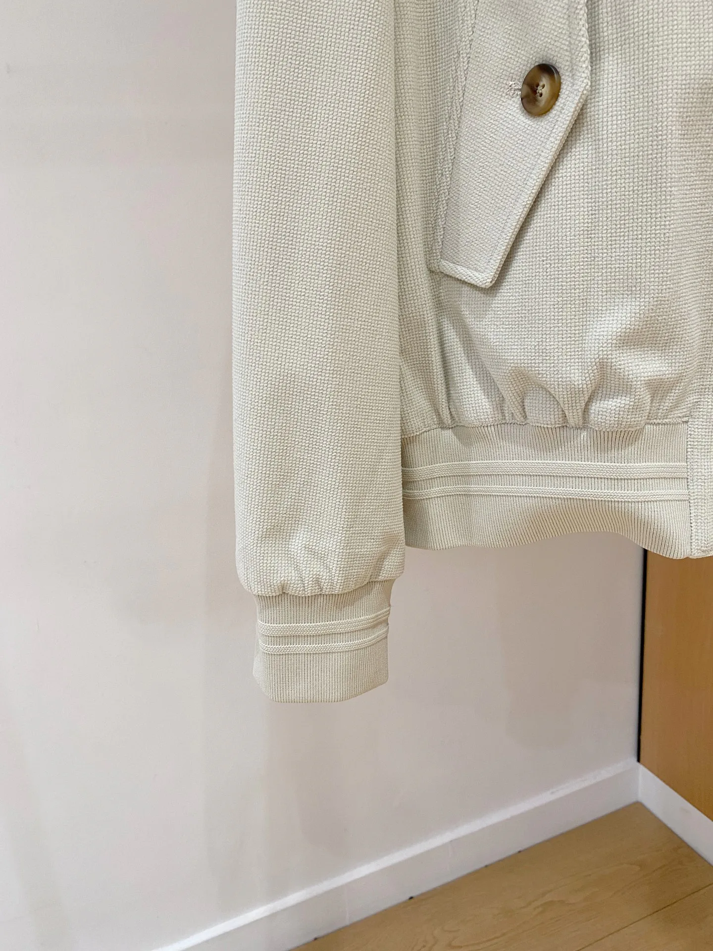 - Верхняя часть: куртка-флайер с молнией и отложенным воротником, выполненная из кашемира и шерсти. Строгий силуэт и лаконичный дизайн позволяют носить её в многослойных образах.