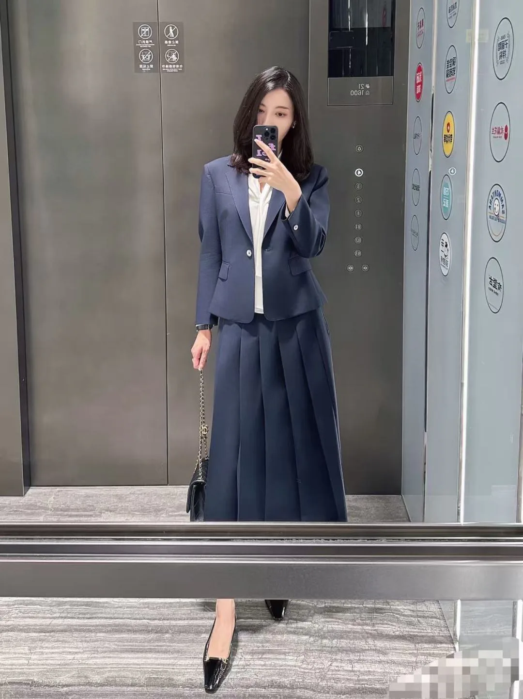 Плисированная юбка добавляет движения и женственности к строгому силуэту, а складчатая фактура создаёт роскошный вид. Основной материал обеспечивает комфорт и сохранение формы. Комплект подходит для различных ситуаций, включая офисные и вечерние выходы.
