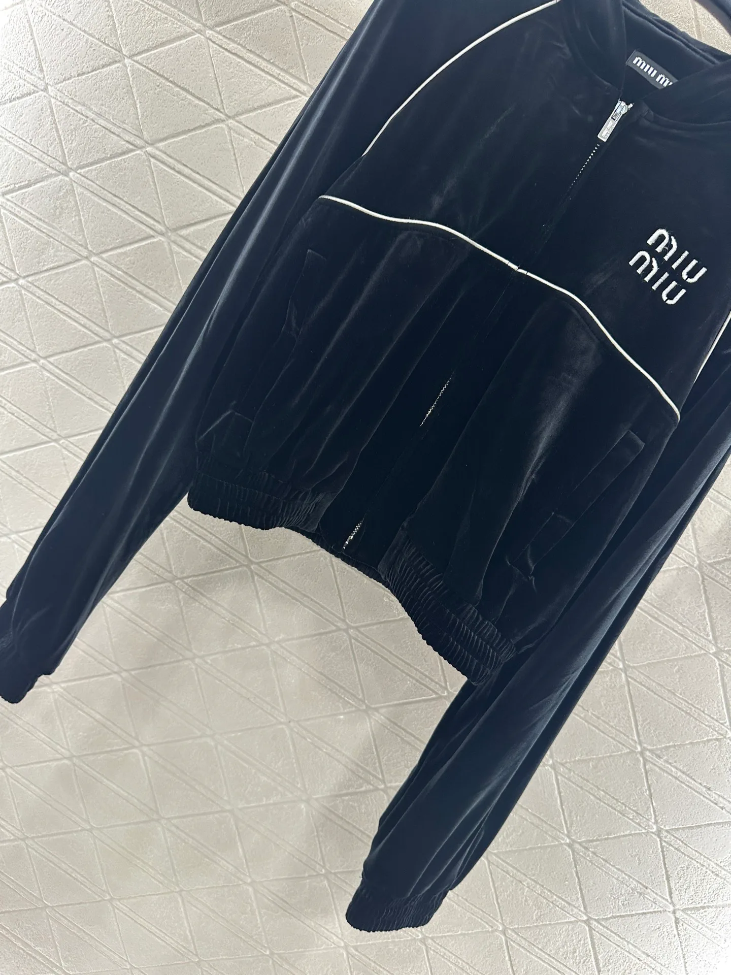 Преимущества: премиум версия из импортированного велюра; кантовка и логотип создают стиль; брюки с тесьмой визуально удлиняют силуэт; универсальность стиля — в коллекции MIU MIU.