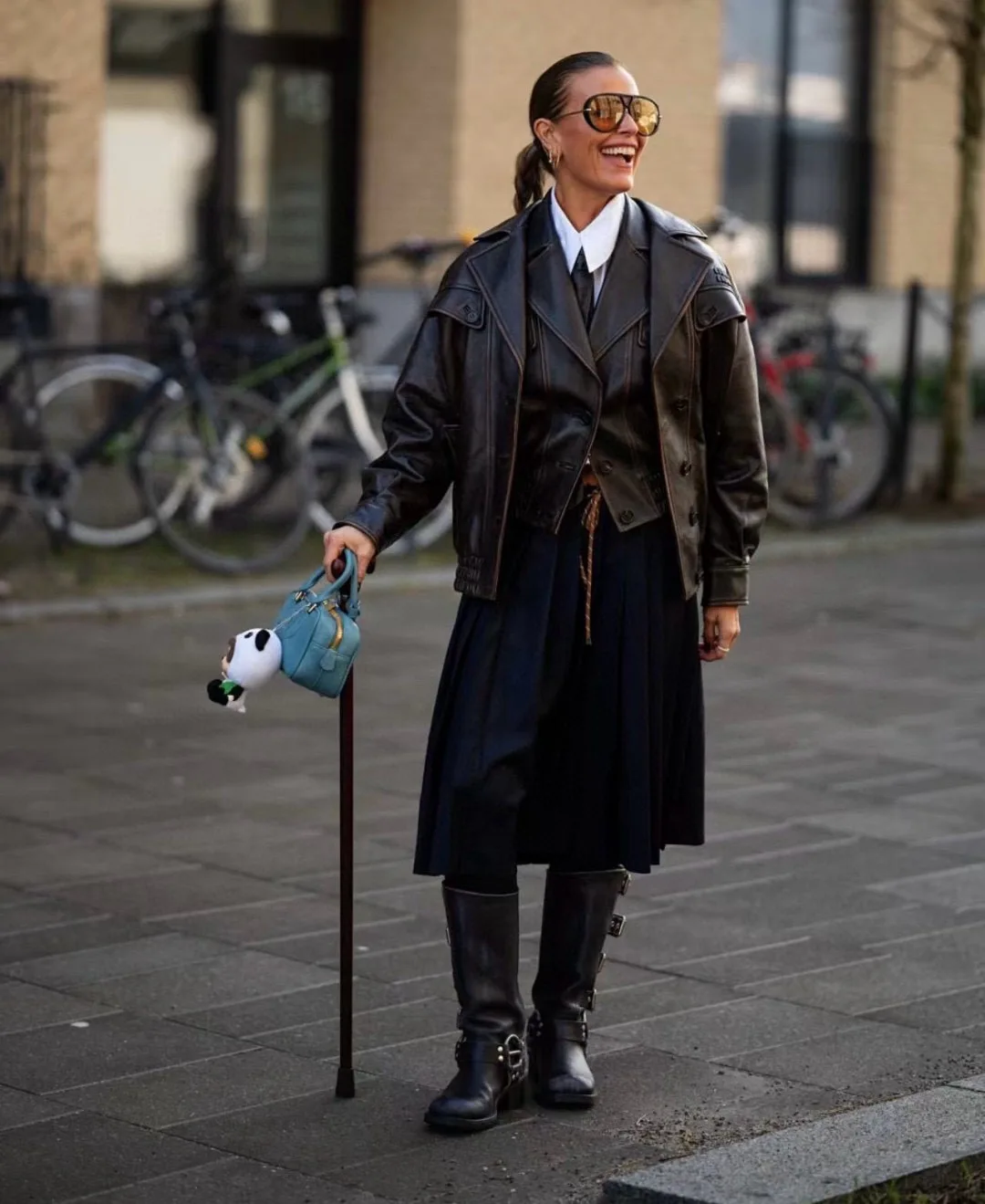Асимметричная молния застежки добавляет оригинальности и характер байкерского стиля. Шипованные детали создают металлический акцент и подчёркивают брутальность изделия. Большие накладные карманы практичны для мелочей.