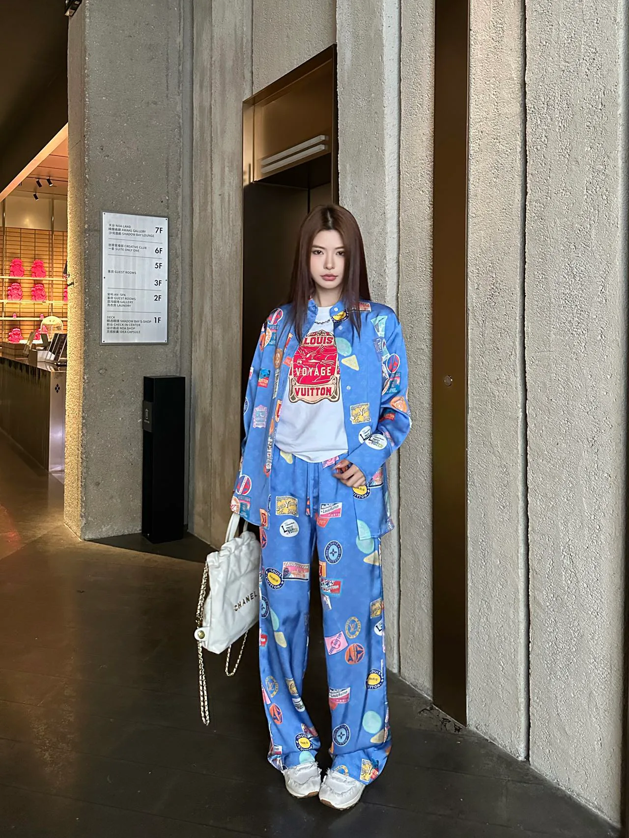 Яркий синий цвет и разнообразные принты, включая узнаваемые логотипы Louis Vuitton, придают образу выразительность и современный шарм. Дизайн отличается оригинальными элементами, которые подчеркивают индивидуальность.