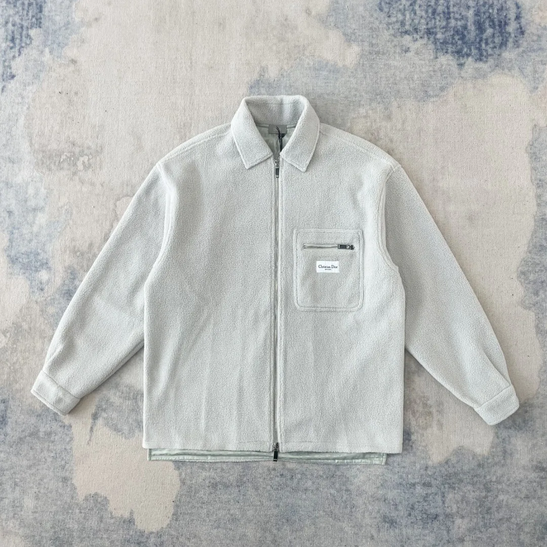Куртка женская CHRISTIAN DIOR — изделие из смеси хлопка и полиэстера с флисовой фактурой весом 330 г/м². Подкладка выполнена из 100% нейлона 75D и имеет цветную жакардовую фактуру. На передних карманах расположена нашивка с буквенным узором, выполненная из японской белой пряжи. Центральная застежка-молния с двумя бегунками цвета платина. На манжетах круглые алюминиевые застежки с фирменным знаком.