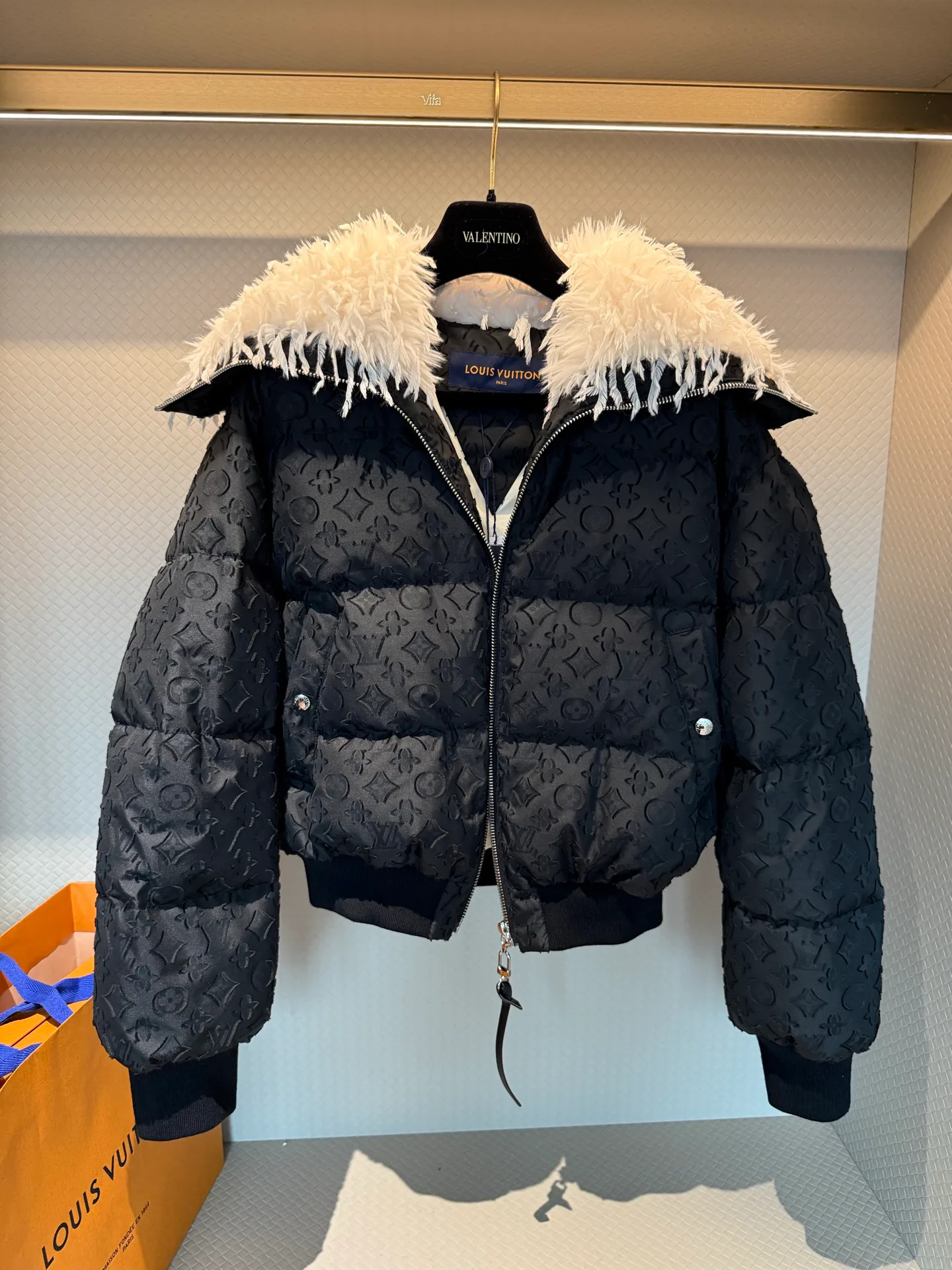 Куртка женская LOUIS VUITTON — пуховик с коротким кроем и съёмным воротником из овчины ягненка. Внешний слой с тёмным монограммным узором создаёт сдержанный, но роскошный вид. Внутренняя подкладка наполнена высококачественным пухом, обеспечивая хорошую теплоизоляцию. Карманы на защёлках и эластичные манжеты обеспечивают удобство и аккуратный силуэт. Черный основной цвет делает вещь универсальной и легко сочетается с разными образами.