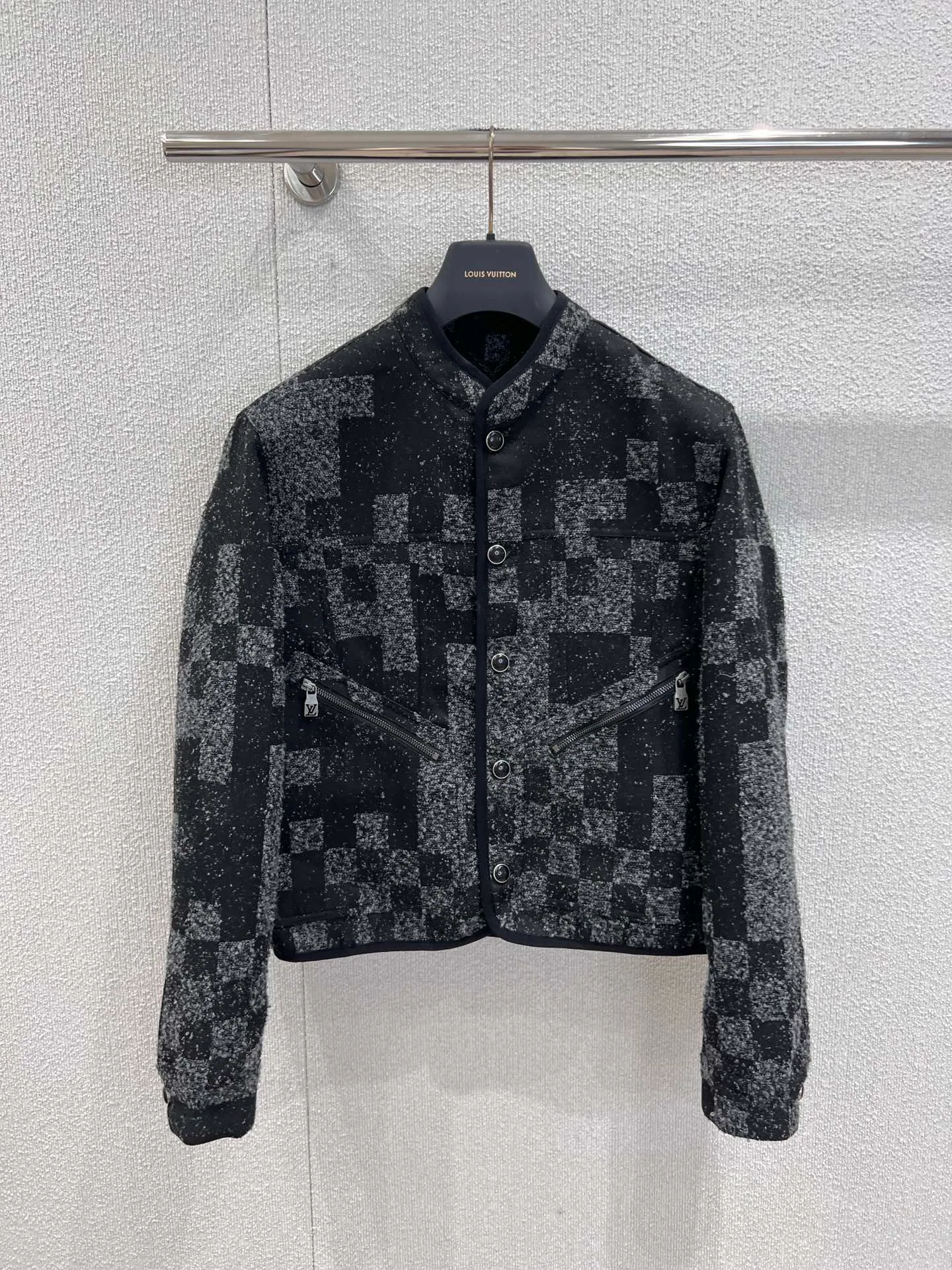 Куртка женская LOUIS VUITTON — короткая деним-куртка в шахматной клетке на осень и зиму. Воротник-стойка и металлическая кнопочная планка создают строгий, динамичный образ. Ткань деним с черно-серебристой шахматной фактурой имеет легкий блеск, на спине сдержанно размещён фирменный знак. Рукава и низ изделия обработаны по краю, что сохраняет аккуратный силуэт. Доступны размеры S, M, L.