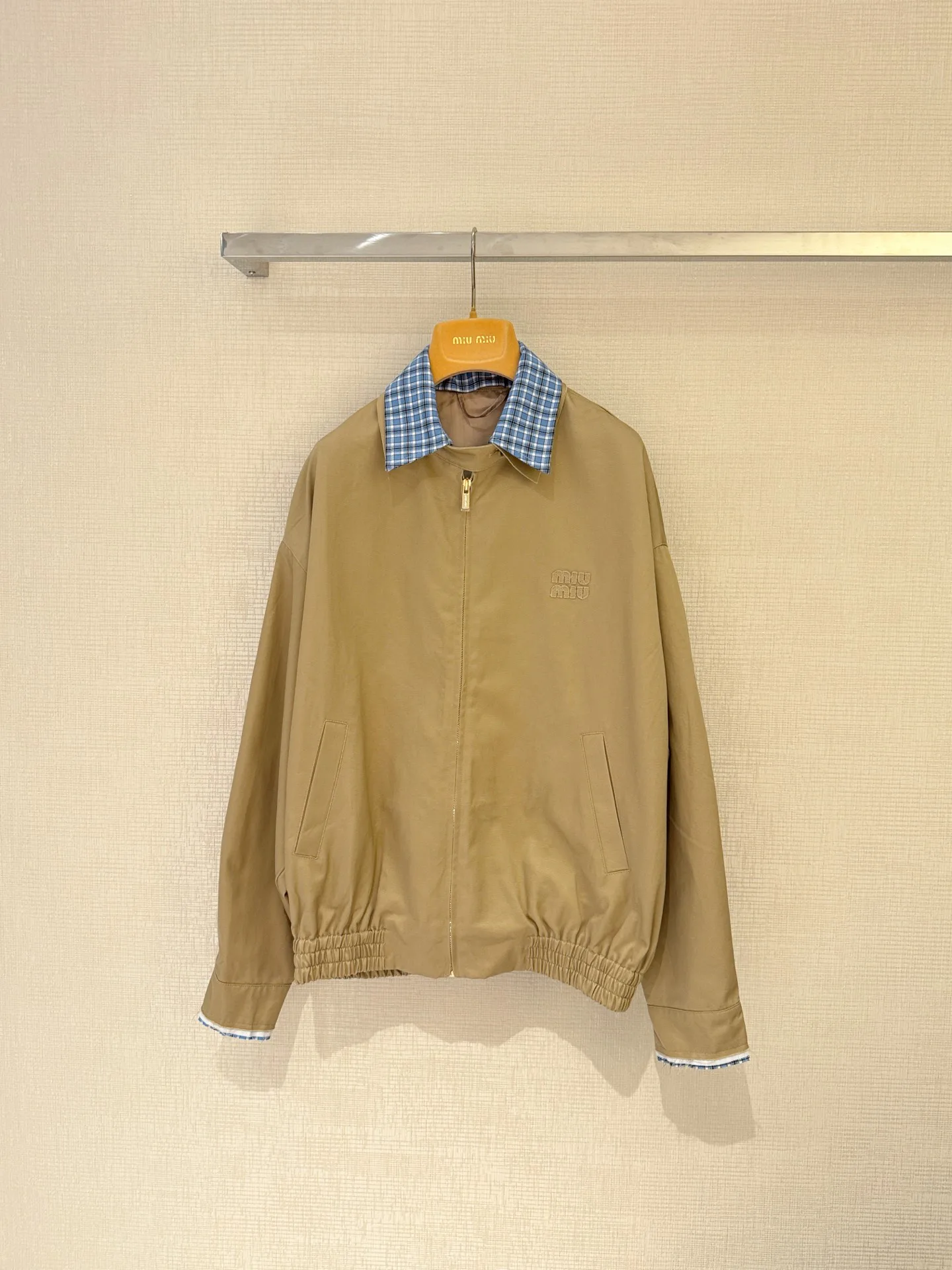 Куртка женская MIU MIU — ретро-литературный стиль в хаки, предназначенная для ранней весны. С отстегиваемым воротником в голубую клетку она сочетает декоративную деталь и практичность. Дизайн выполнен с имитацией двухслойной конструкции и свободным кроем, что обеспечивает универсальность и комфорт. На текстильной нашивке вышит буквенный логотип, создающий сдержанную роскошь, а отделка демонстрирует безупрочную работу над деталями. Размеры S, M, L доступны.