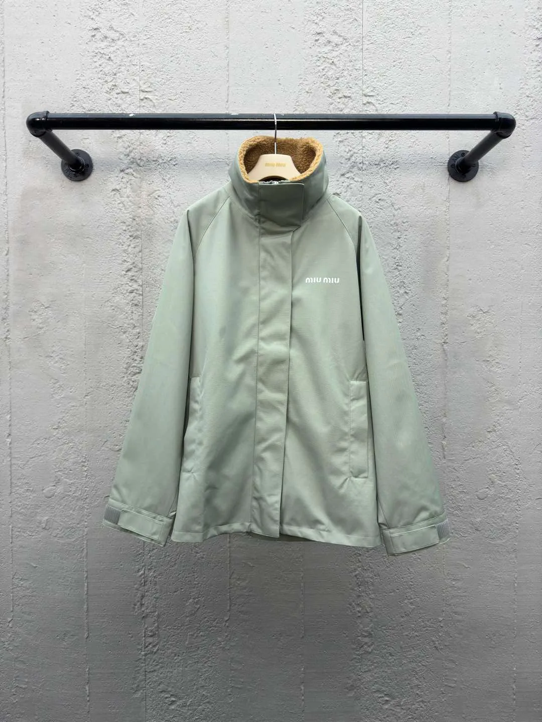 Куртка женская MIU MIU — модель с воротником-стойкой и вставками из овчины, выполненная из импортированного нейлона, плотного и держит форму. Застежка по переду выполнена с невидимой молнией, что обеспечивает чистый силуэт и удобство надевания. На груди добавлена вышивка букв бренда и липучка для дополнительной фиксации. Швы ровные и аккуратные, ткань мягкая и приятная на ощупь; цвет зелёный без цветовых отклонений, на изделии три ярлыка. Размеры S, M, L.