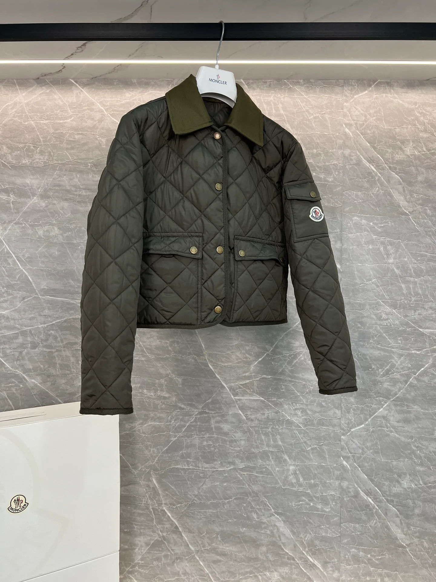 Куртка женская MONCLER — укороченная куртка-рубашка с отложным воротником и ромбовидной стёжкой.