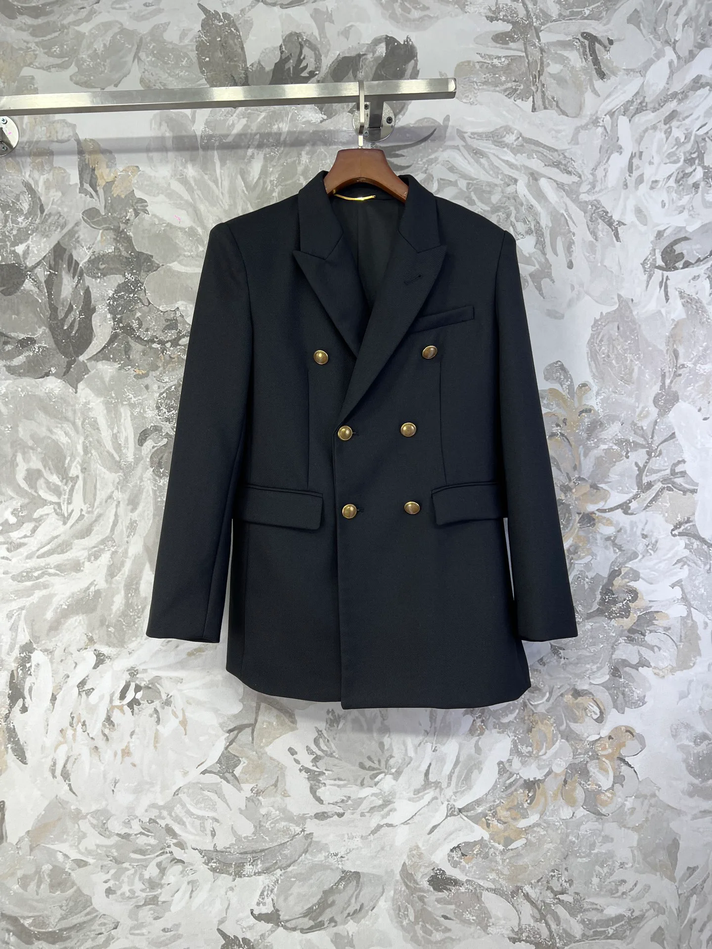 Лацканы пикированного типа, карманы с клапаном и металлическая двухрядная застежка на пуговицах.