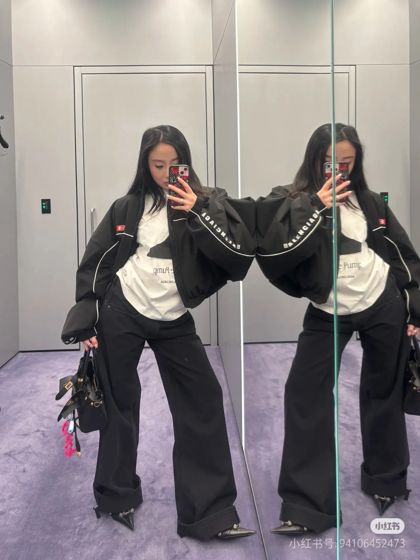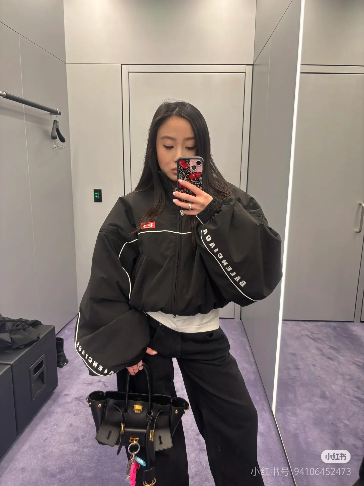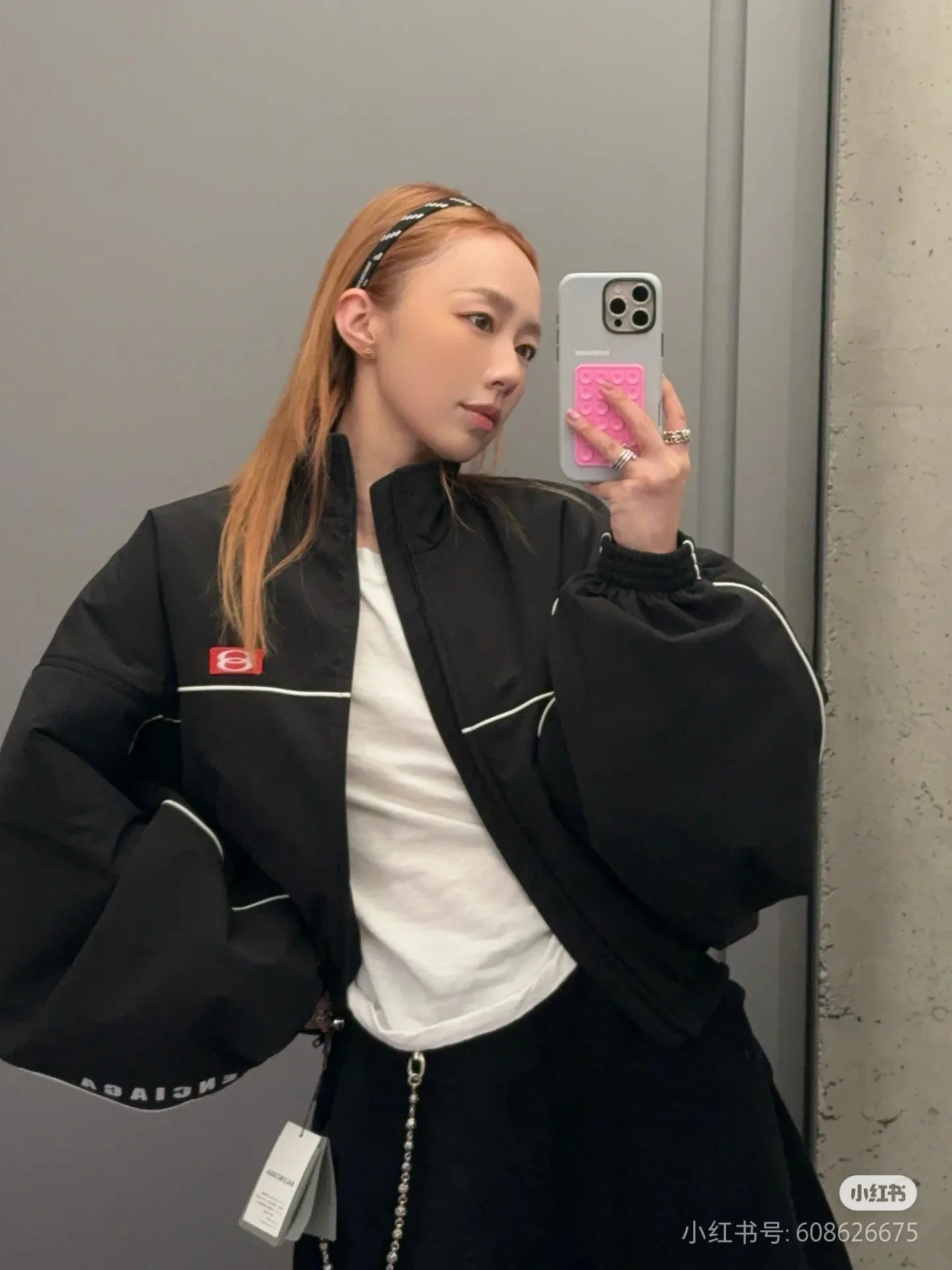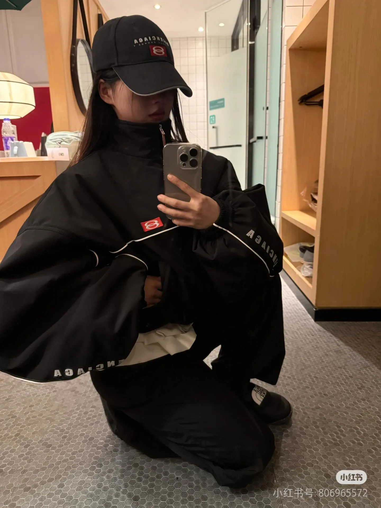 Куртка выполнена в черном цвете и имеет уникальный силуэт, подчеркнутый белыми линиями, которые придают изделию динамичность и оригинальность. На рукавах можно увидеть яркий логотип BALENCIAGA, который свидетельствует о высоком статусе и качестве данного аксессуара.