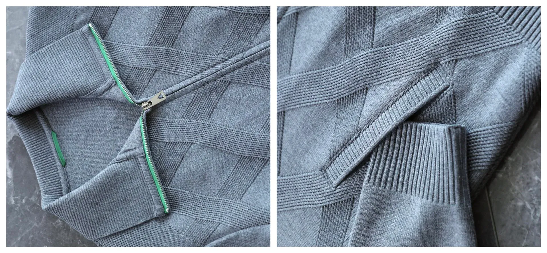 - Ровная односторонняя жаккардовая вязка: вся куртка связана одной 9‑игольной жаккардовой вязкой без видимых нитей и узлов; внешний вид напоминает готовое изделие премиум‑класса.