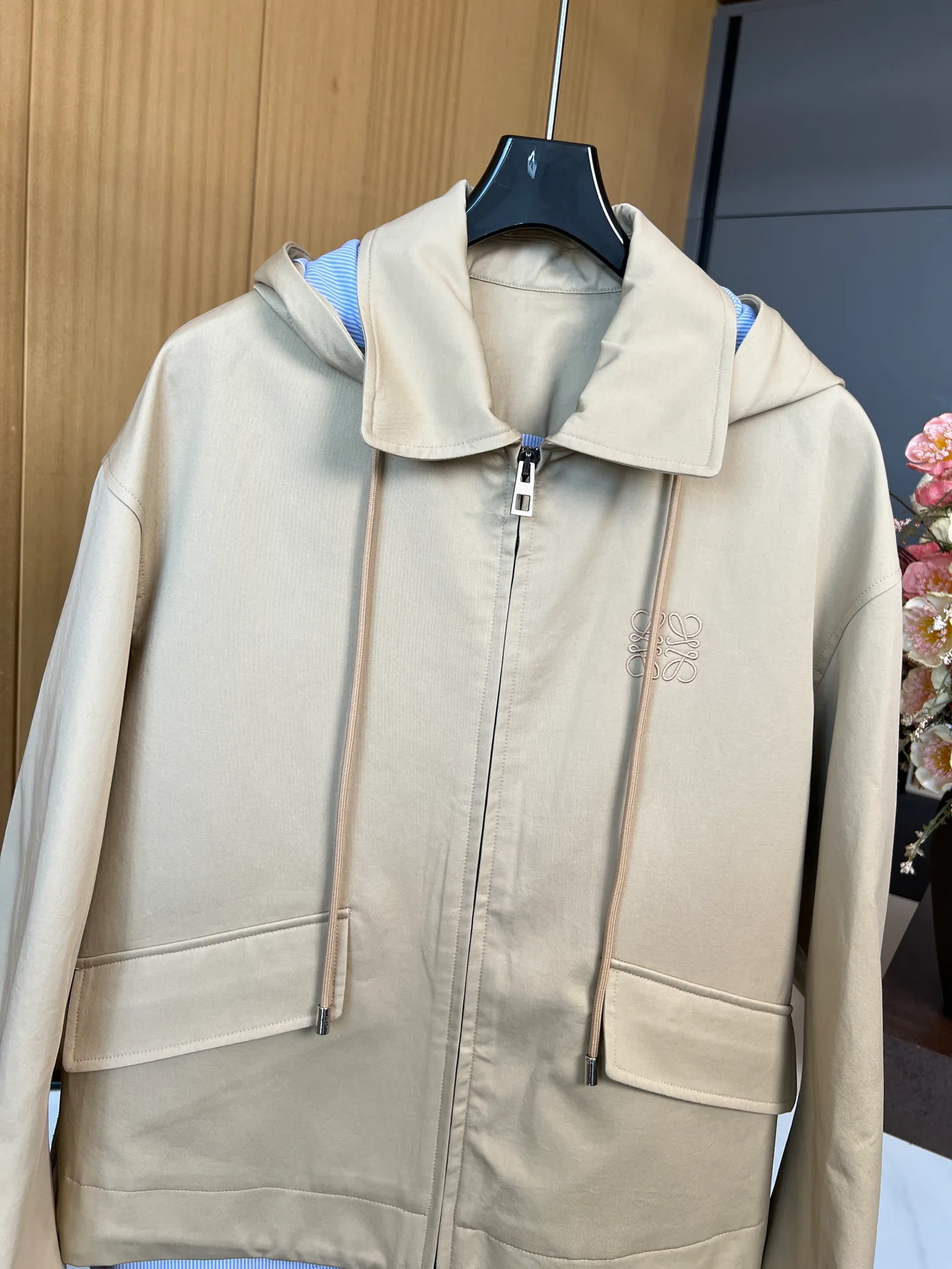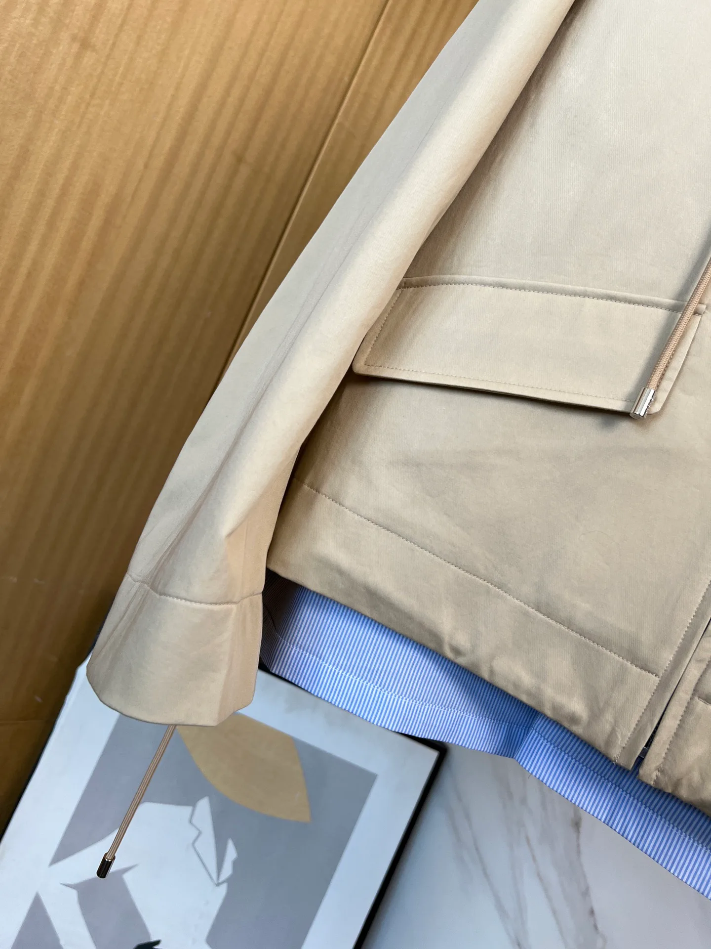 - Цвет и ткань: основная часть изделия выполнена в светло-хаки, что придает спокойный и универсальный оттенок; внутренняя подкладка сделана из ткани синего цвета в полоску, напоминающей рубашечную ткань, добавляя контраста и глубины образу.