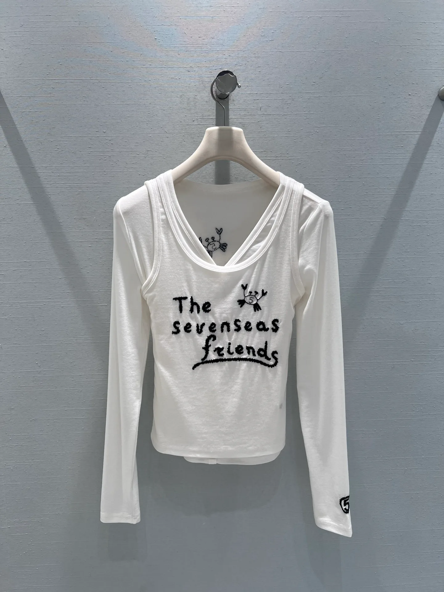 Лонгслив женский CHANEL — модель из ранней весенней коллекции 2026 года, выполненная в виде стилизованной двуслойной блузы. Изделие сшито из высокоэластичной и мягкой ткани, приятной на ощупь, с классическим U-образным вырезом. На груди расположена вышивка с буквами и рисунком краба, а на манжетах — фирменный узор. Модель представлена в нескольких размерах.