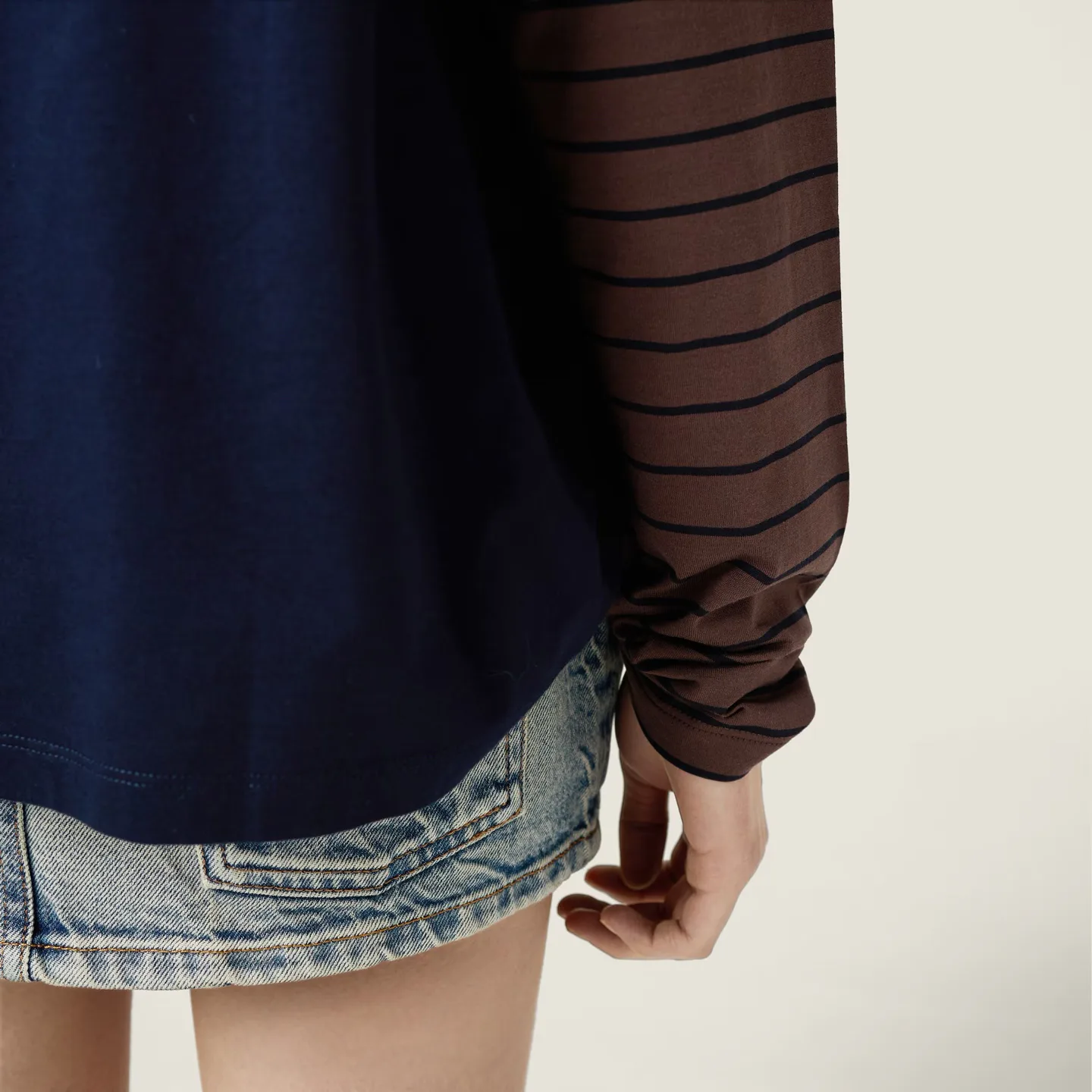 Изготовлен из 100% органического хлопка с плотностью 180 г/м². Трикотажный материал гладкого полотна обладает эластичностью и дышащими свойствами, а текстура ткани приятна на ощупь и сохраняет форму. Основной цвет лонгслива — темно-синий, рукава оформлены коричневыми полосами для создания стильного контраста. Этот топ подходит для повседневной носки в осенний и зимний период, легко сочетается с джинсами и брюками.