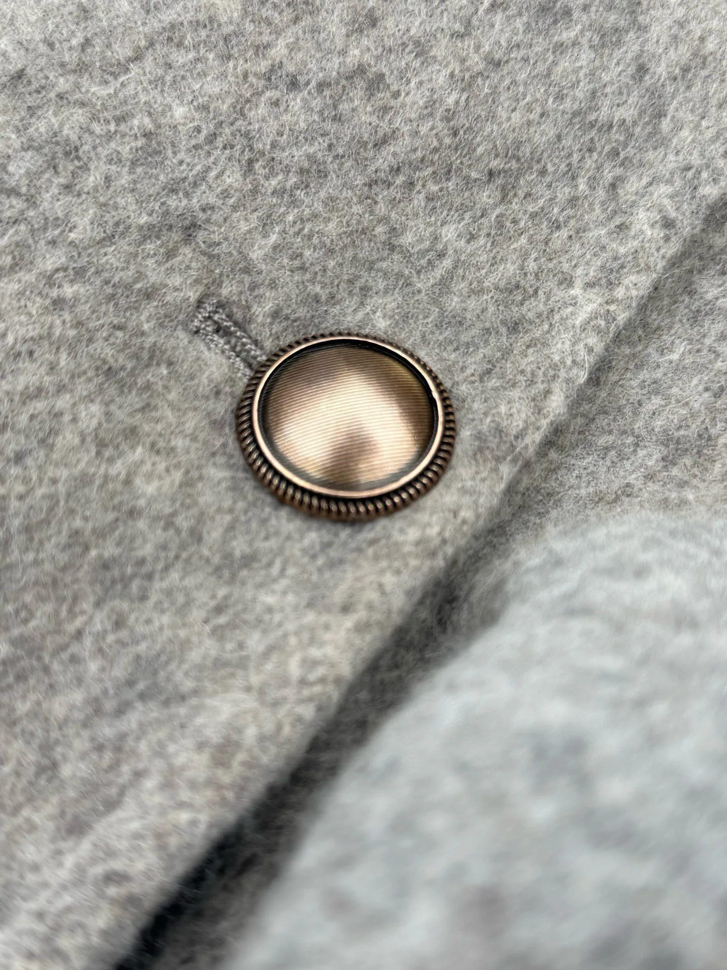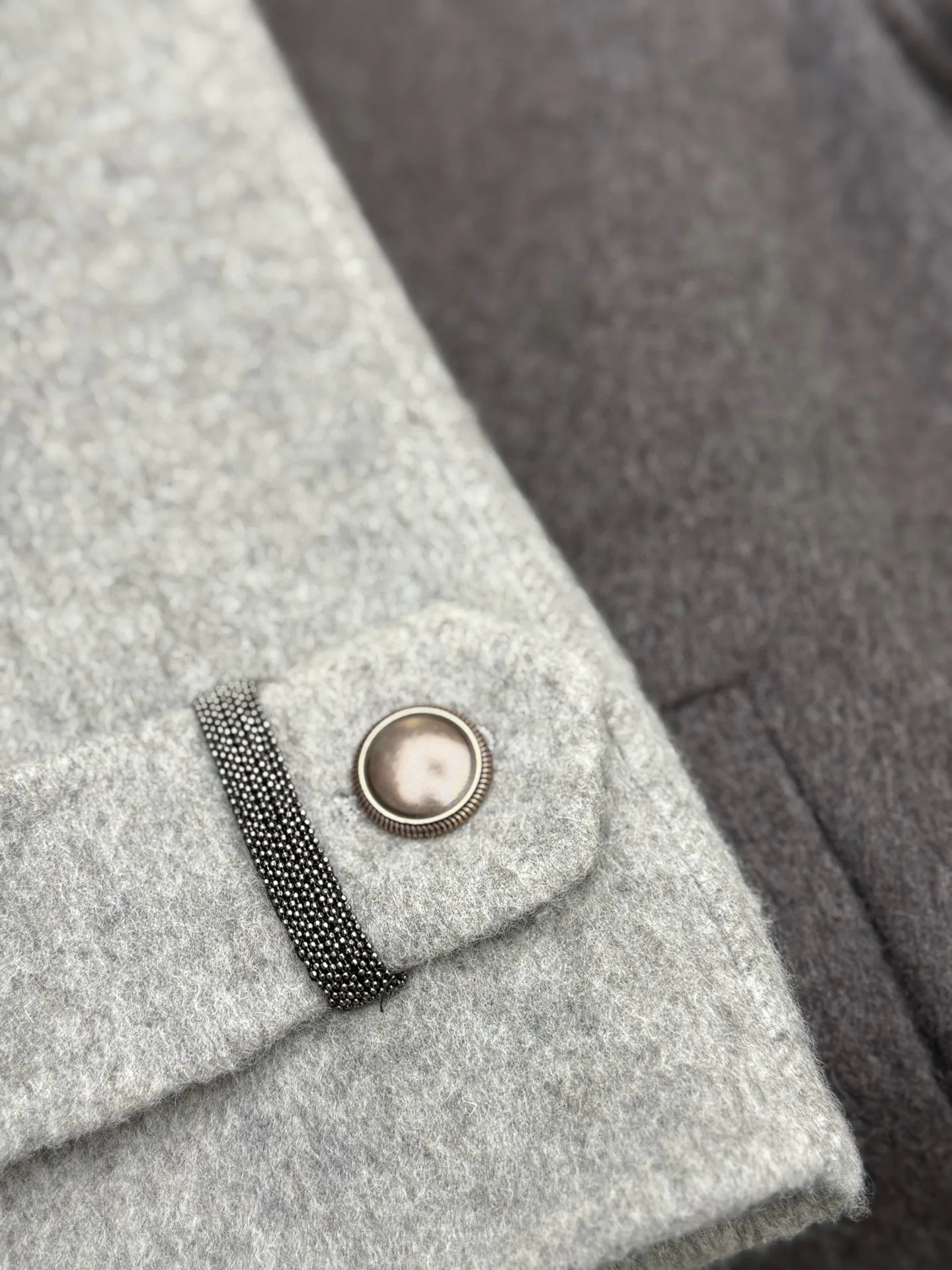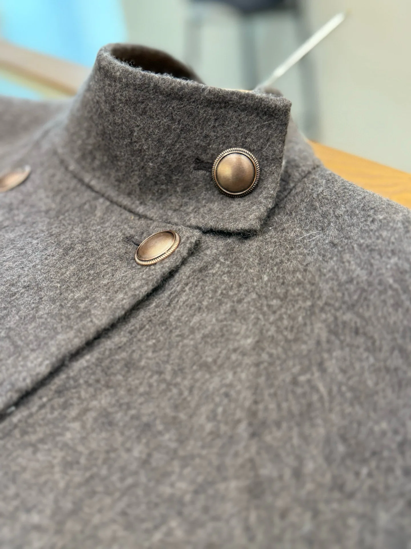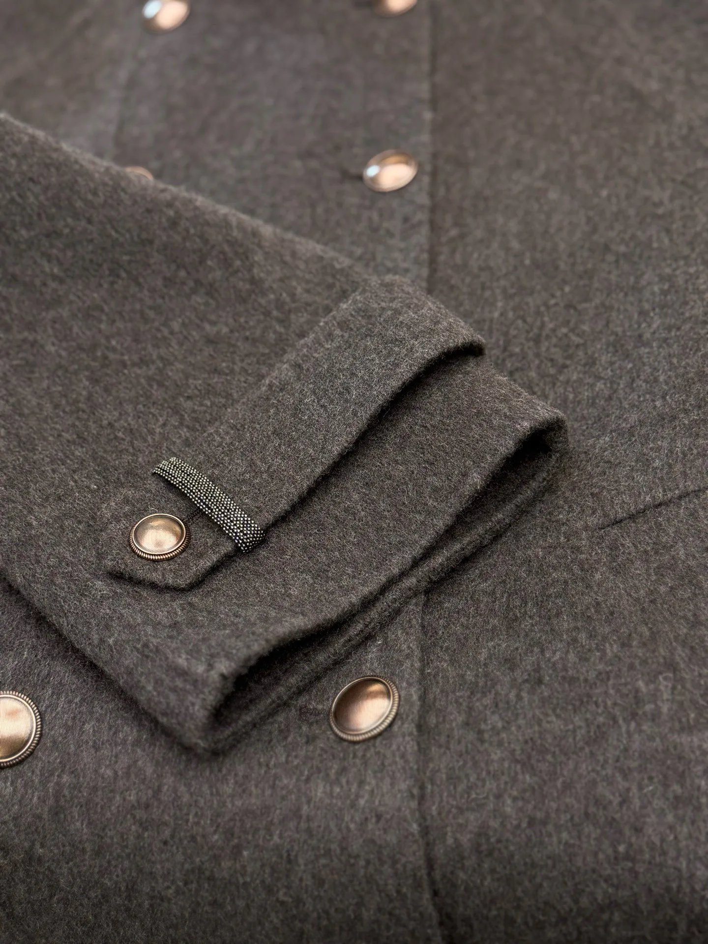 - Пуговицы: двойной ряд золотисто-черного оттенка формирует классический силуэт.