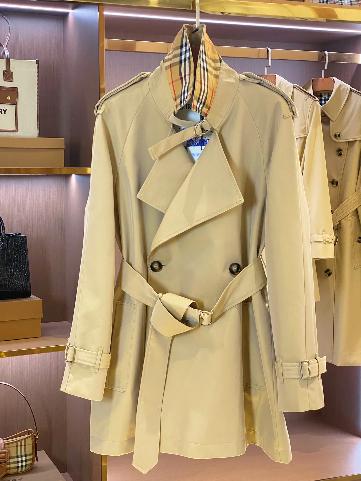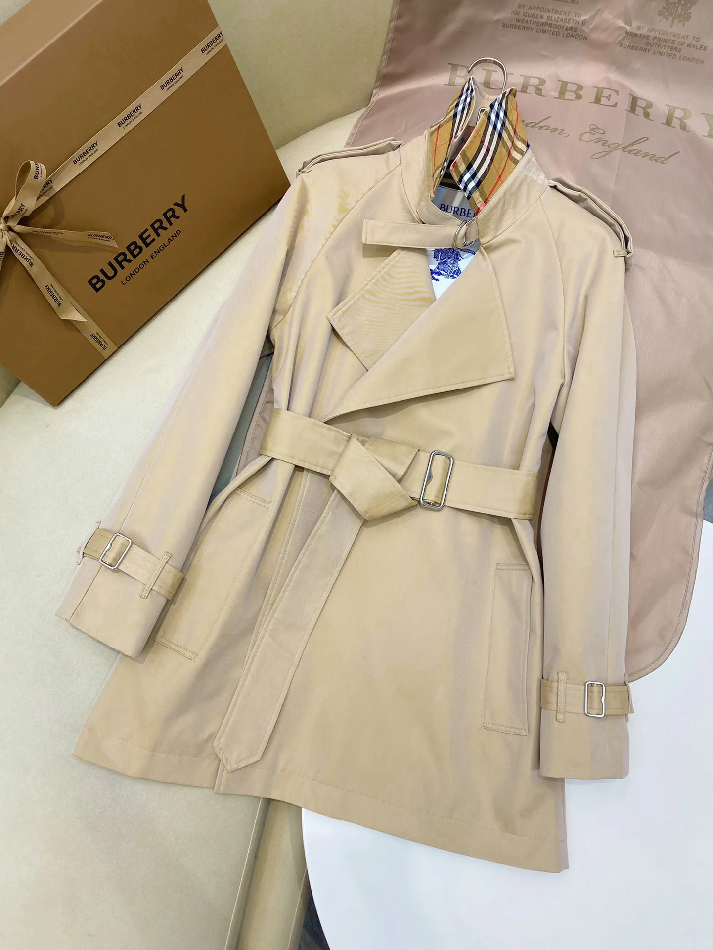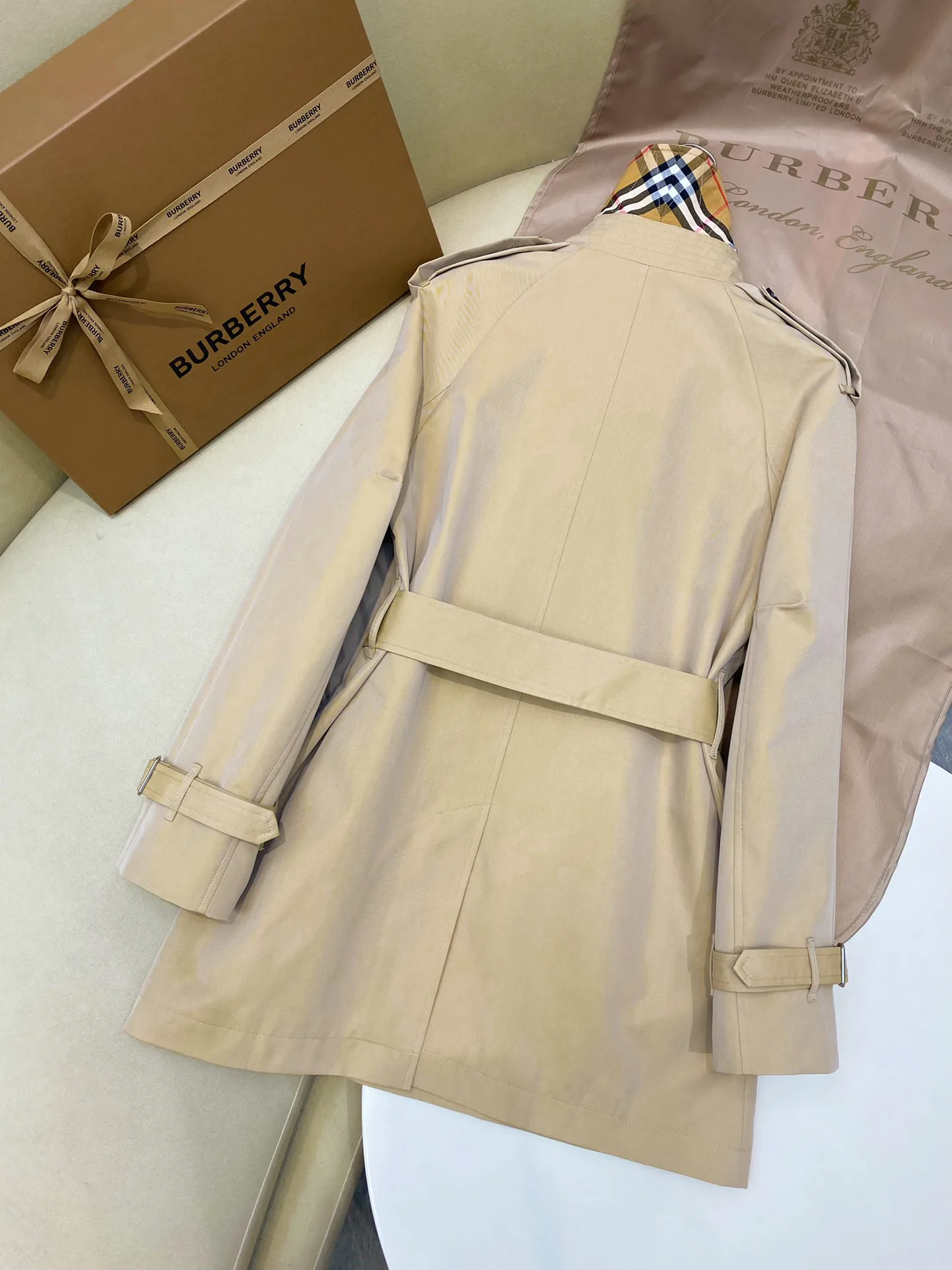 Дизайн вдохновлен классическим стилем BUR и имеет легкую конструкцию с втачными рукавами. Плащ имеет двубортную застежку, аккуратные плечевые детали и D-образный воротник. Пояс из B-образного металла подчеркивает силуэт, рукава с резинкой и задний разрез добавляют практичности.