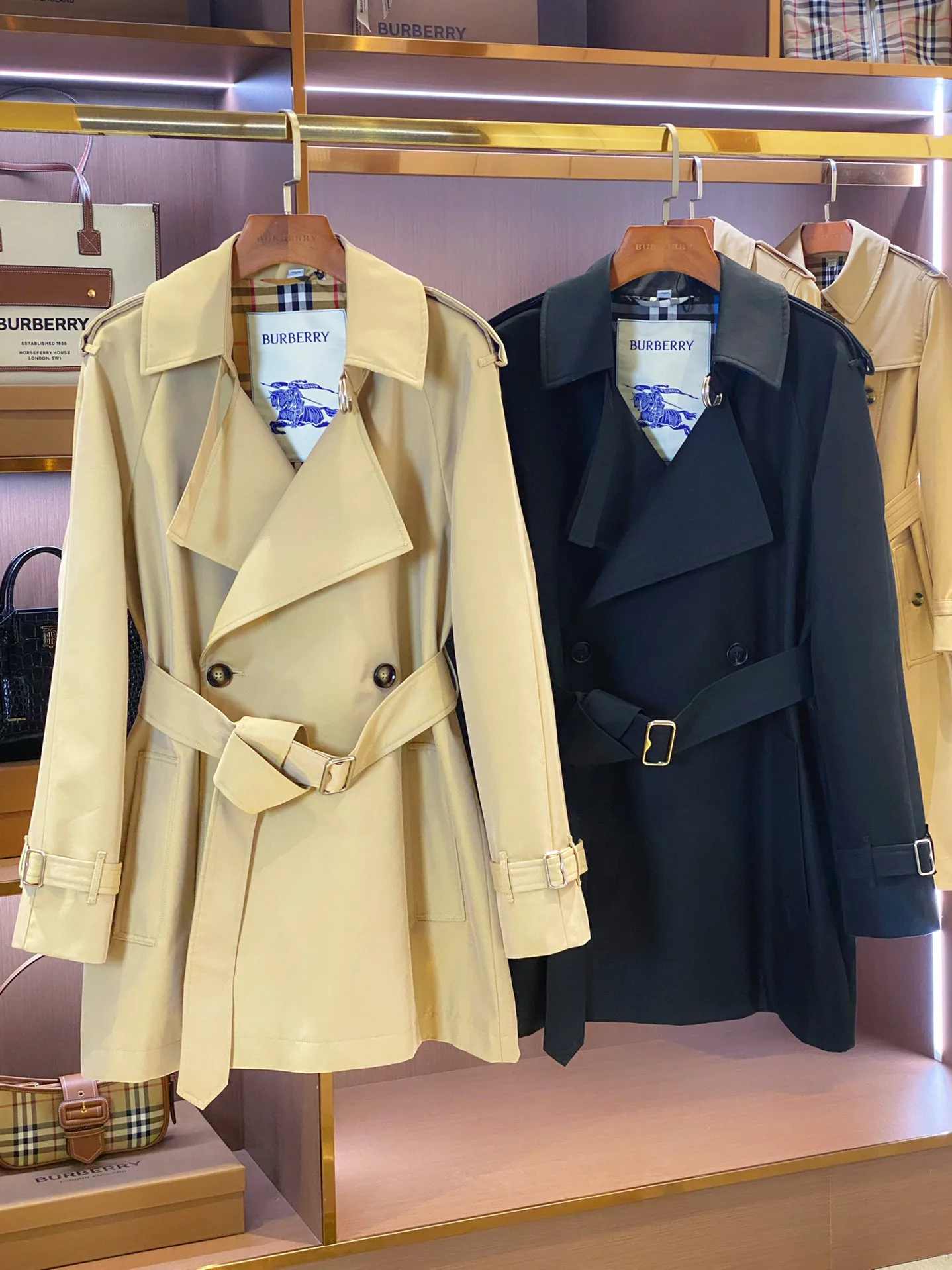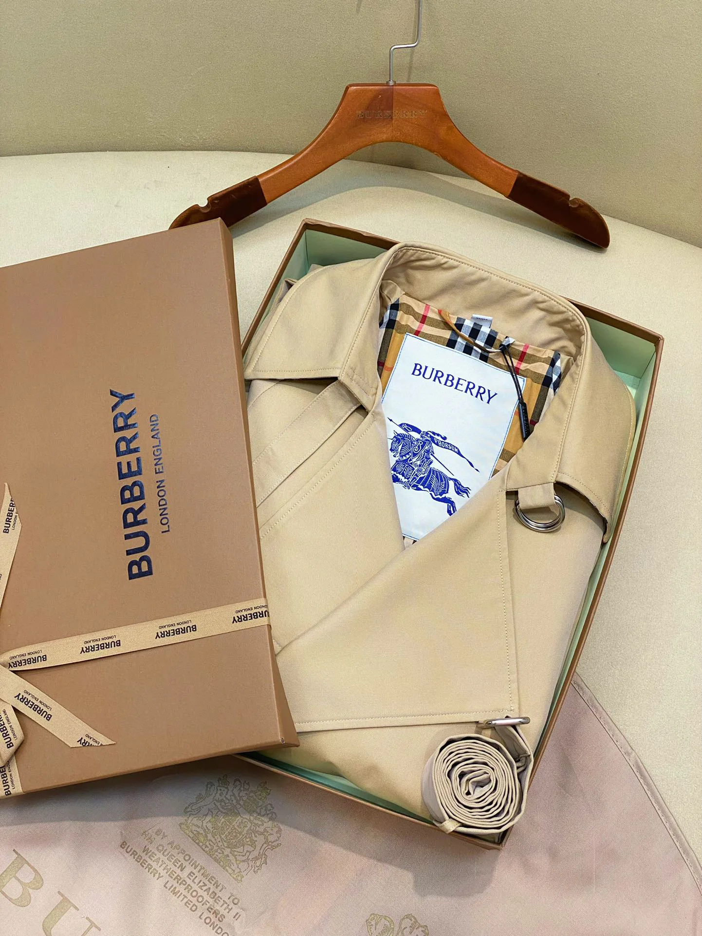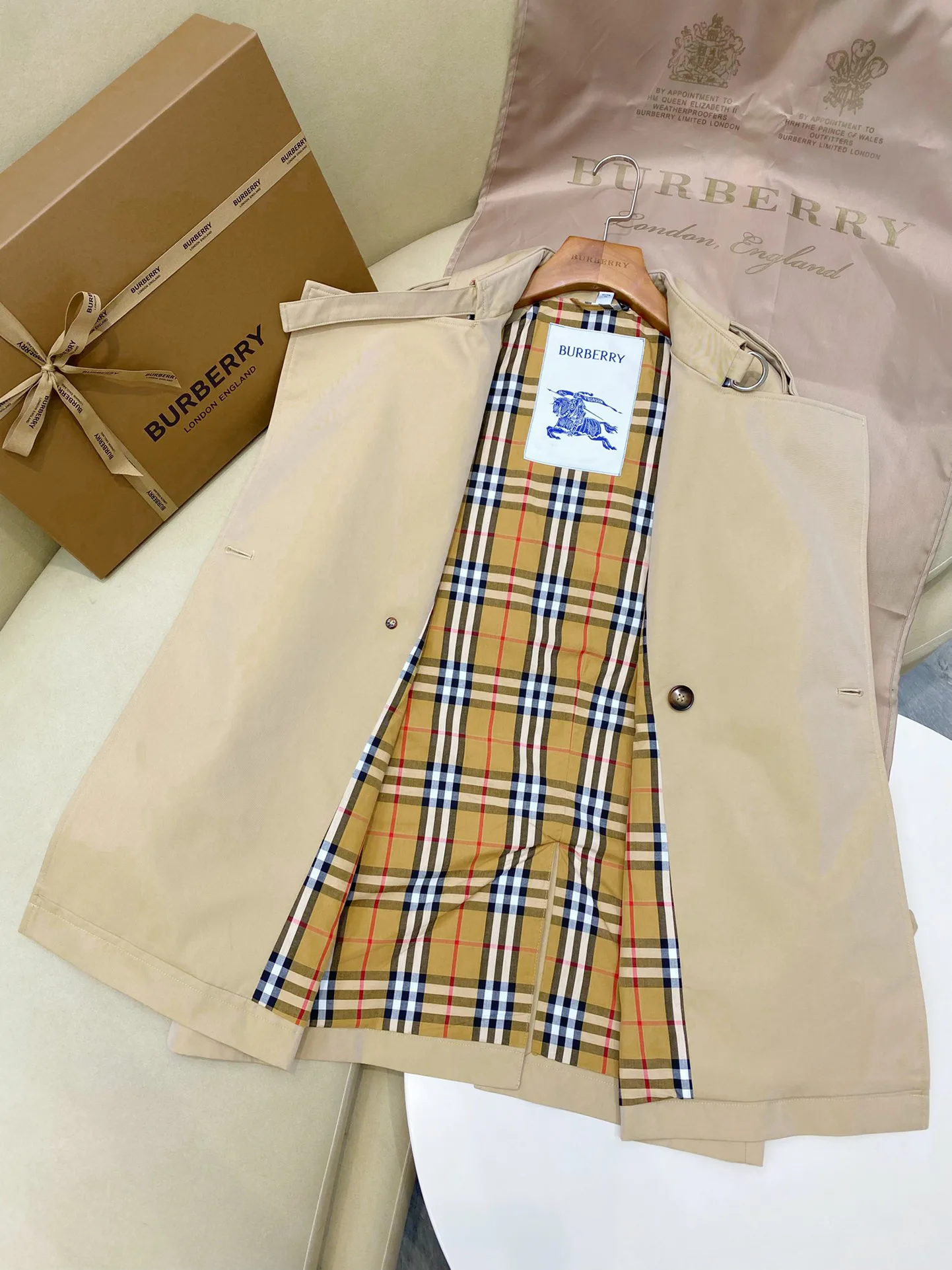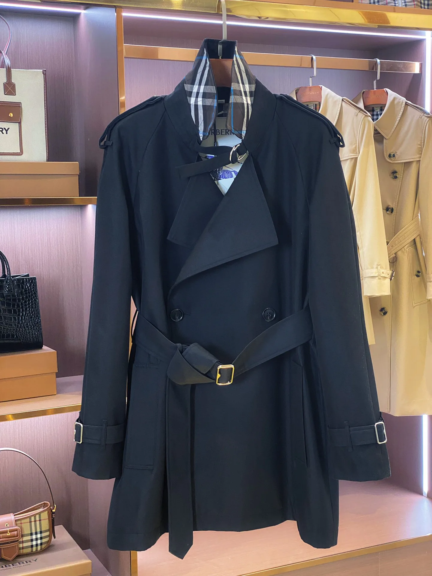 Дизайн вдохновлен классическим стилем BUR и имеет легкую конструкцию с втачными рукавами. Плащ имеет двубортную застежку, аккуратные плечевые детали и D-образный воротник. Пояс из B-образного металла подчеркивает силуэт, рукава с резинкой и задний разрез добавляют практичности.