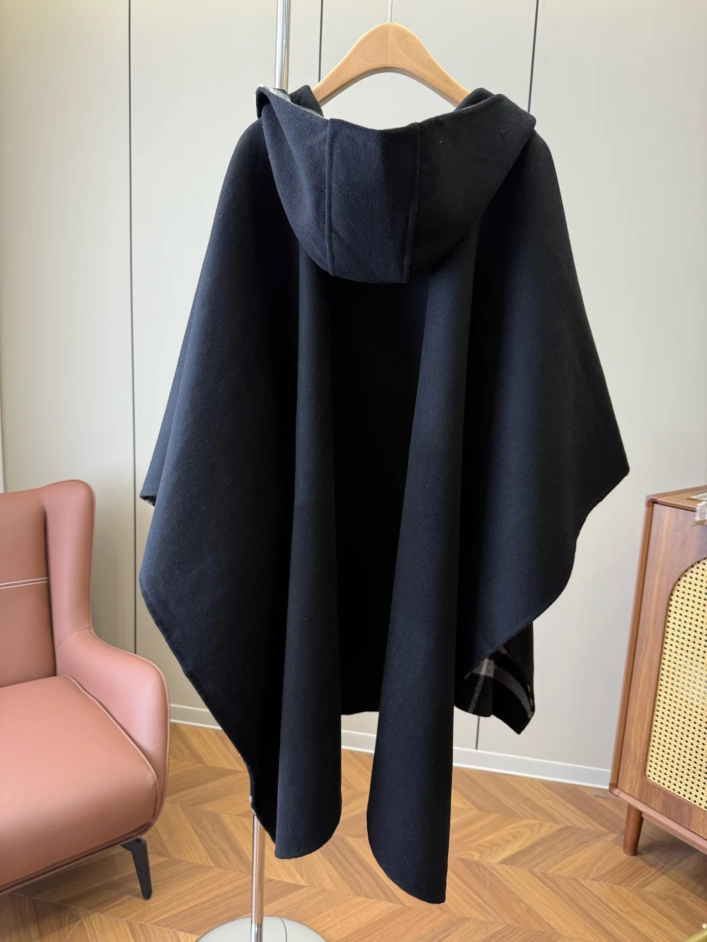 Пелерина может носиться с обеих сторон, позволяя менять стиль без дополнительных деталей. Форма напоминает ведьминскую шляпу, добавляя оригинальности.