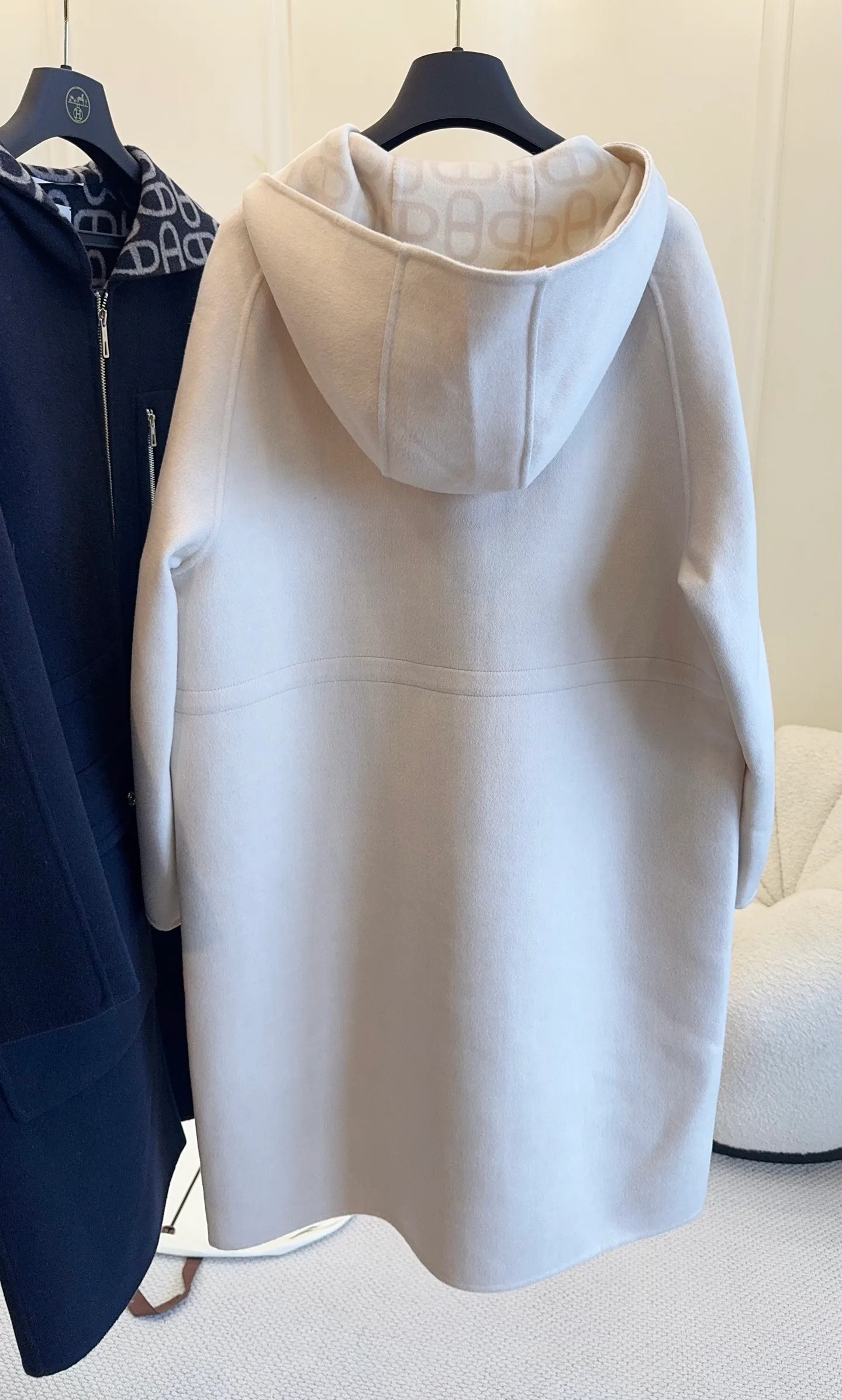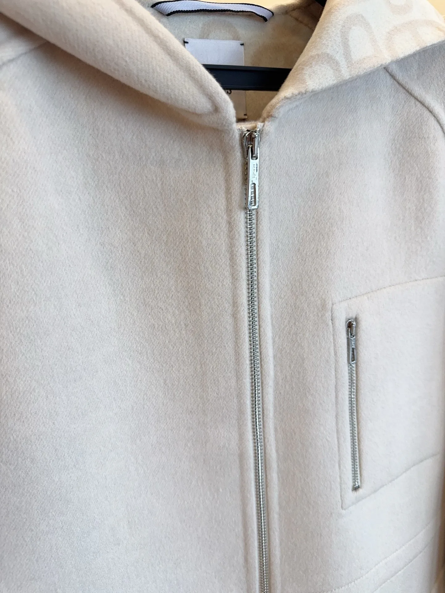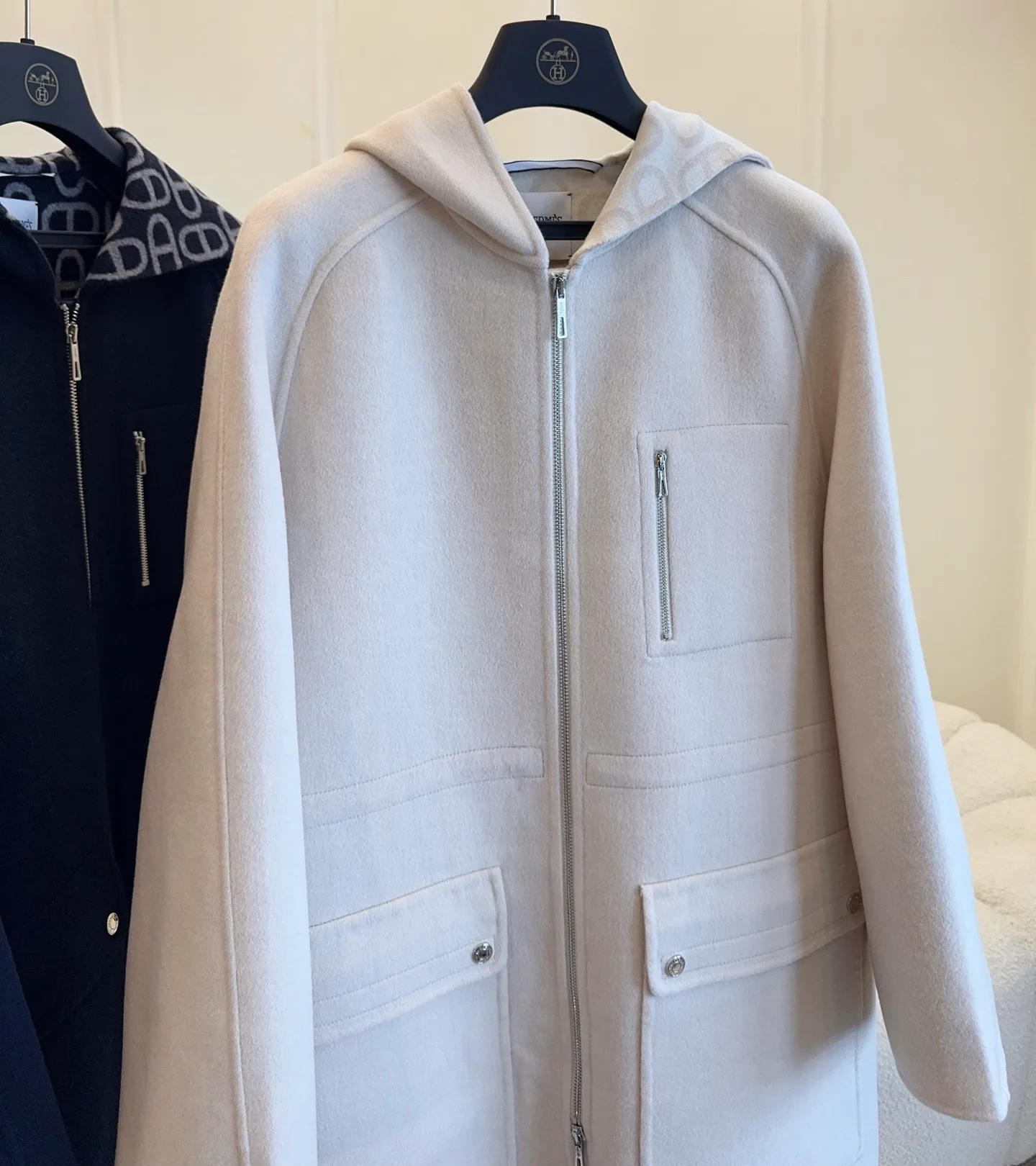 Капюшон придает образу молодежный вид и повышает практичность в непогоду. Все металлические элементы выполнены по индивидуальному заказу и украшены фирменным логотипом, подчеркивающим эксклюзивность изделия. Пальто доступно в двух цветовых вариантах, что позволяет легко адаптироваться под различные стили — от повседневного до более строгого.