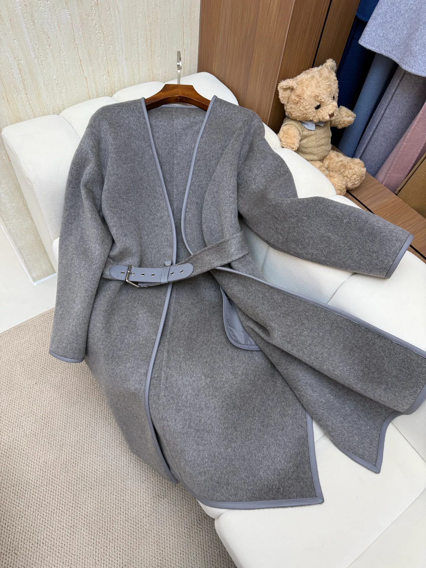 Края обработаны окантовкой из натуральной кожи, что добавляет элегантности внешнему виду. Пальто подходит для повседневной носки в прохладную погоду и стильных городских образов.