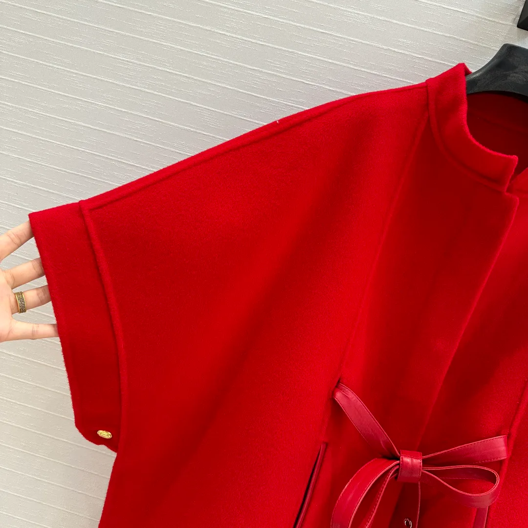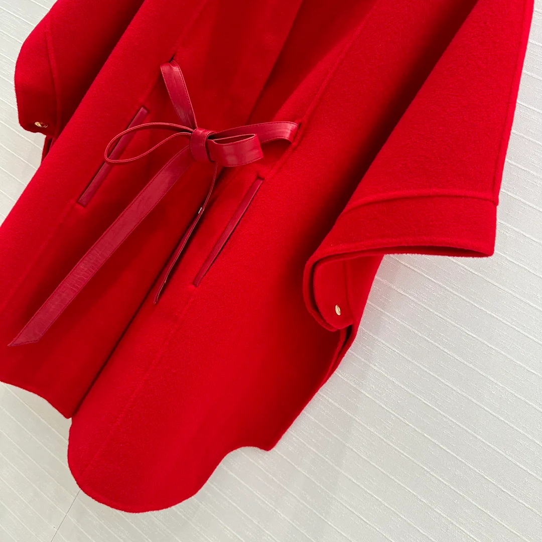 Застёжка на кнопки; кожаный пояс подчёркивает талию и силуэт.