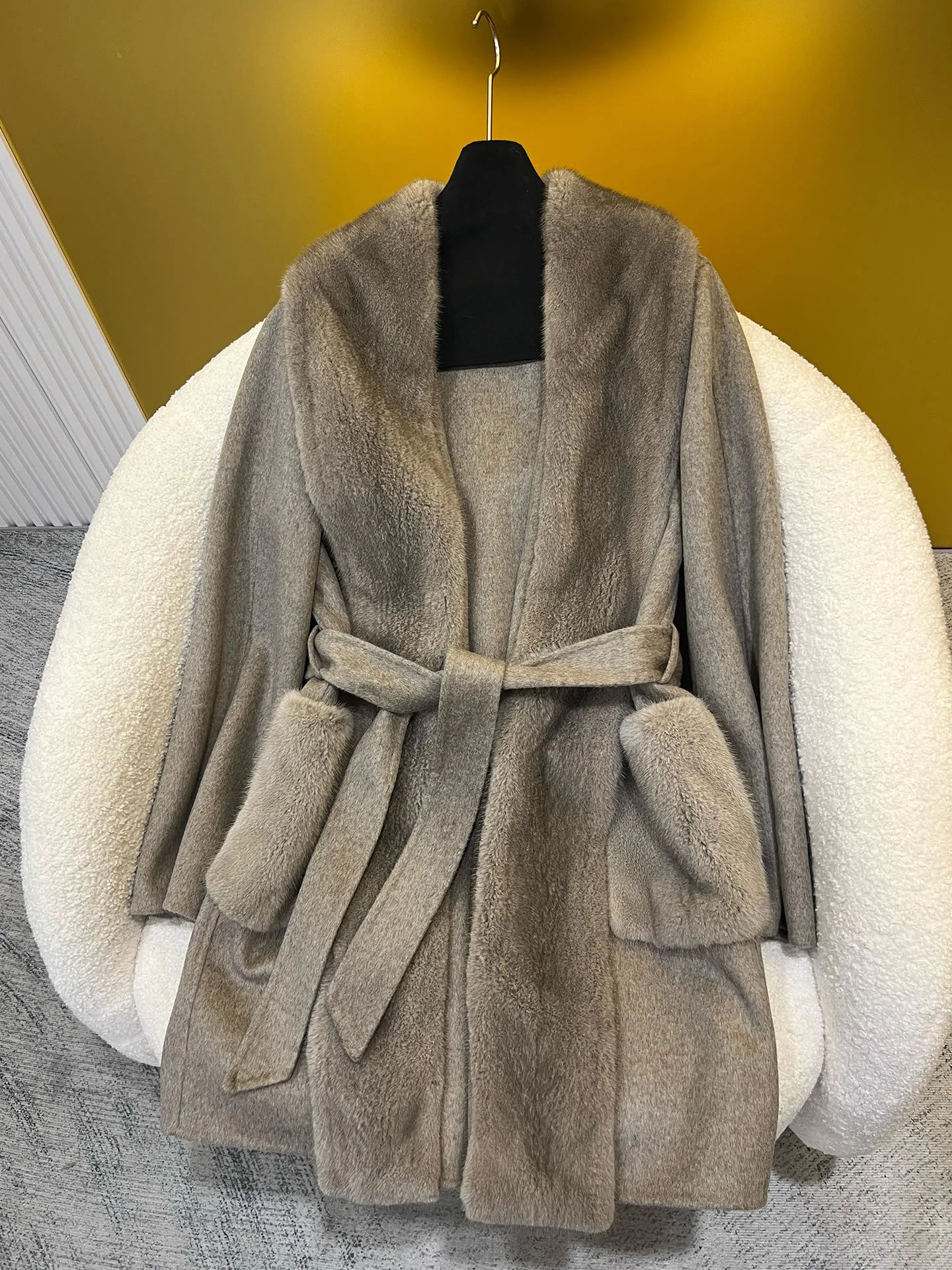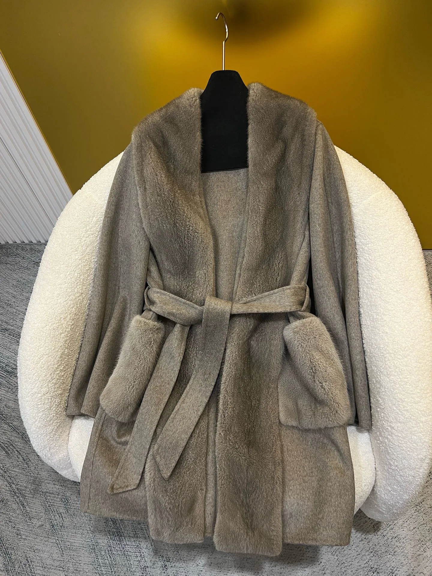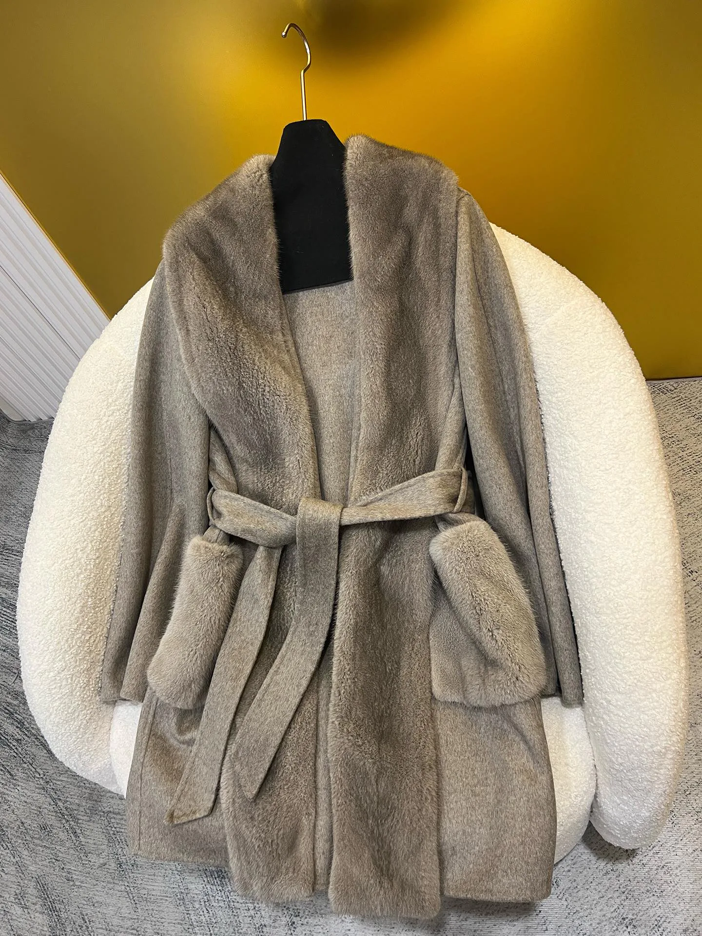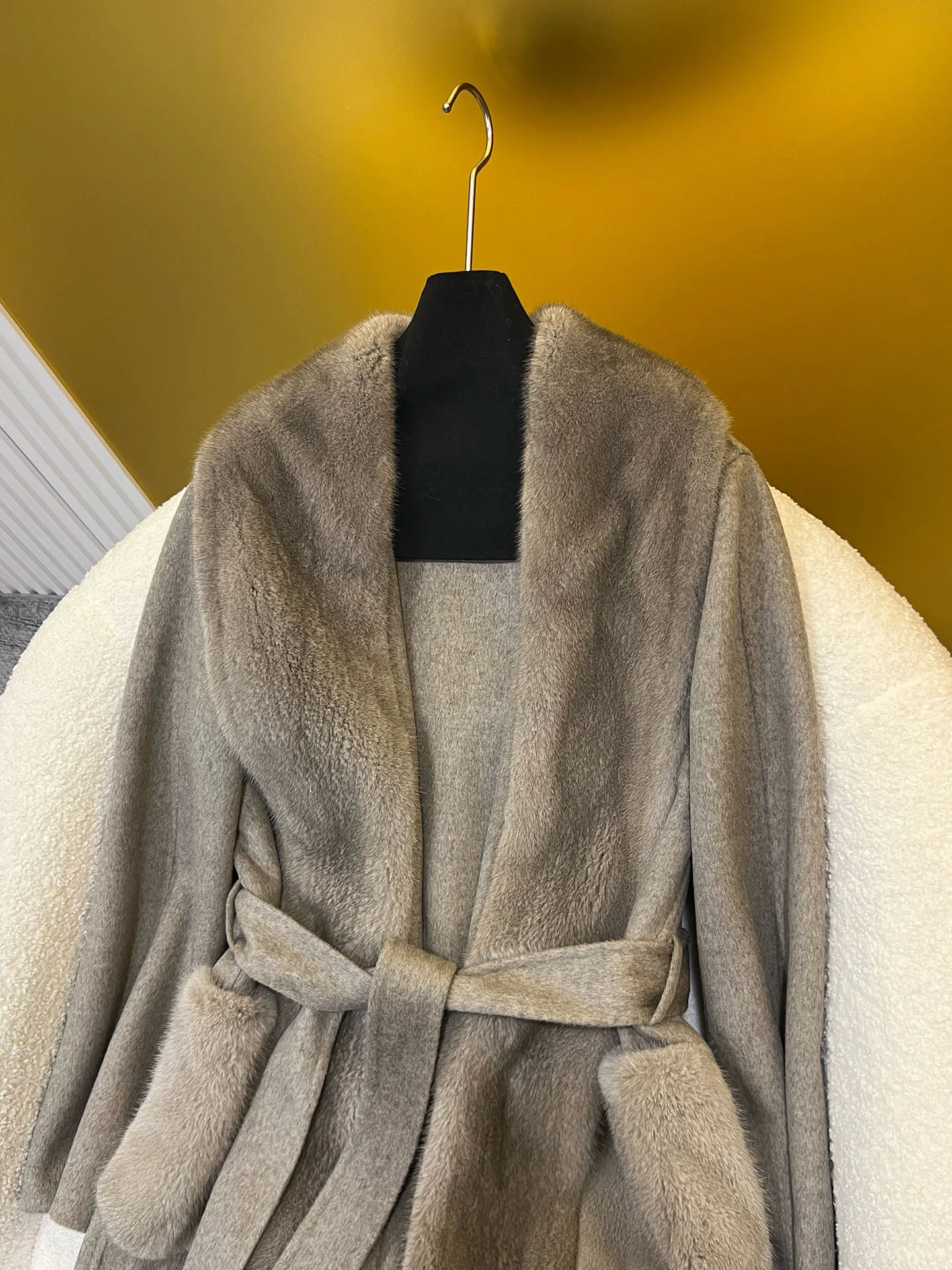 Материалы и уход: материал — импортированный кашемир; отделка воротника/планки — импортированная норка. Уход: сухая чистка.