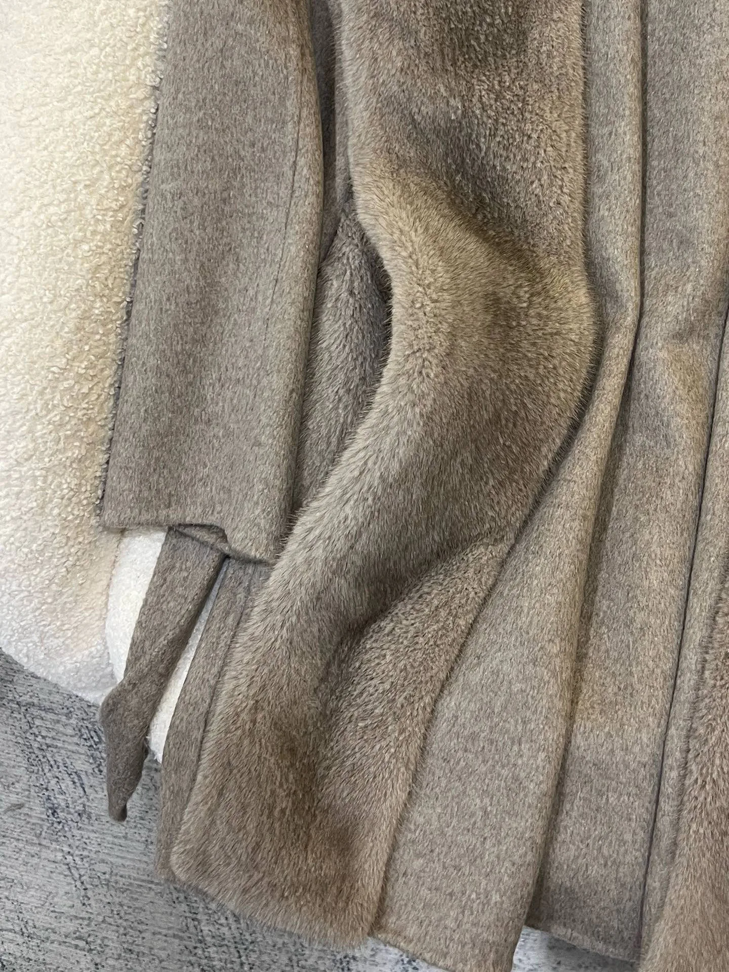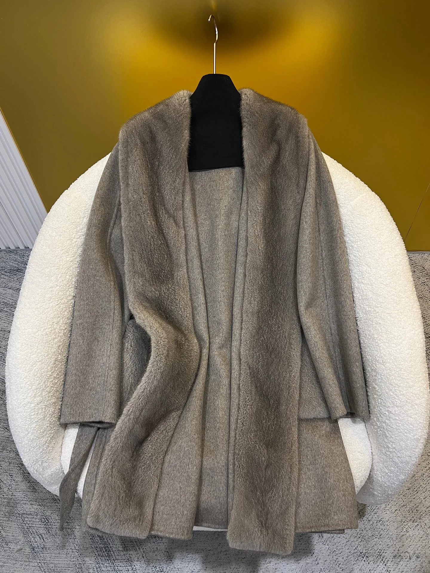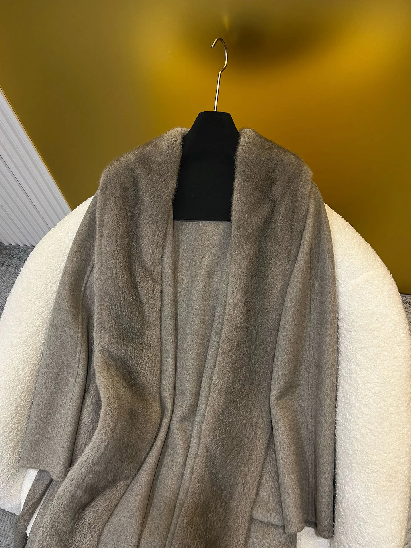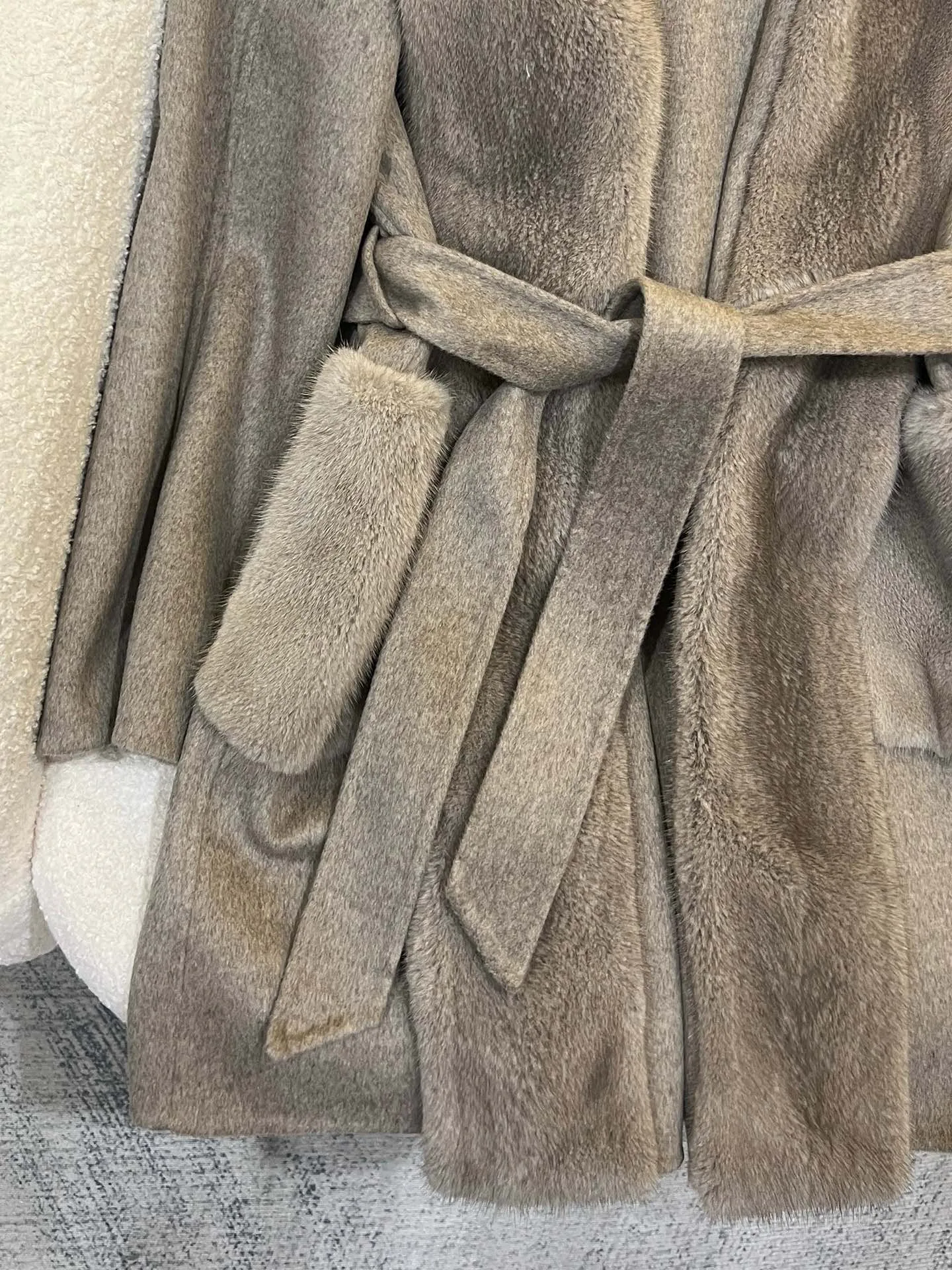 Материалы и уход: материал — импортированный кашемир; отделка воротника/планки — импортированная норка. Уход: сухая чистка.