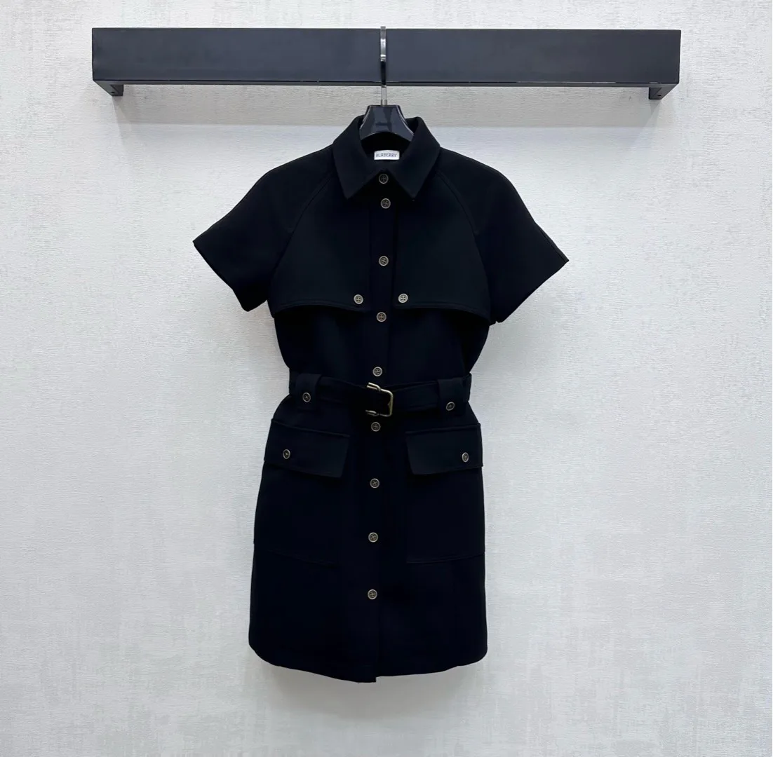 Платье женское BURBERRY — с отложным воротником и поясом, выполнено в современном приталенном крое. Материал описан как импортированная ткань для пальто, обладает качественной фактурой и обеспечивает комфортную посадку. В изделии используются кнопки с фирменной буквенной символикой, что подчёркивает стиль бренда и позволяет регулировать посадку. Пояс с отверстиями по талии фиксирует форму и эффективно делит пропорции, добавляя дизайна. Передняя часть плавно переходит к спинке с декоративной накидкой и разрезом по заднему подолу, создавая многослойность. Платье доступно в двух цветовых вариантах. Это стильное и универсальное изделие с британским настроением.