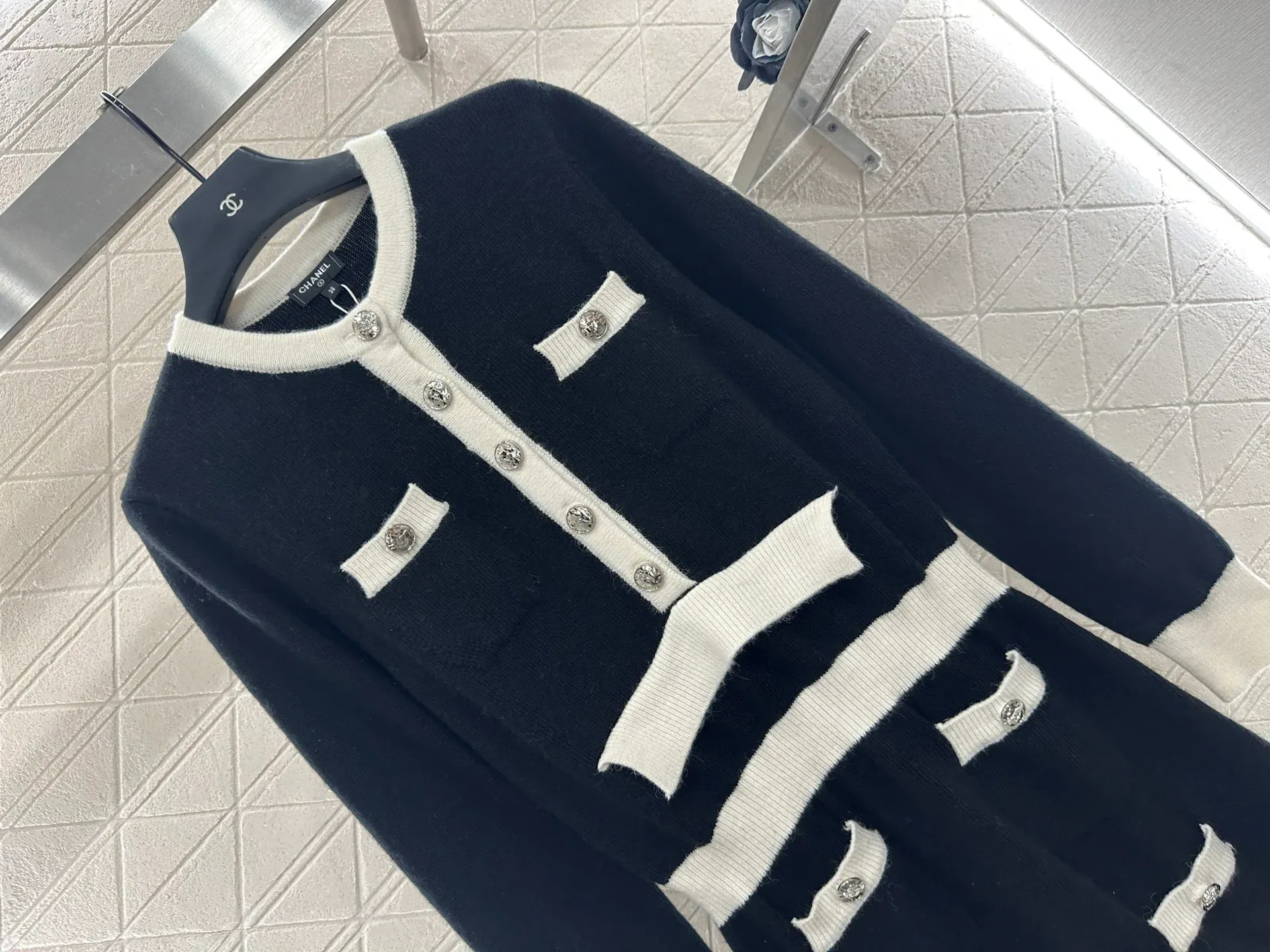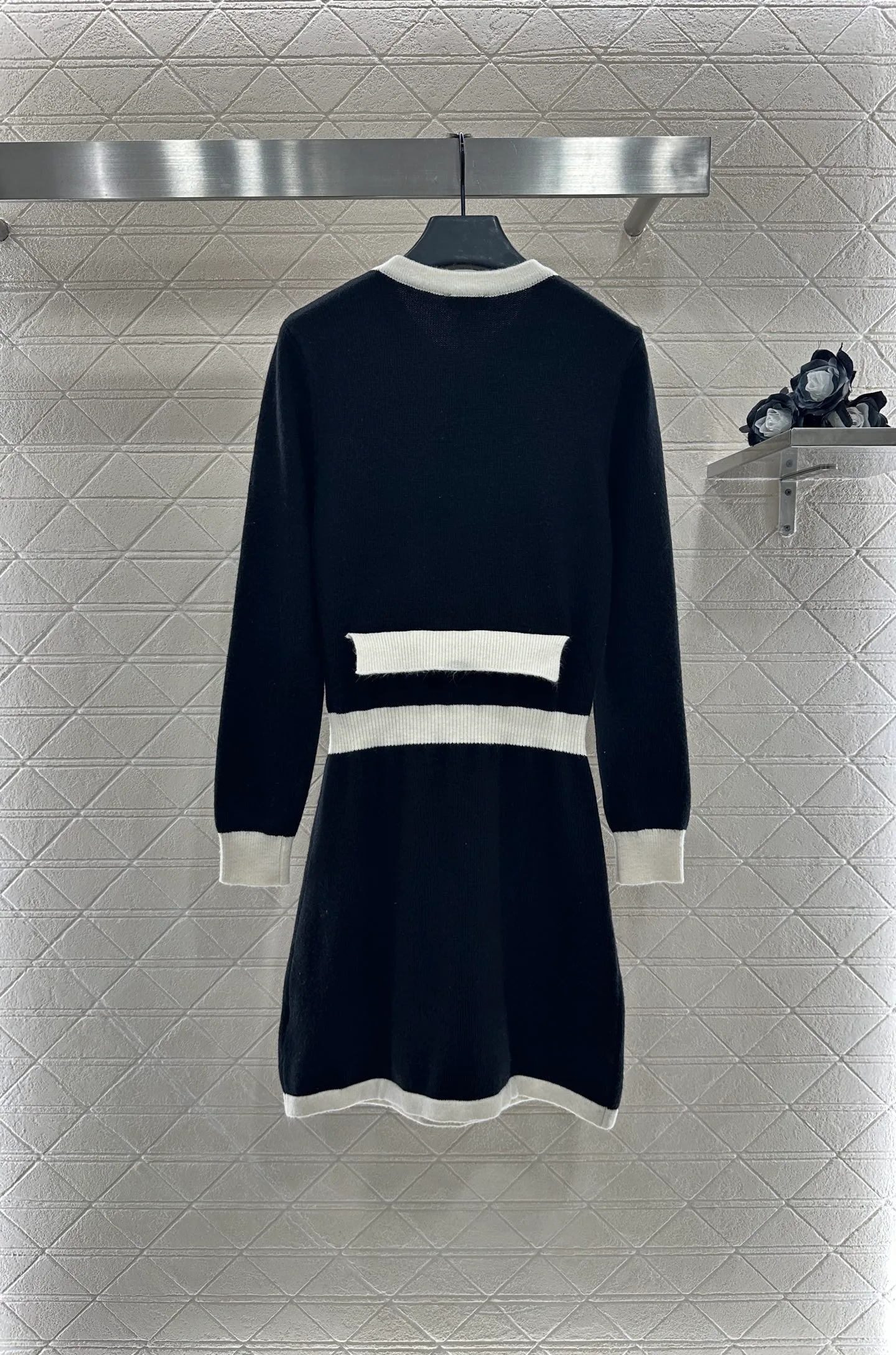 Изделие оформлено симметричными карманами и контрастной цветовой блокировкой в черно-белой гамме. Воротниковые пуговицы с гравировкой двойной буквы C подчеркивают стиль бренда. Данное платье предлагает сдержанную ретро-элегантность с современным акцентом, отлично подходит для различных мероприятий.