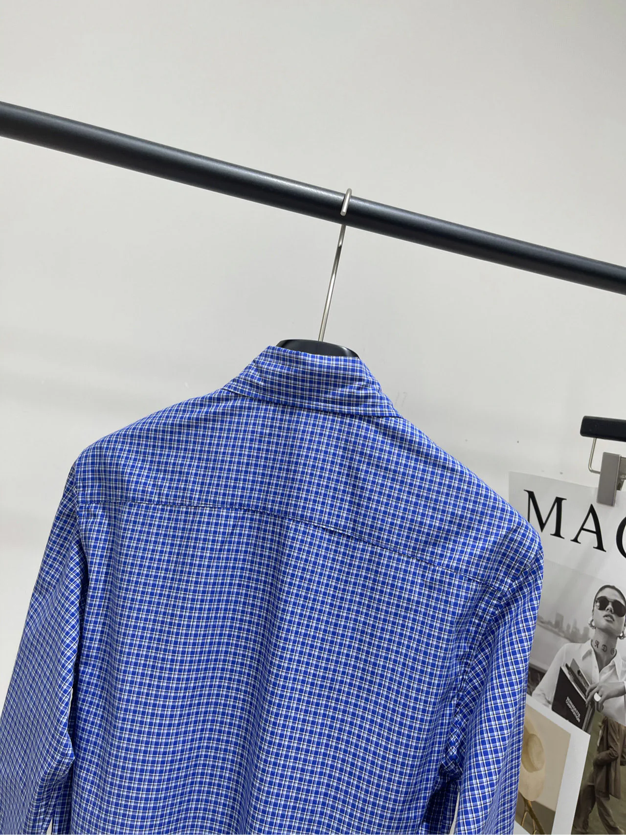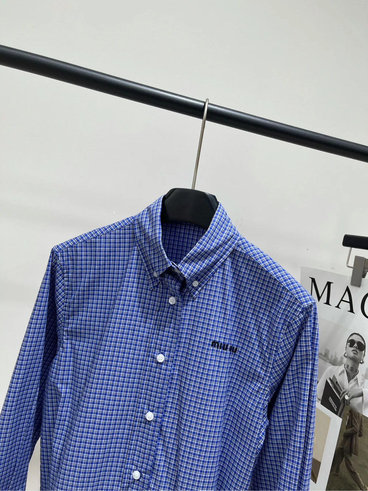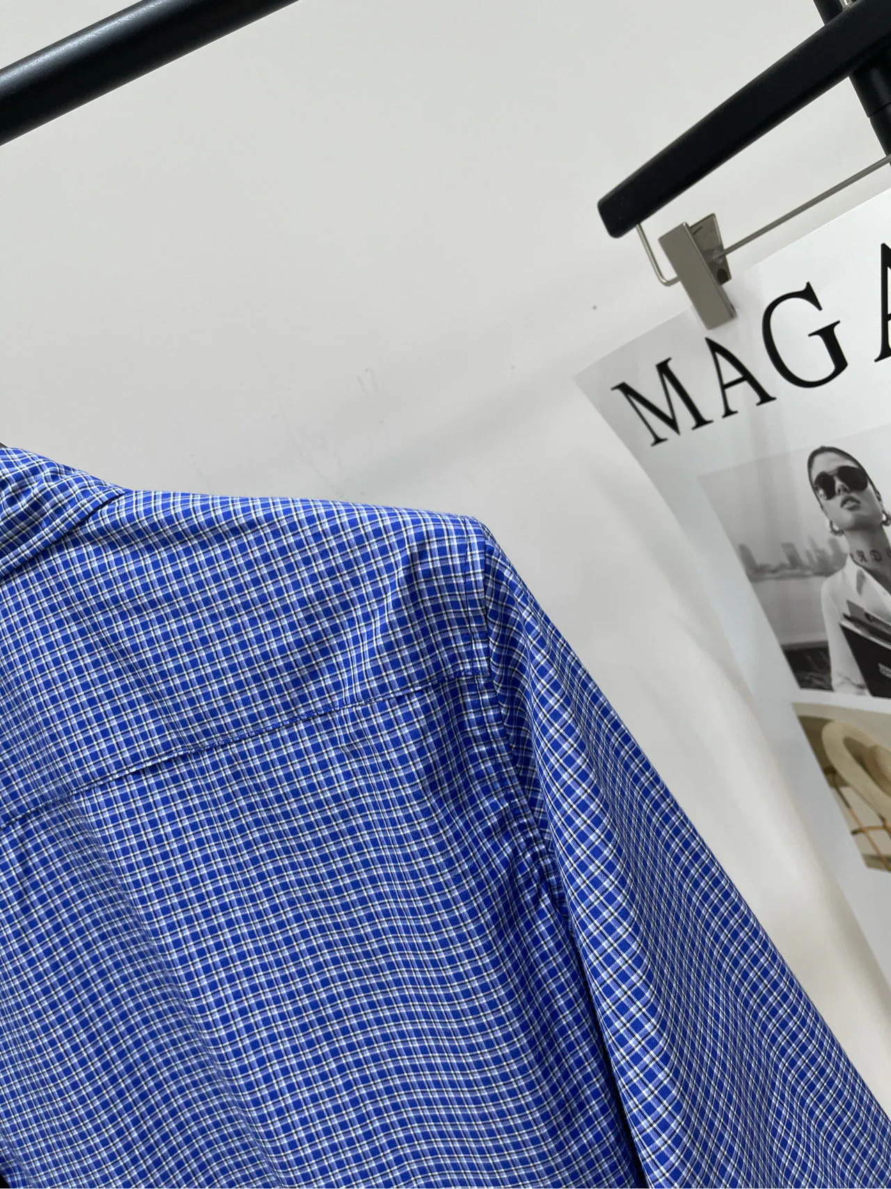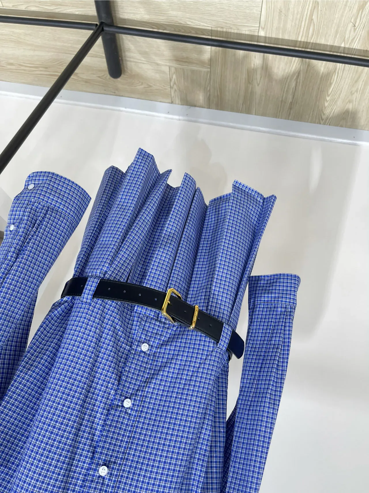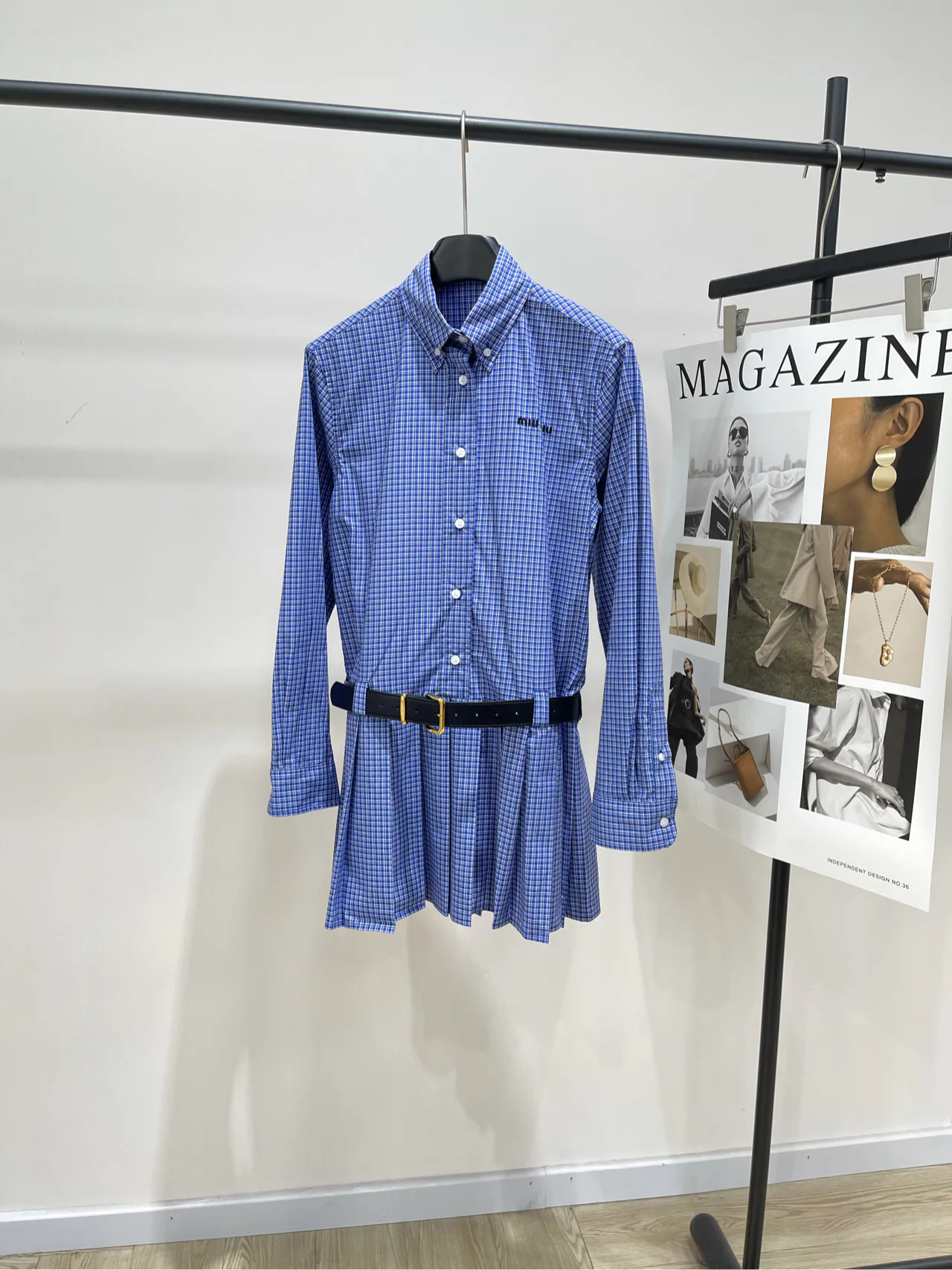 Ключевые особенности: ткань 100% хлопок, натуральный и приятный к телу; цвет — сине-черная клетка; дизайн воротник-рубашка с пуговичной застёжкой; крой — лаконичный верх, переходящий в плисированную юбку, акцент на талии; пояс — черный с золотой фурнитурой, подчёркивает талию и добавляет винтаж; стиль — аккуратная рубашечная посадка и юбочная часть, подходит для повседневной носки и романтических образов; выпуск — премиум-уровень, ранняя осень.
